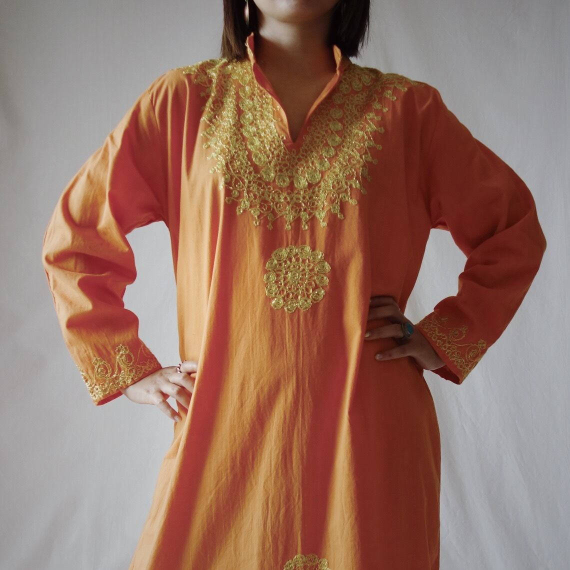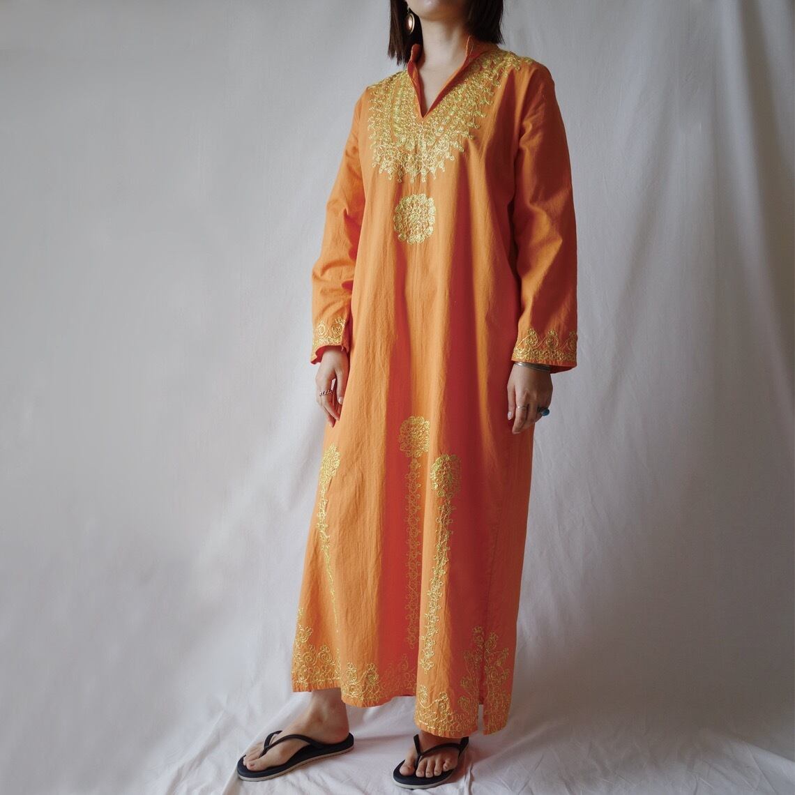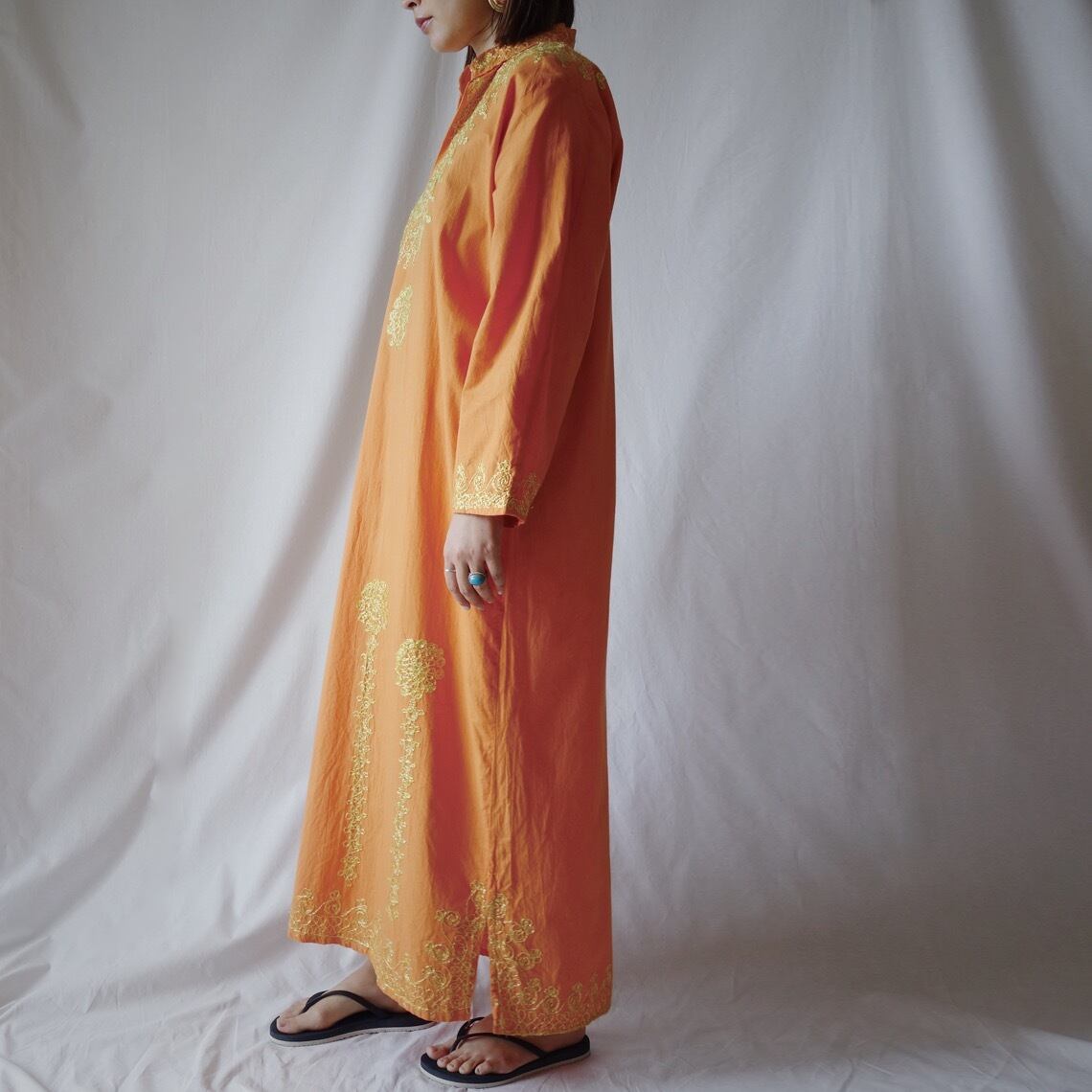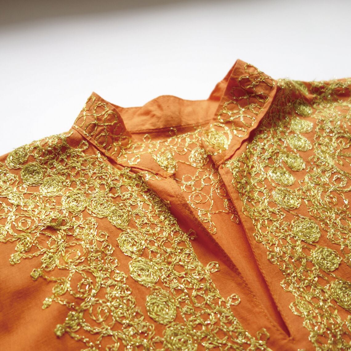 くすんだオレンジカラーにゴールドの刺繍が美しいワンピース。