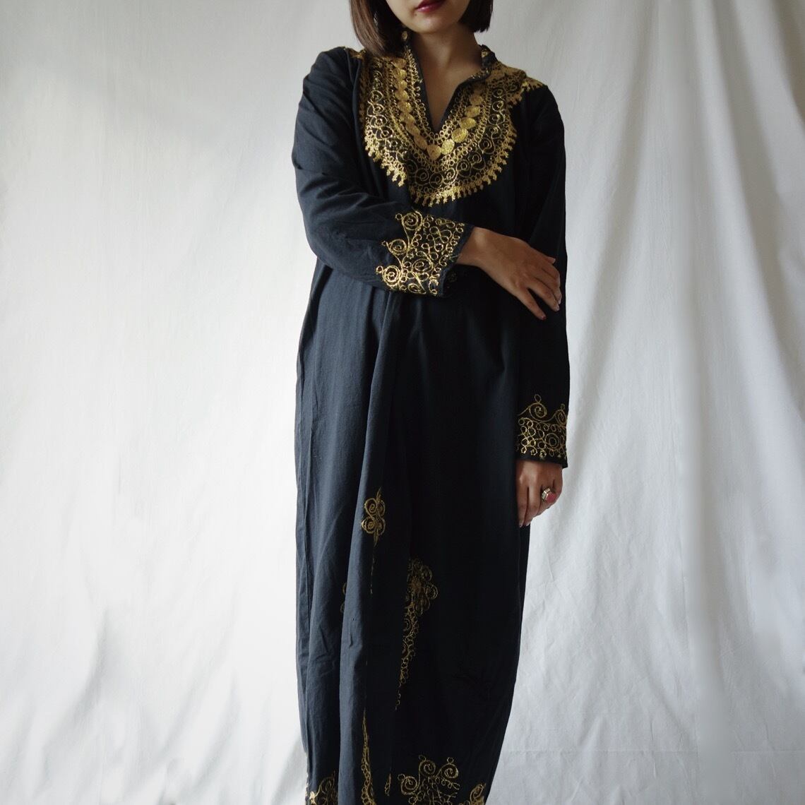 黒のコットン生地にゴールドの刺繍が美しいワンピース。