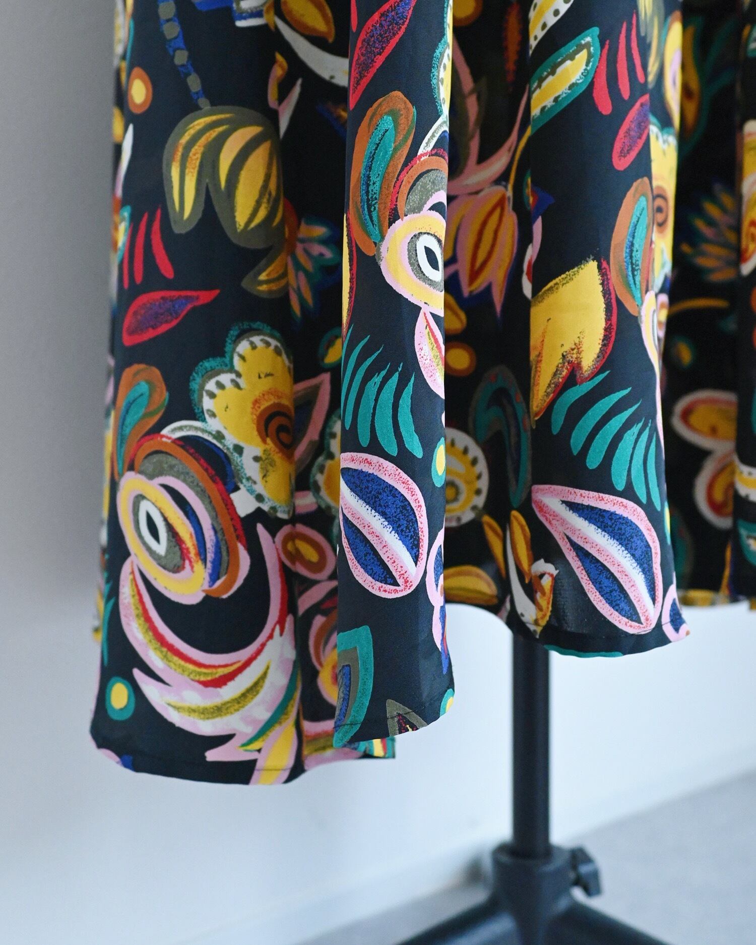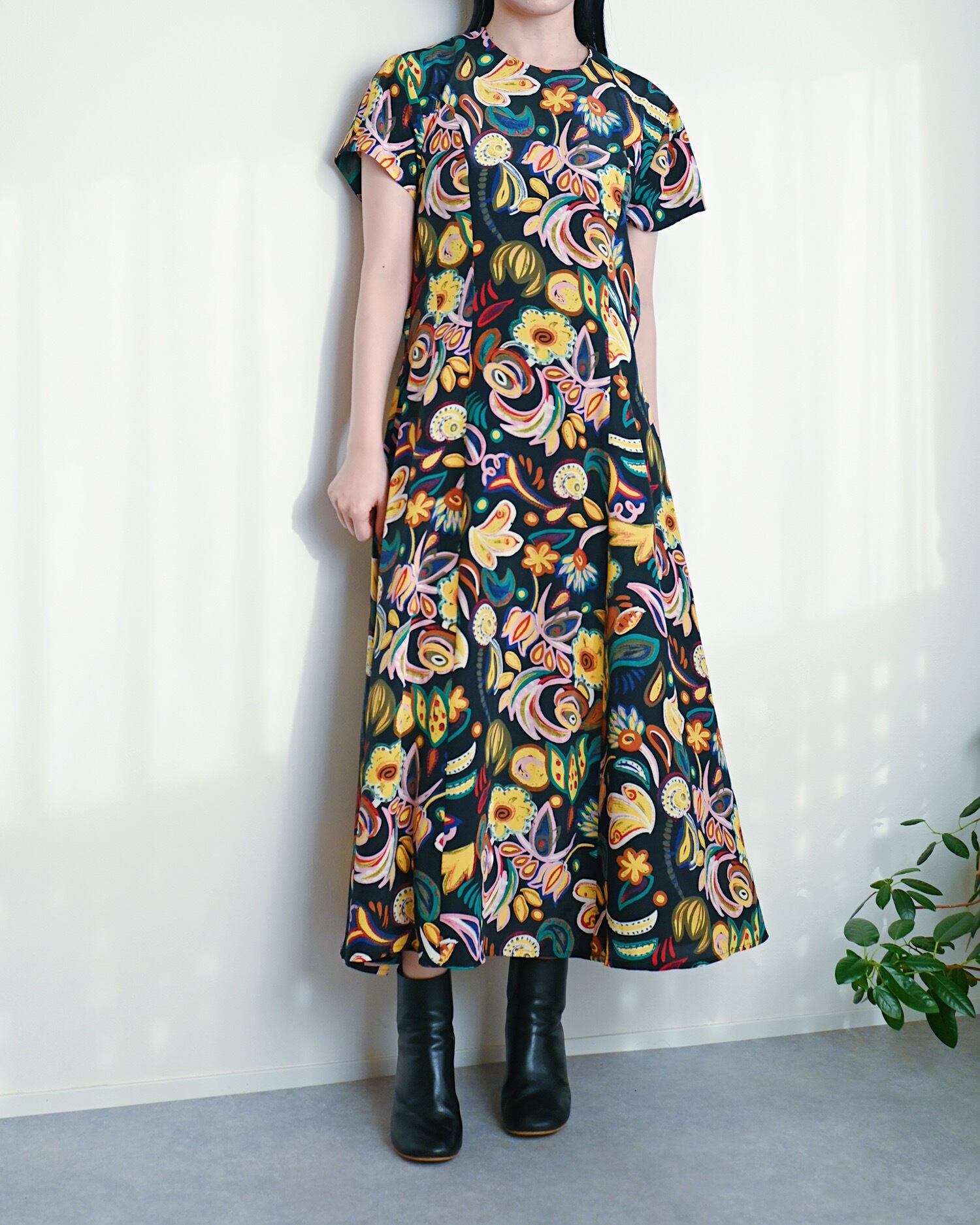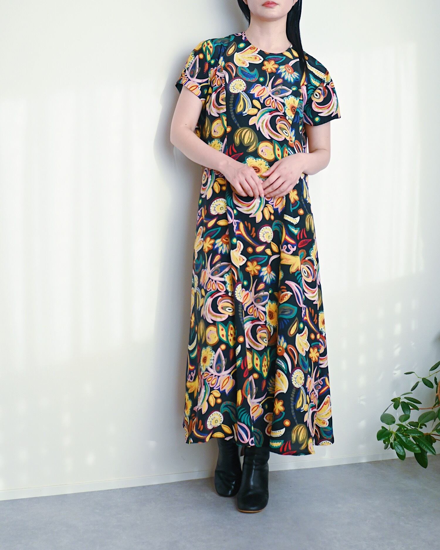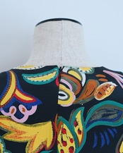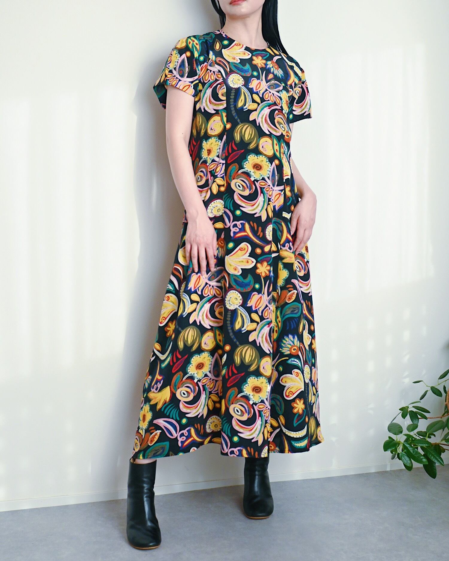 ブラックベースにカラフルな花柄が可愛いワンピースです。まるでアートのような大胆な花柄です。