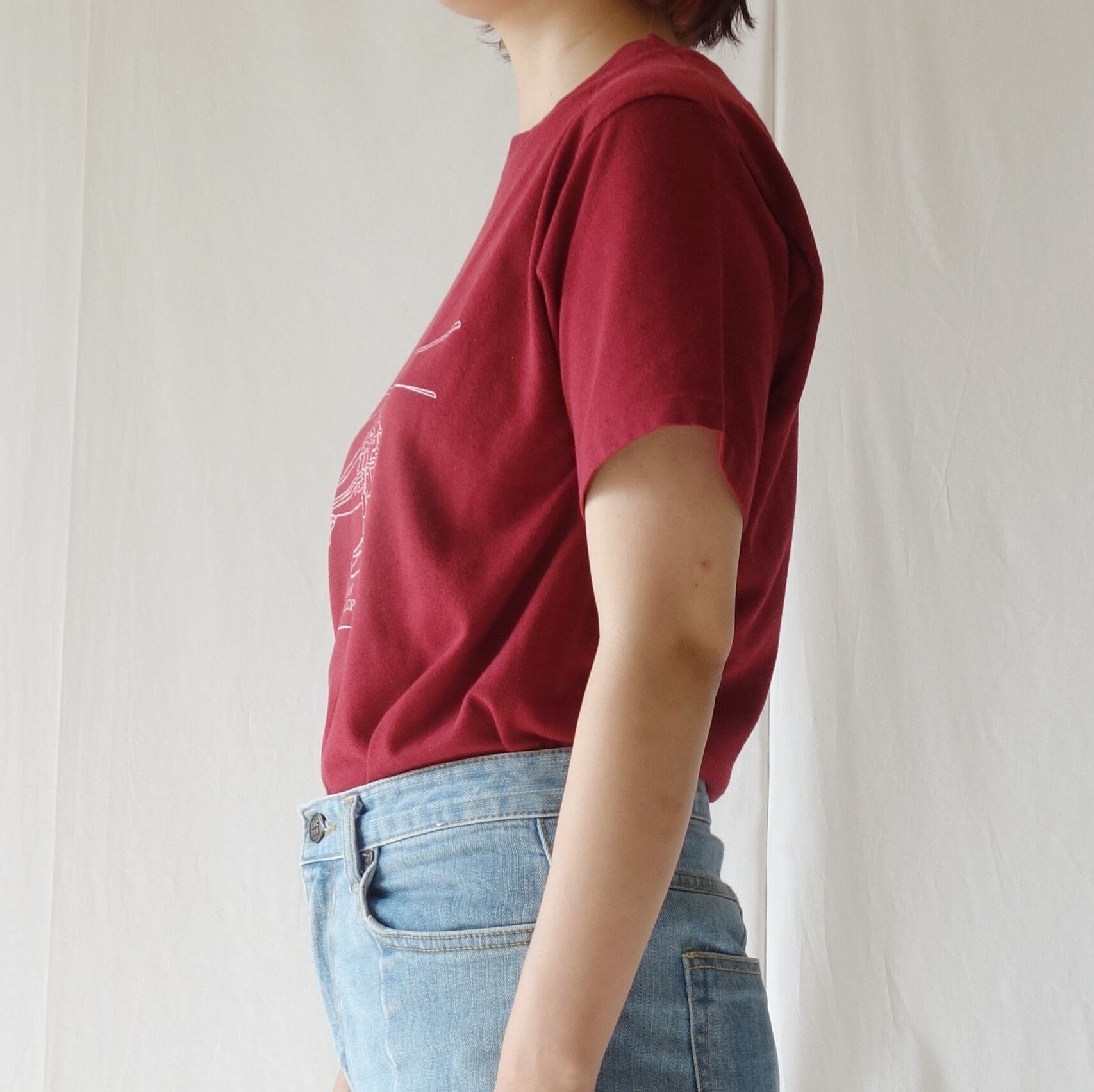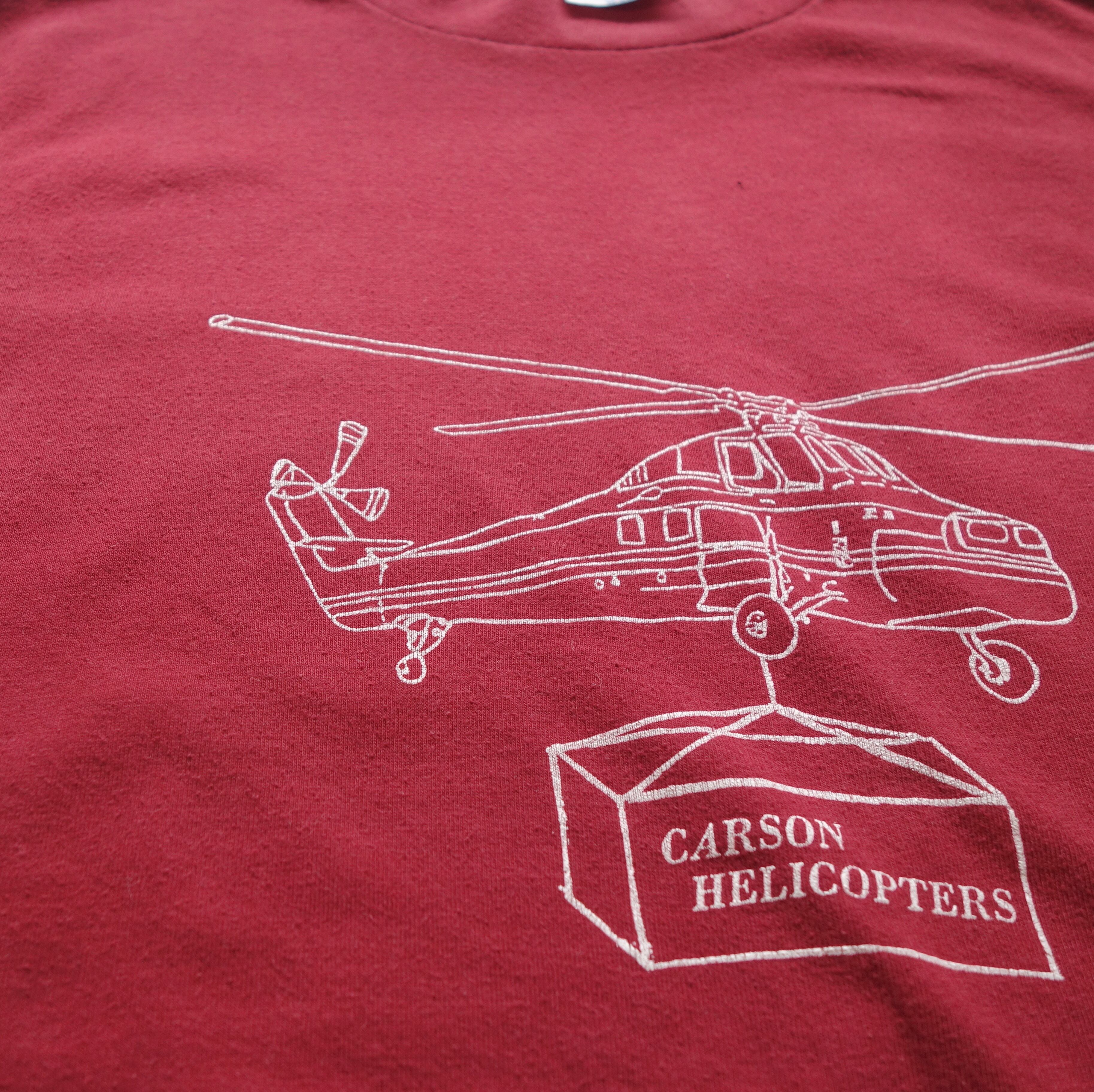 ダークレッドのボディにヘリコプターのプリントがユニークなTシャツ。
