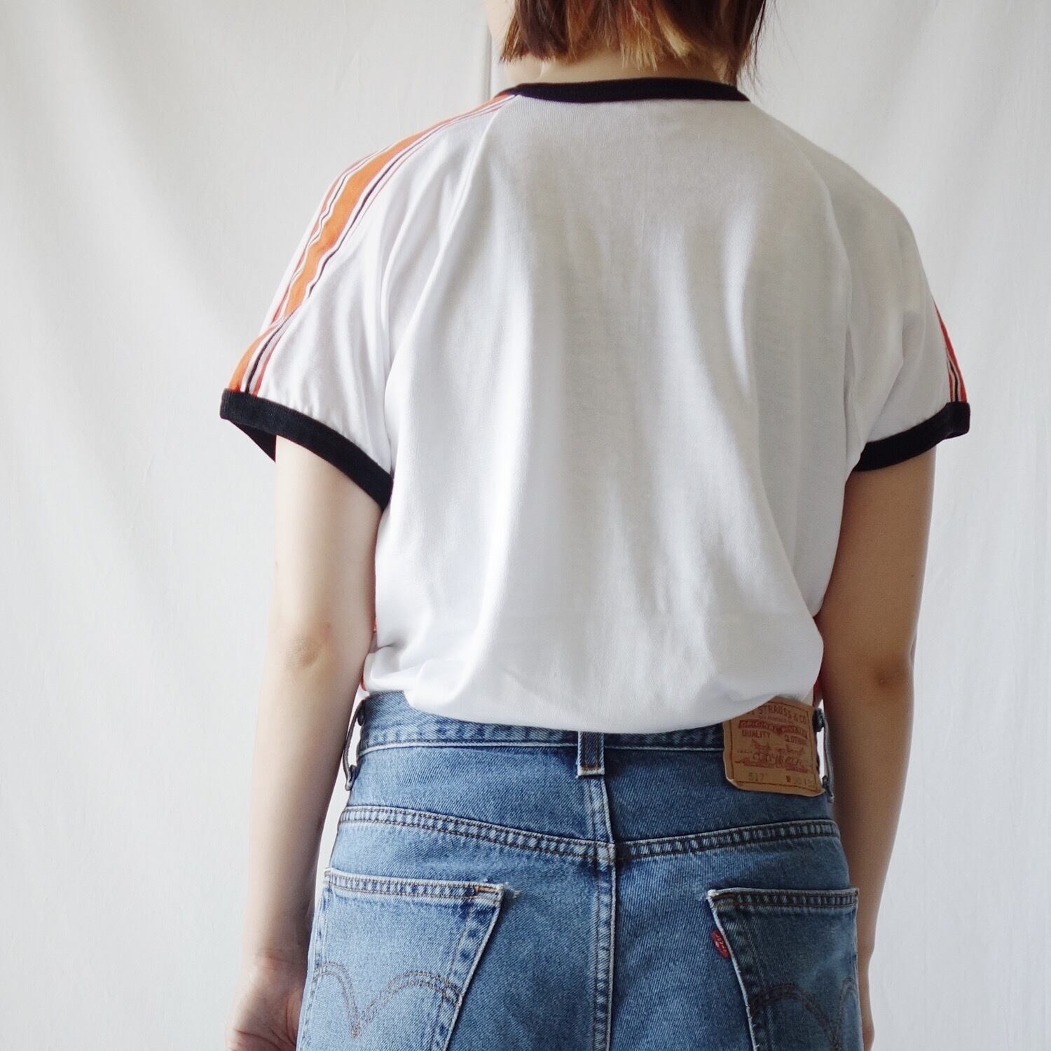 袖と両脇にオレンジのテープが可愛い、スポーティなTシャツ。
