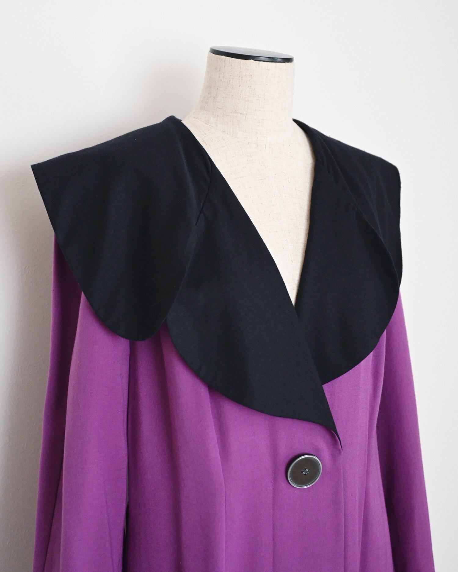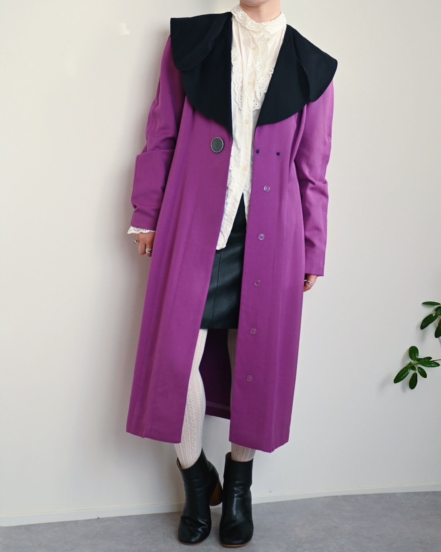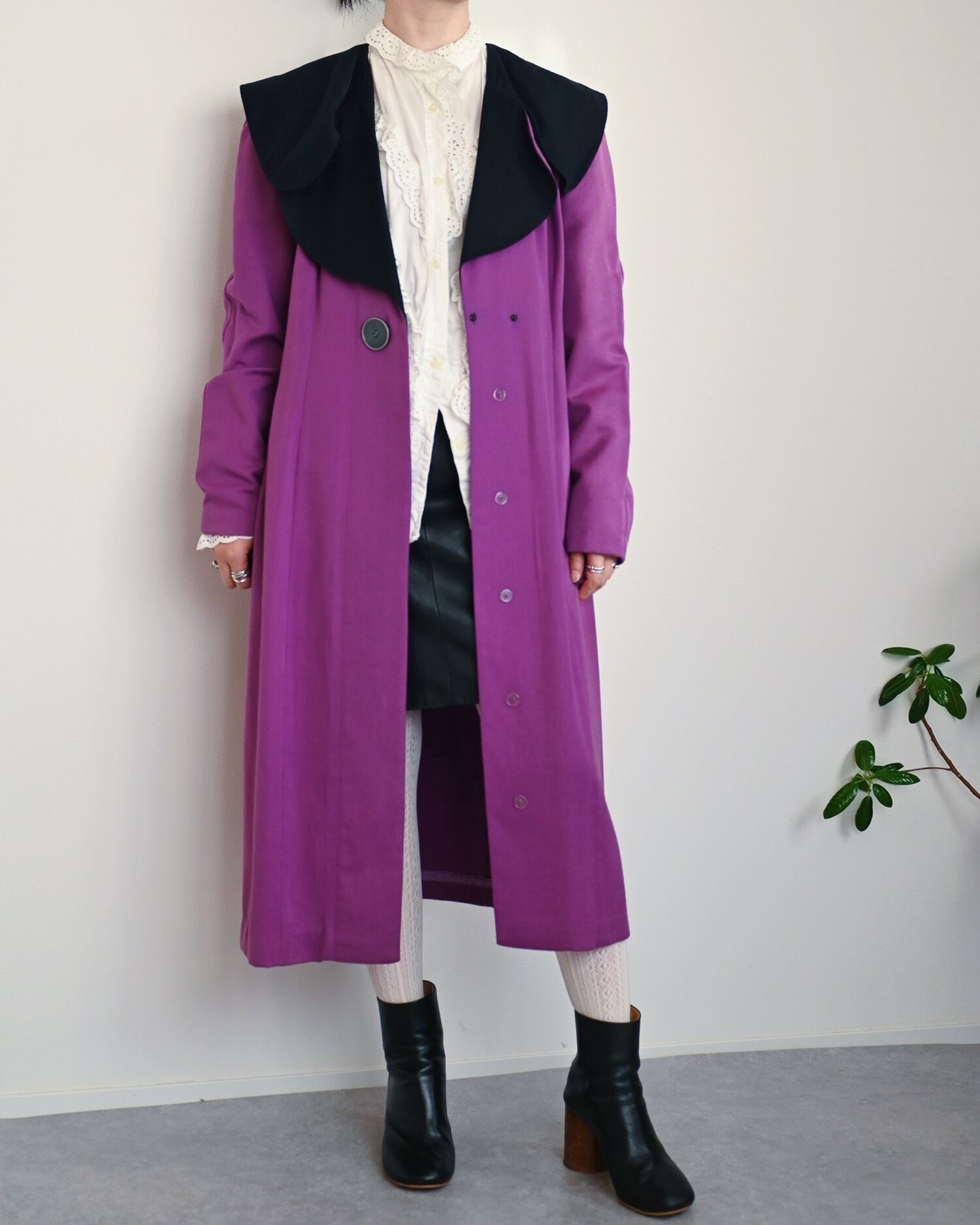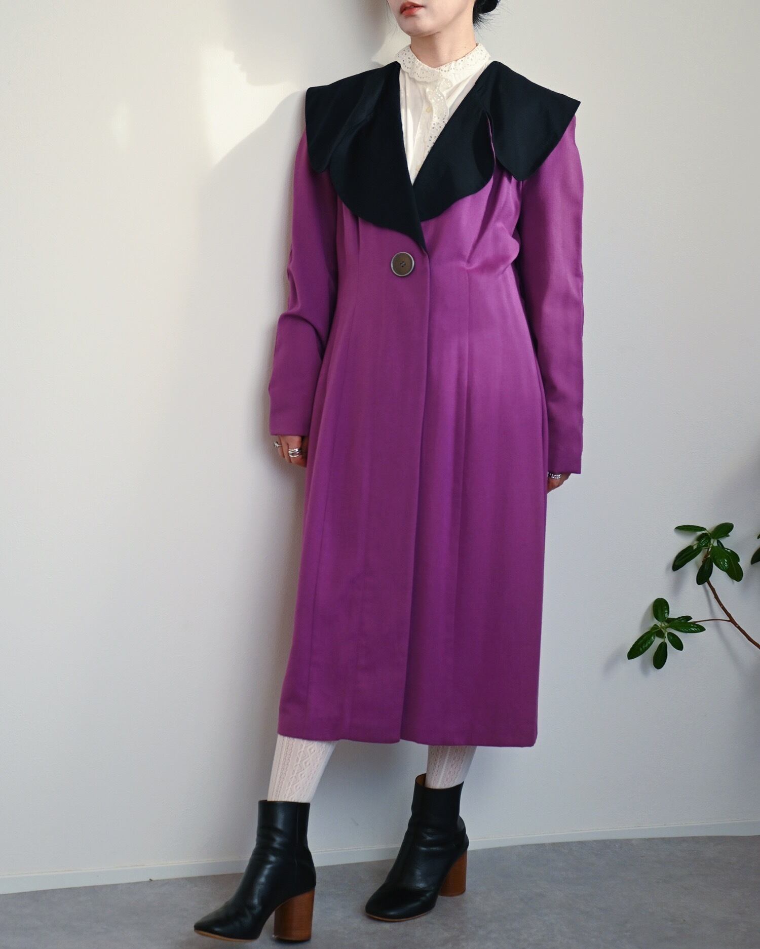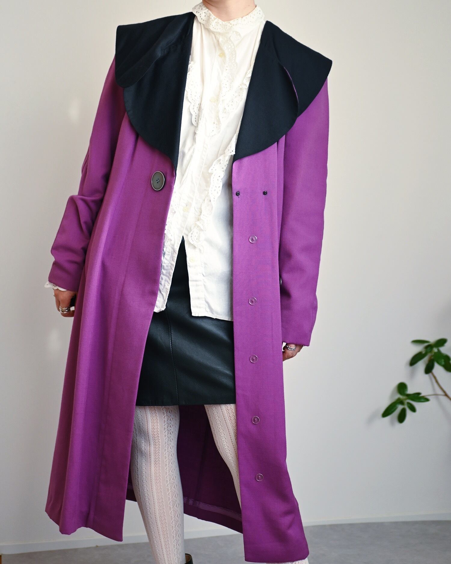 上品な美しい色に見惚れる一枚です。裏地がついていないので、春や秋におすすめなコートになります。