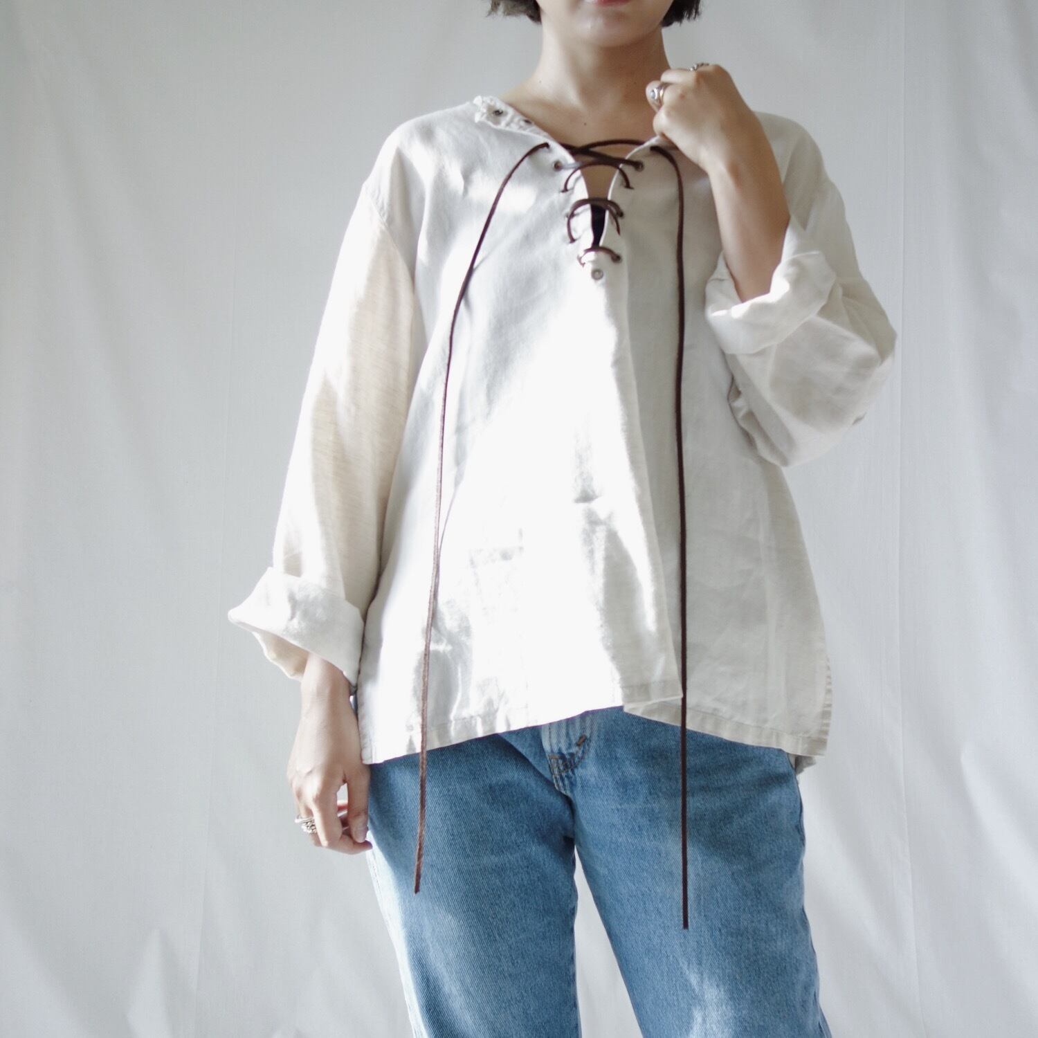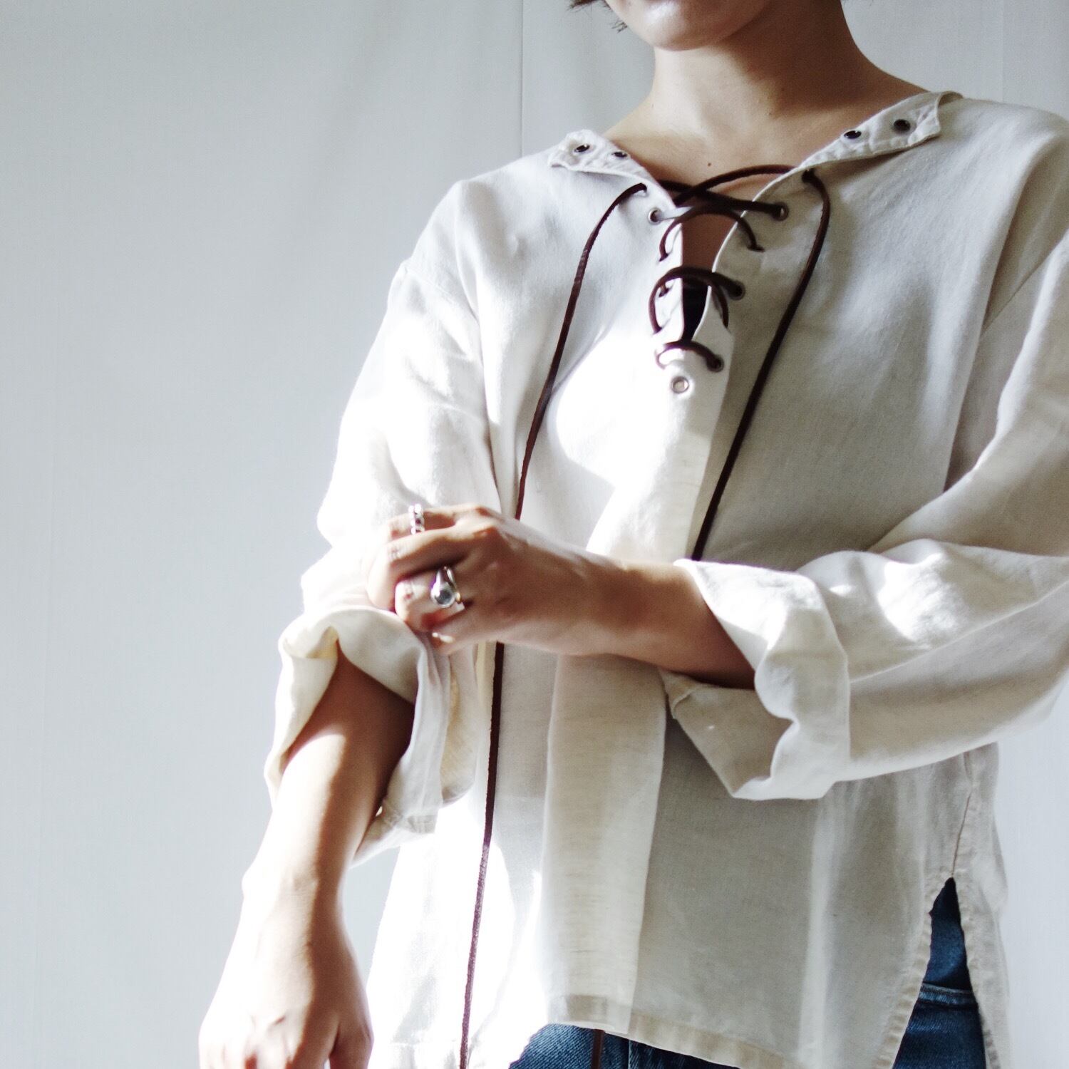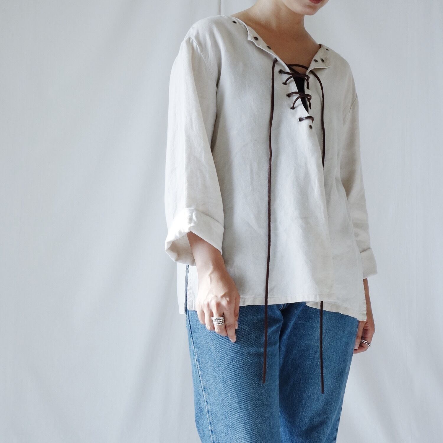 胸元のレザードローストリングがポイントのリネンシャツ。