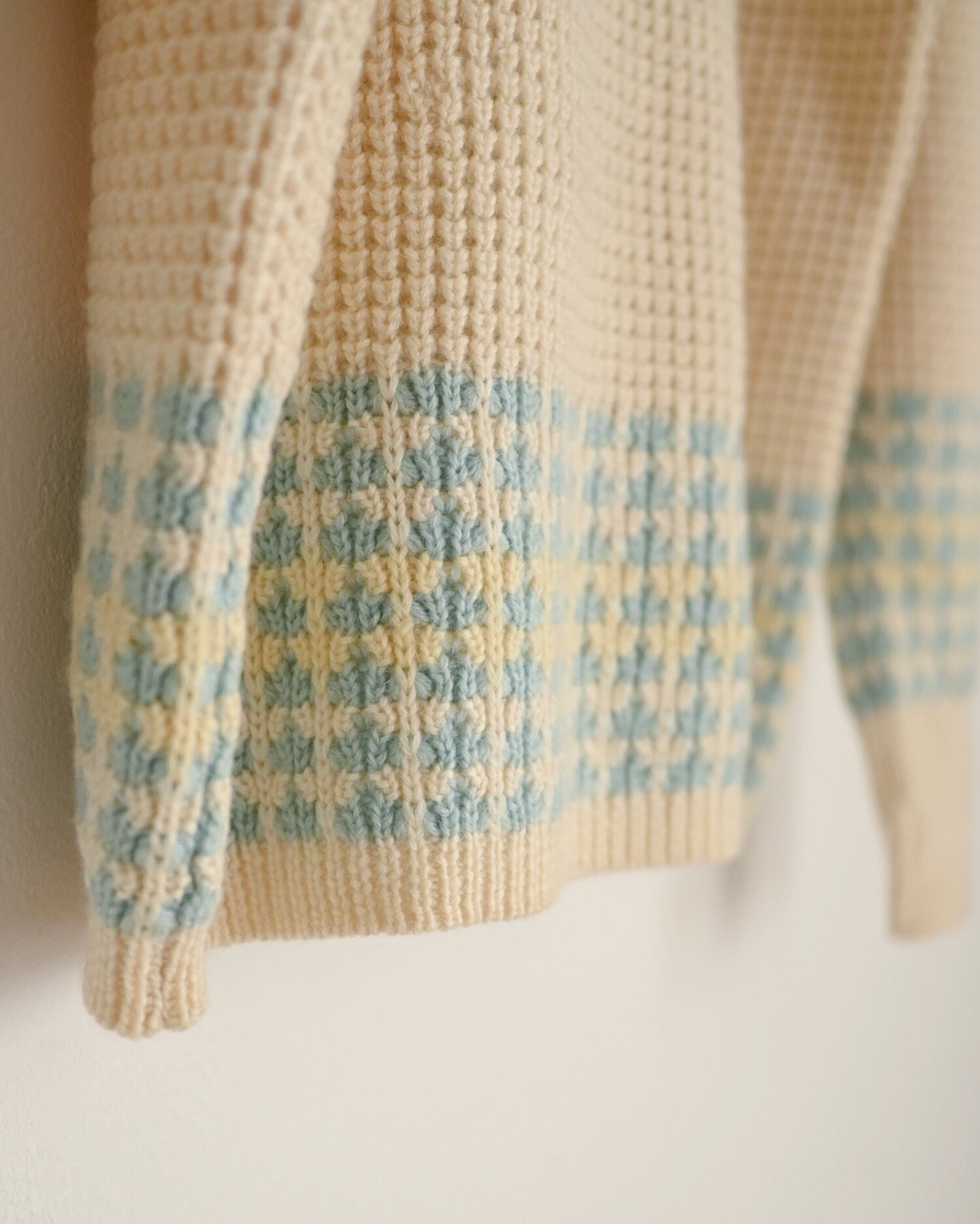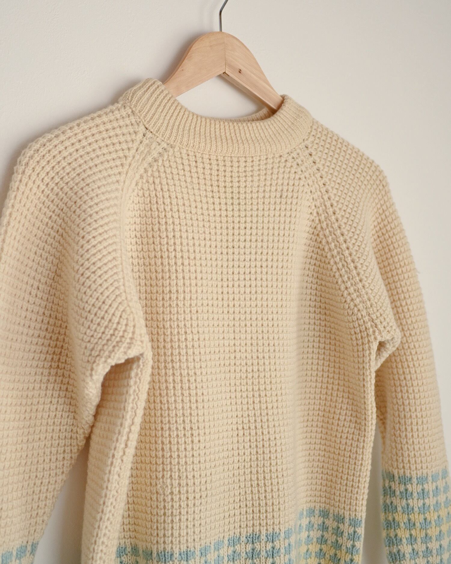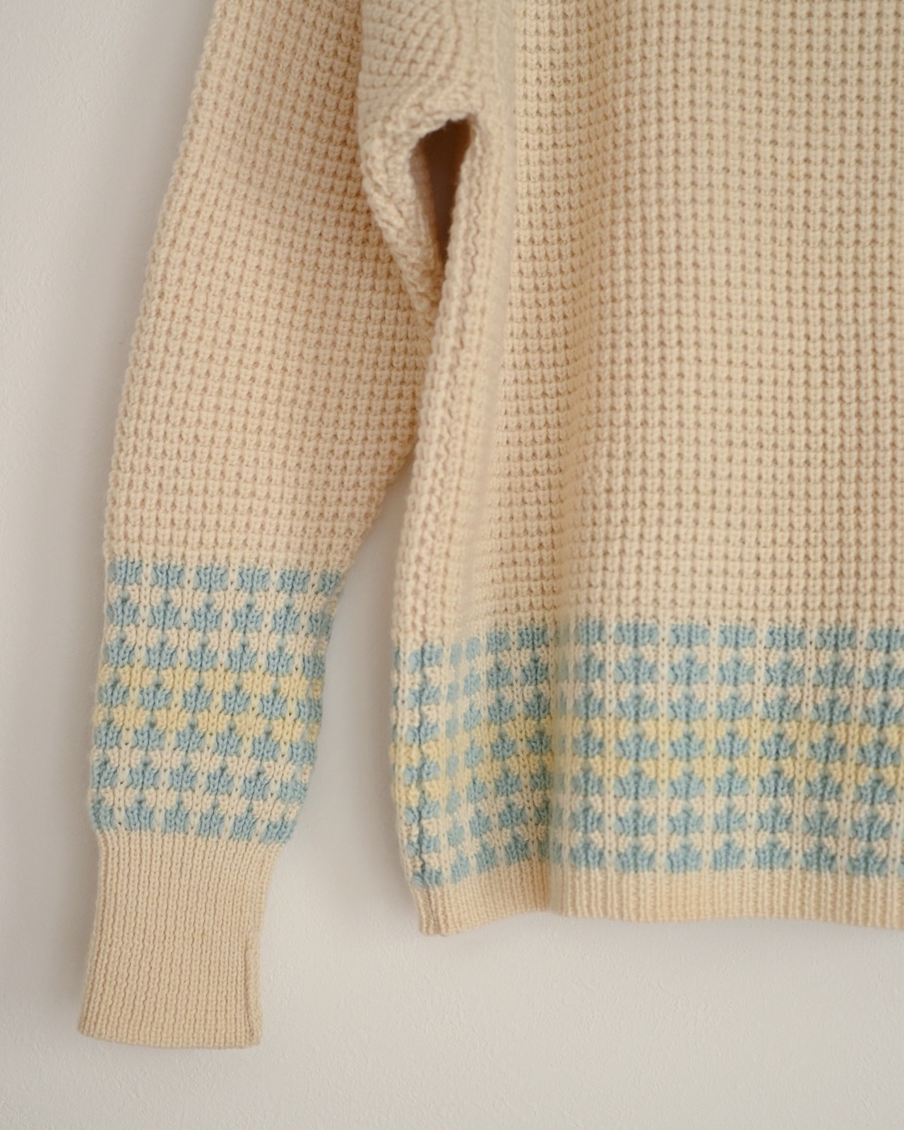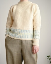 優しいアイボリーカラーの60-70'sニットプルオーバー。ポコポコした編み地と、裾のパステルブルーの柄がデザインポイント。