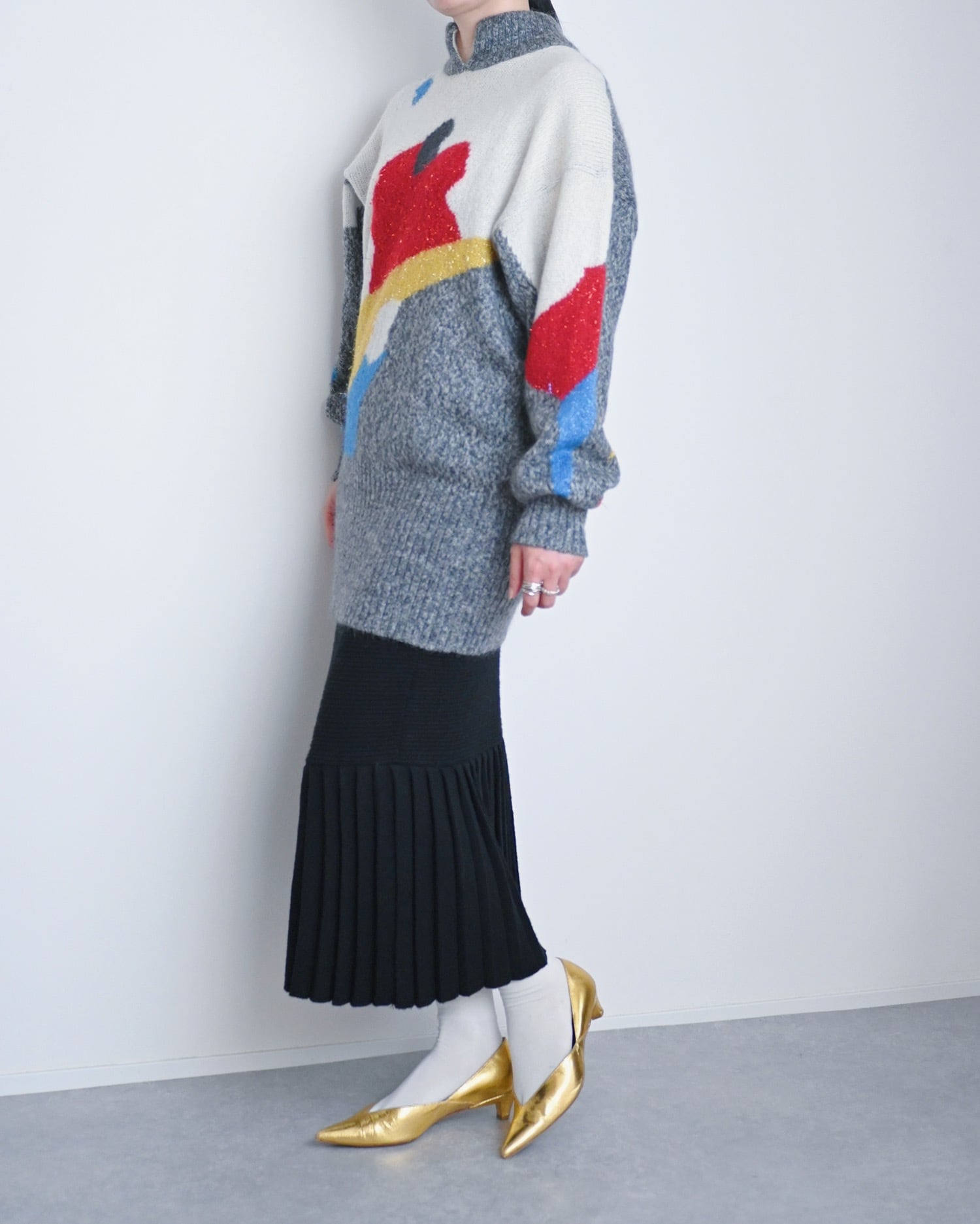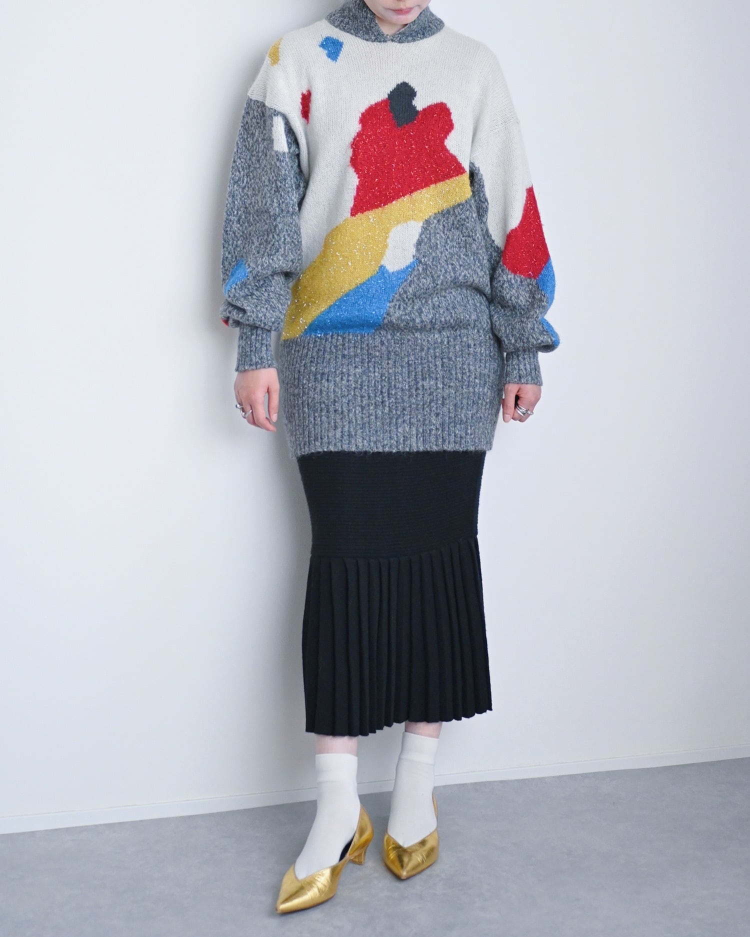 抽象的な模様が可愛いニットプルオーバー。カラフルな部分はラメ糸になっています。