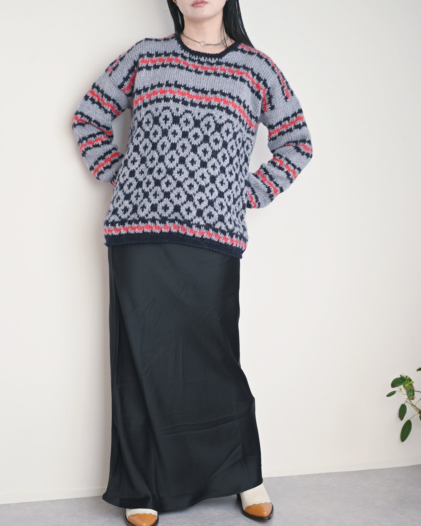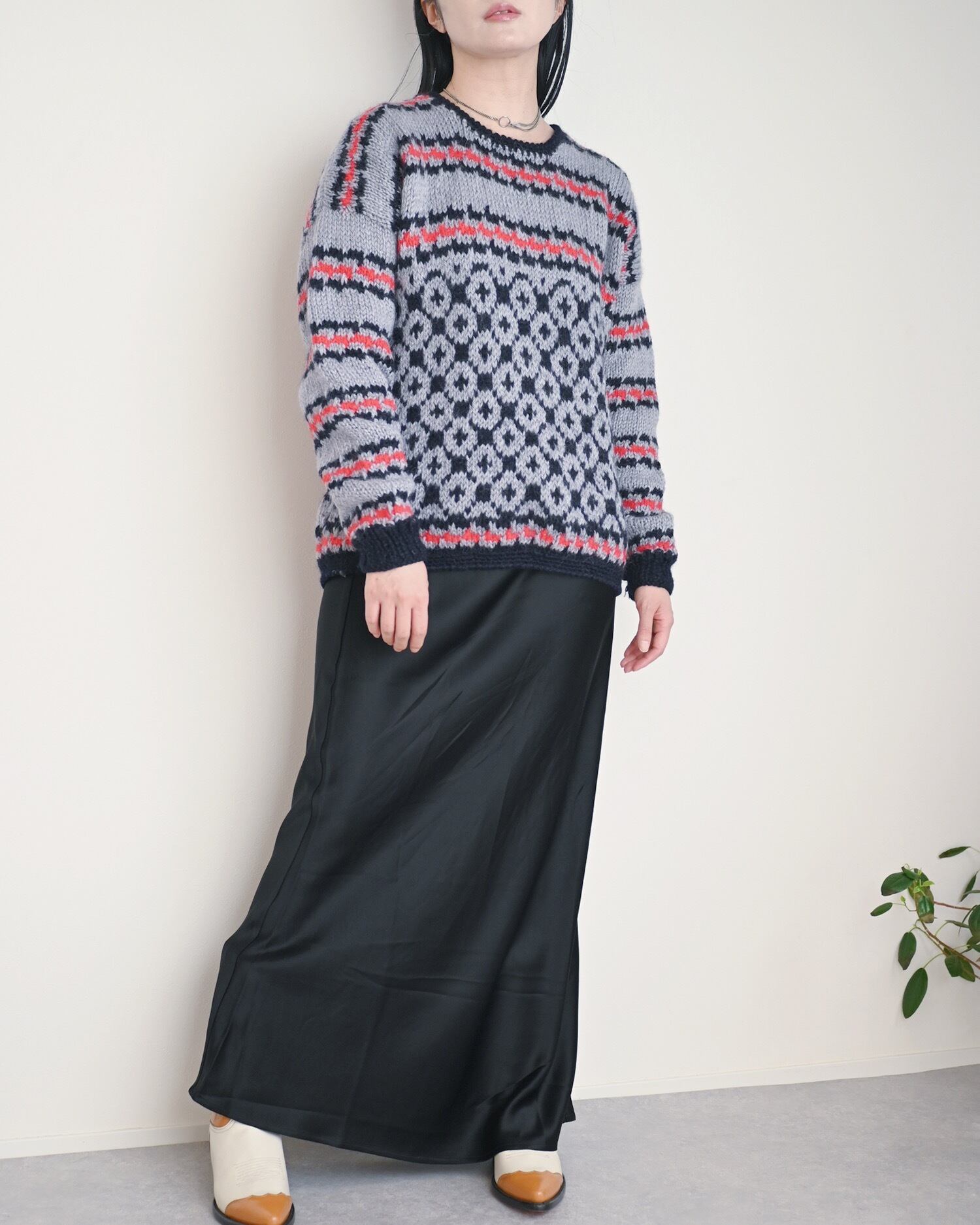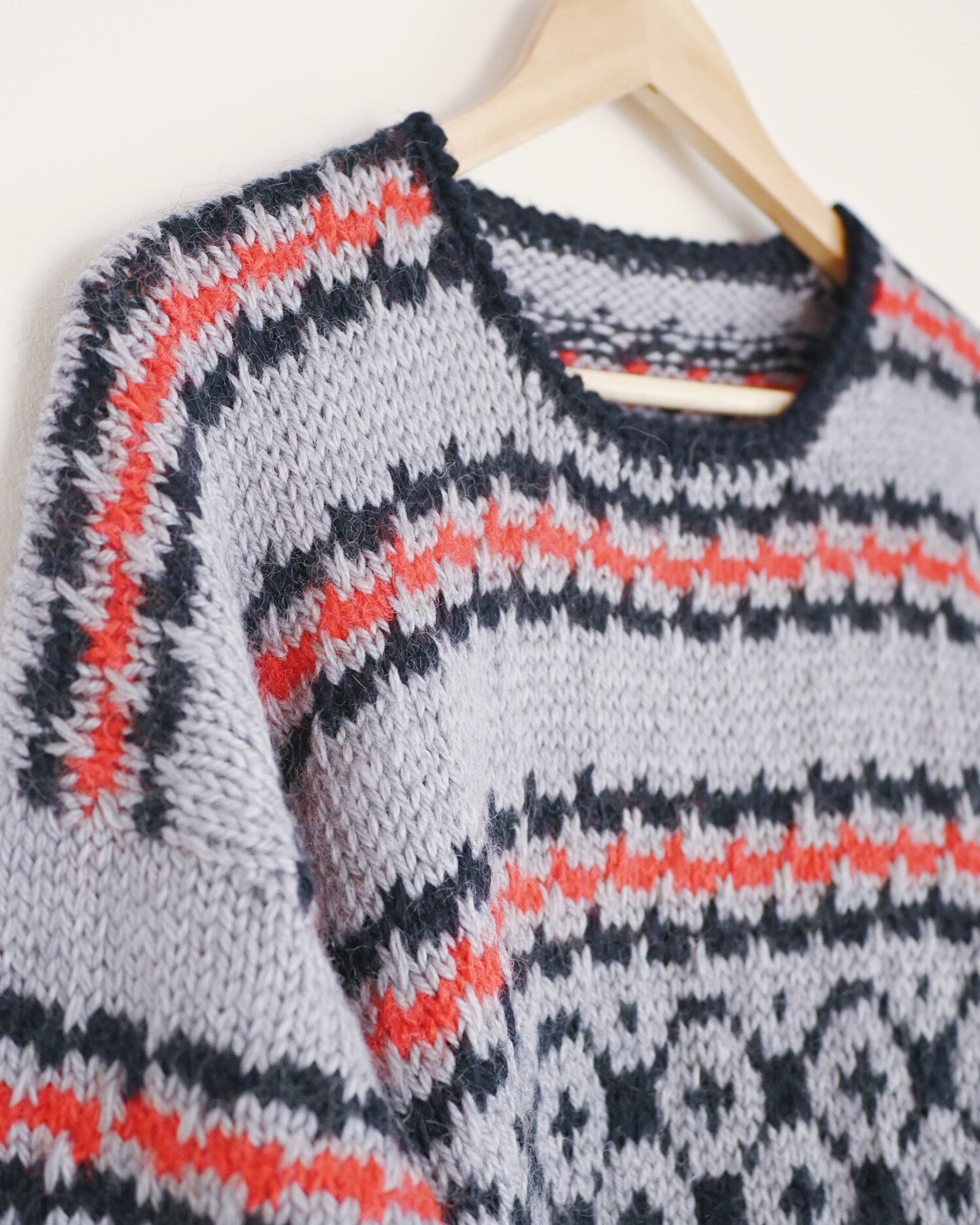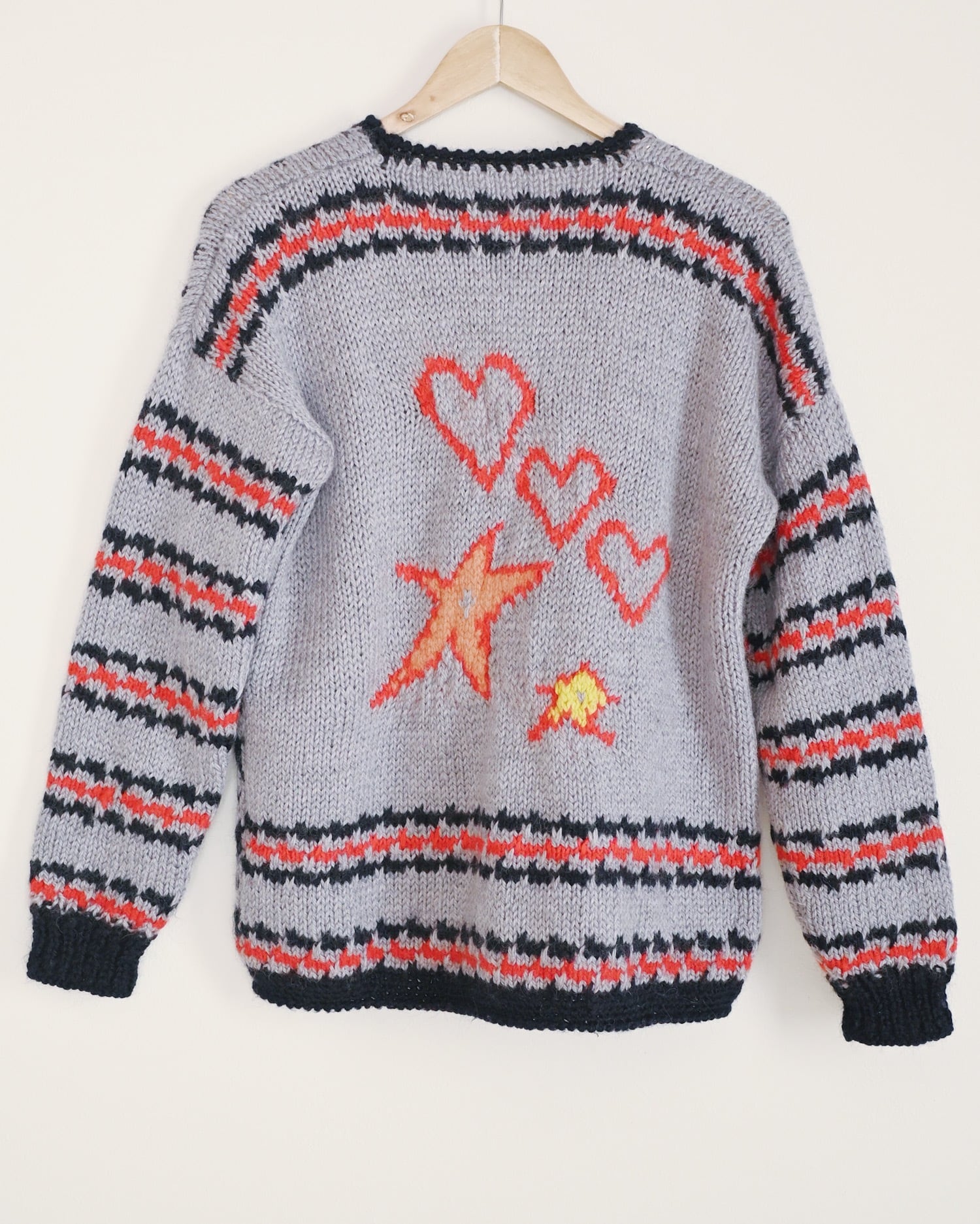 ハートとスターのモチーフが可愛いニットです。全体がグレーカラーなのでポップになりすぎず、着やすいデザインに纏められています。