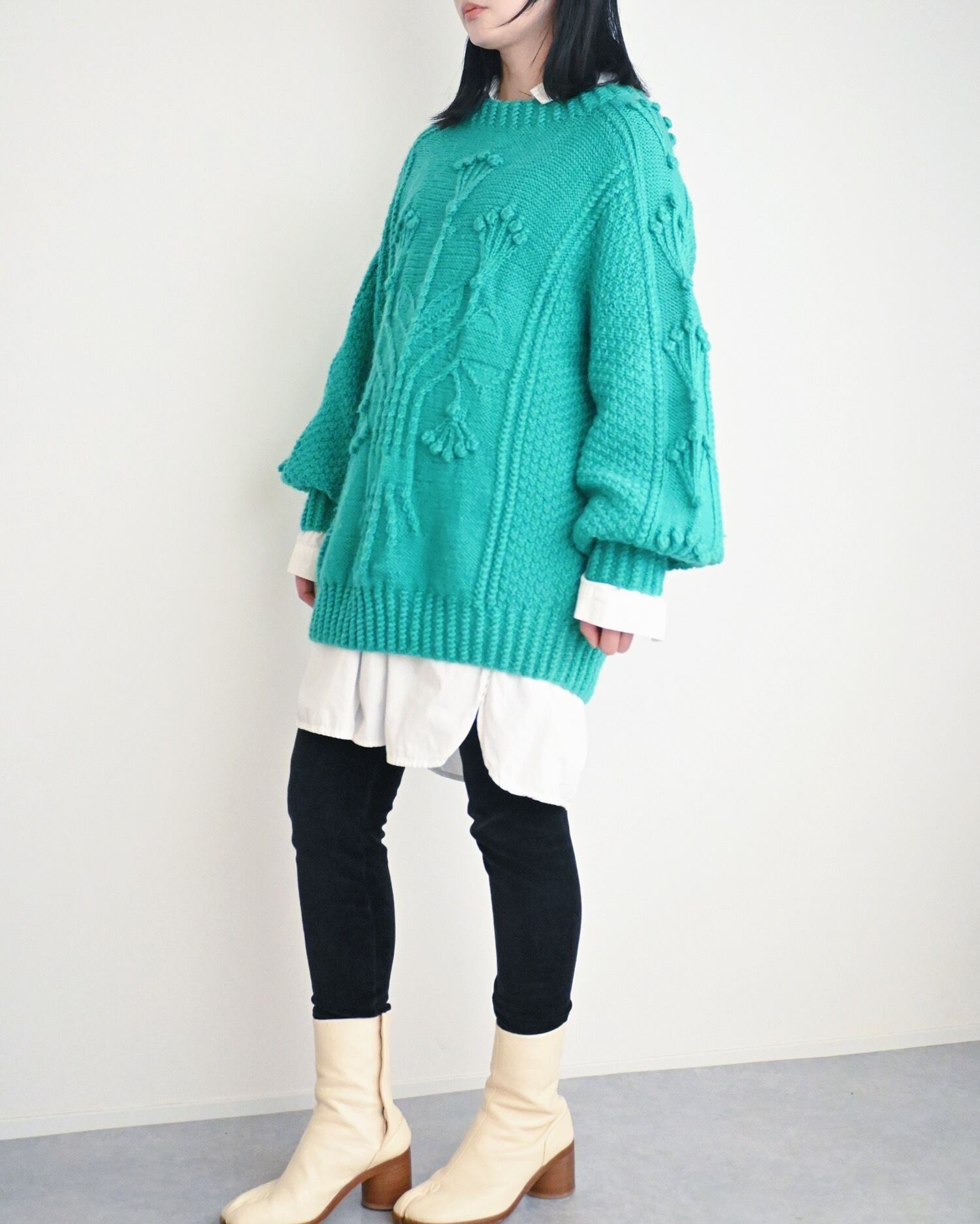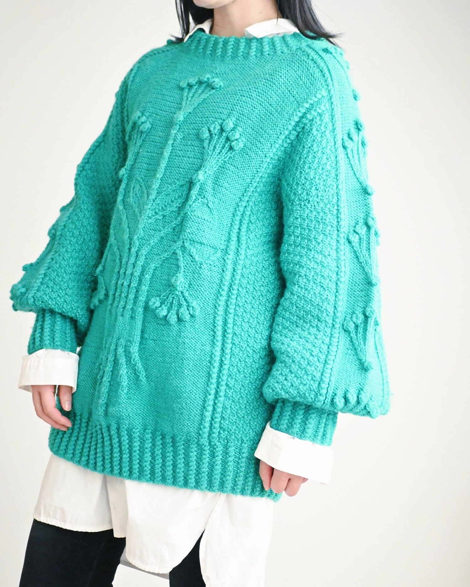 植物モチーフが珍しいアランニット。袖はぽわんとしたシルエットでポコポコした立体的な編み柄が可愛いです。