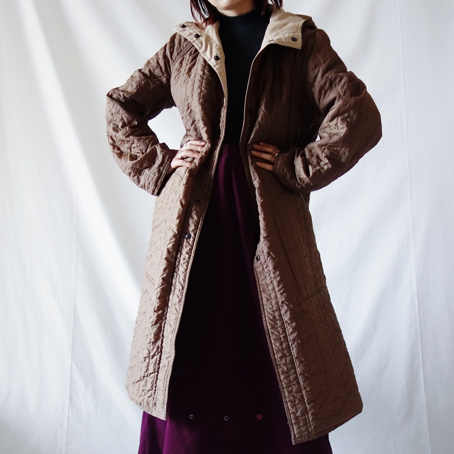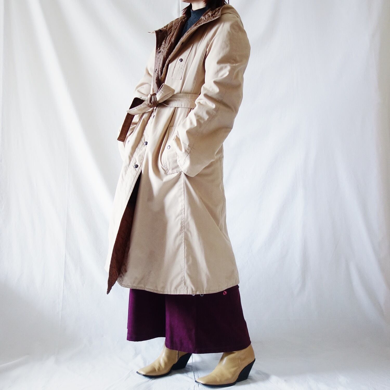 シンプルなベージュの生地とブラウンのキルティング生地のリバーシブル仕様のコート。