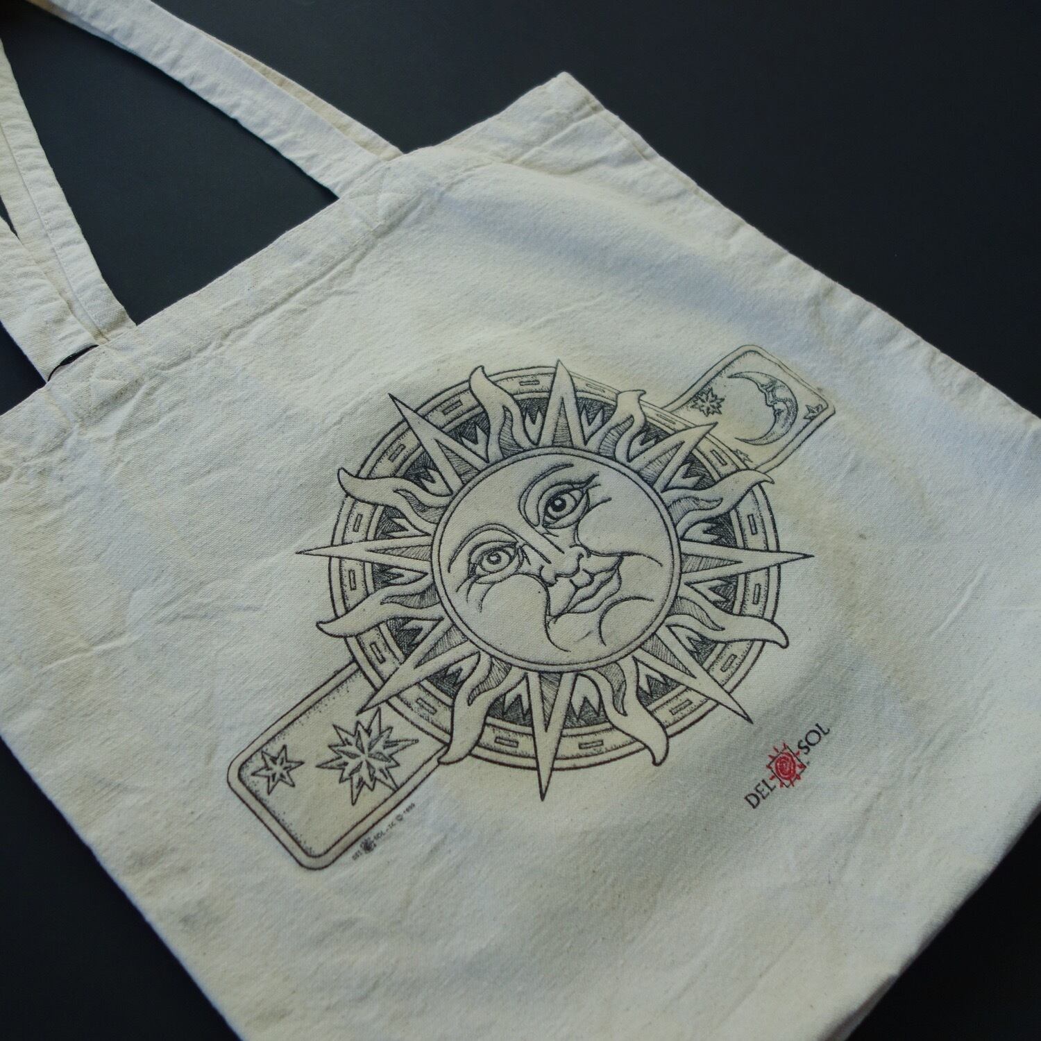 シュールな太陽のイラストがインパクト大なトートバッグ。