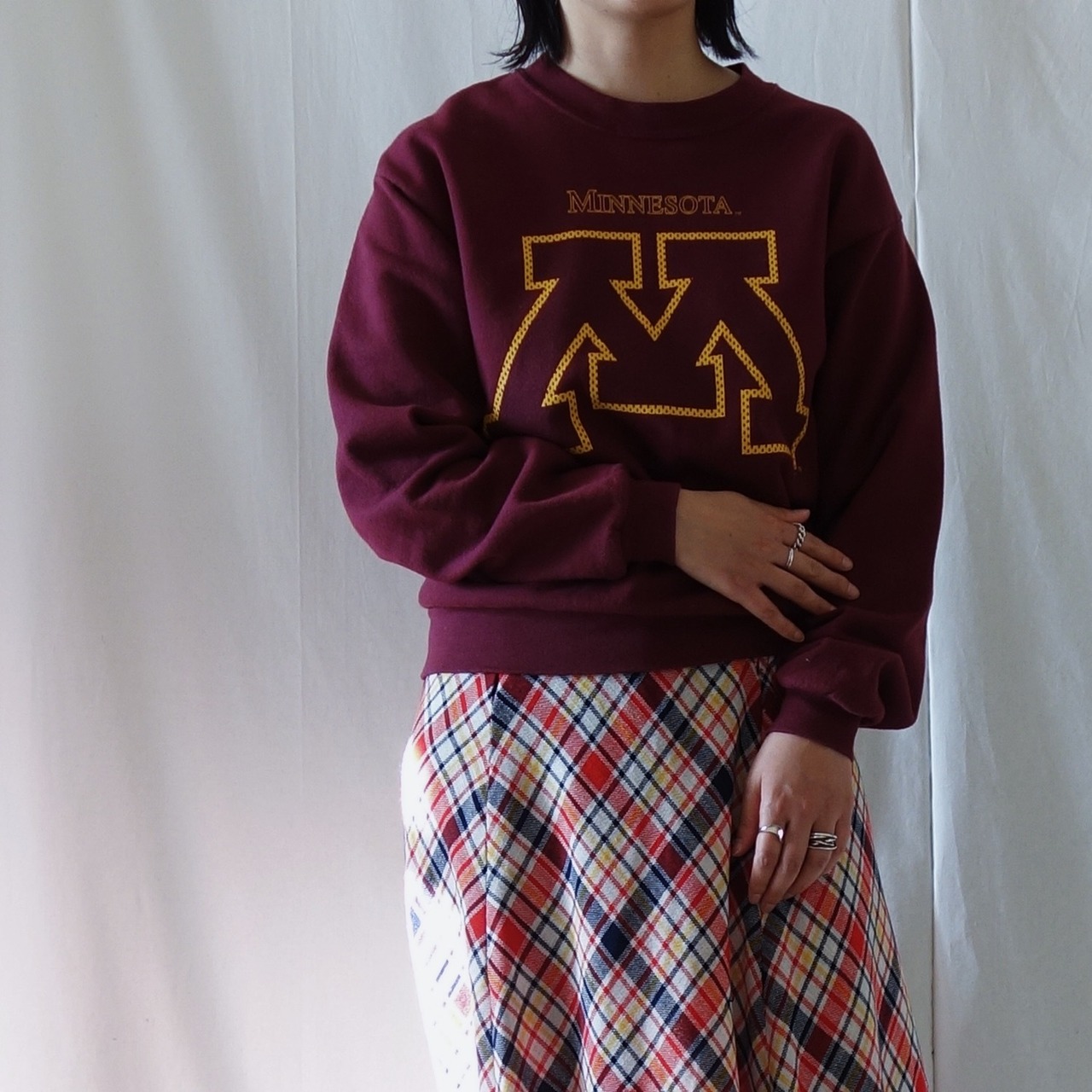 えんじ色のプリントスウェット。