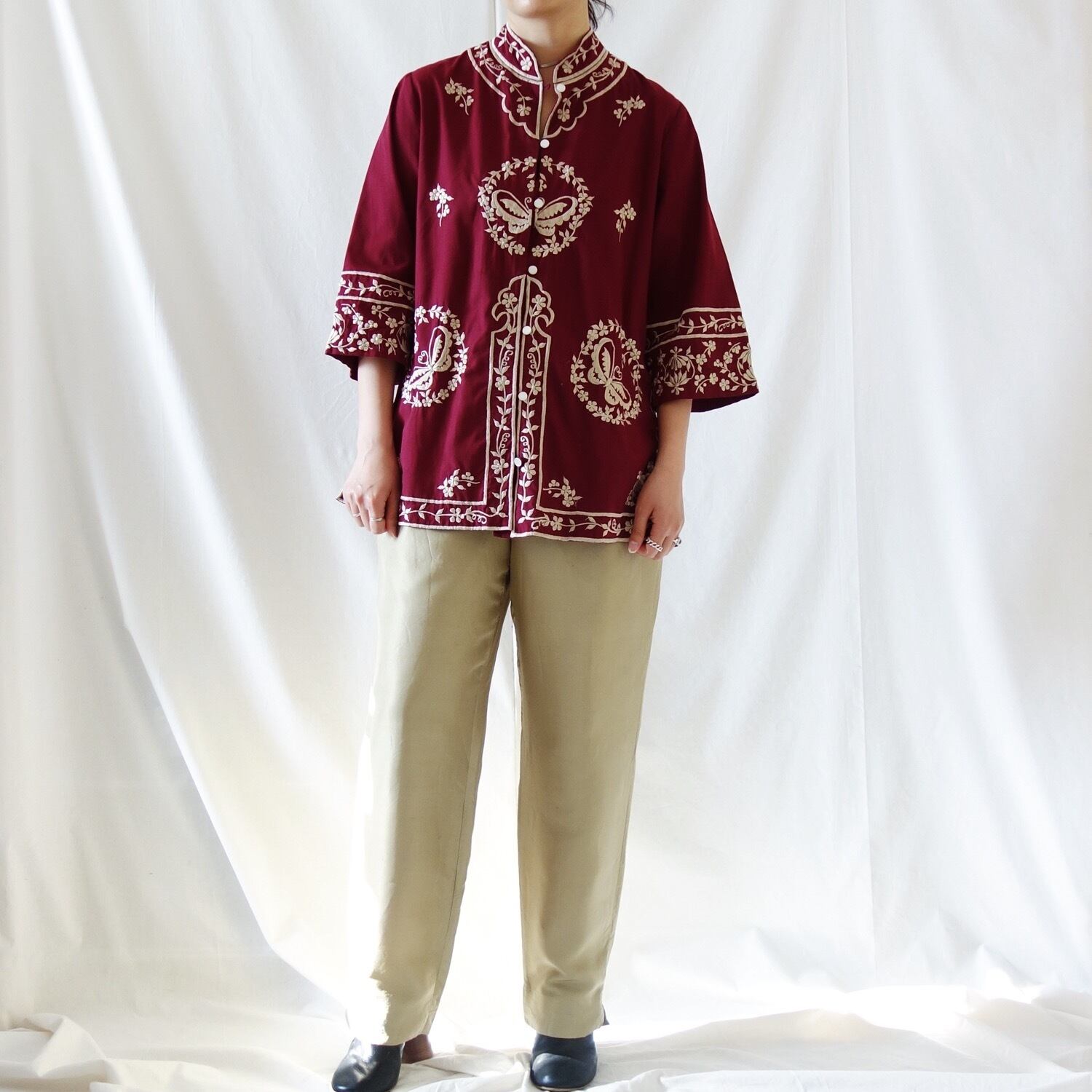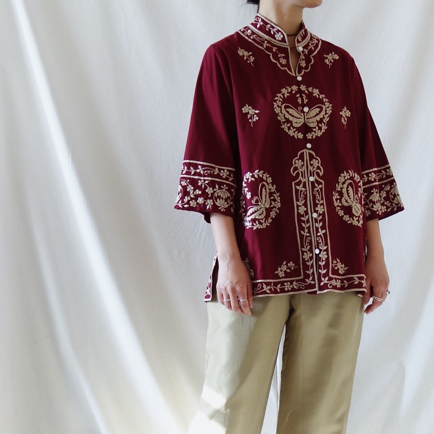 蝶と花の刺繍デザインが美しいチャイナシャツ。