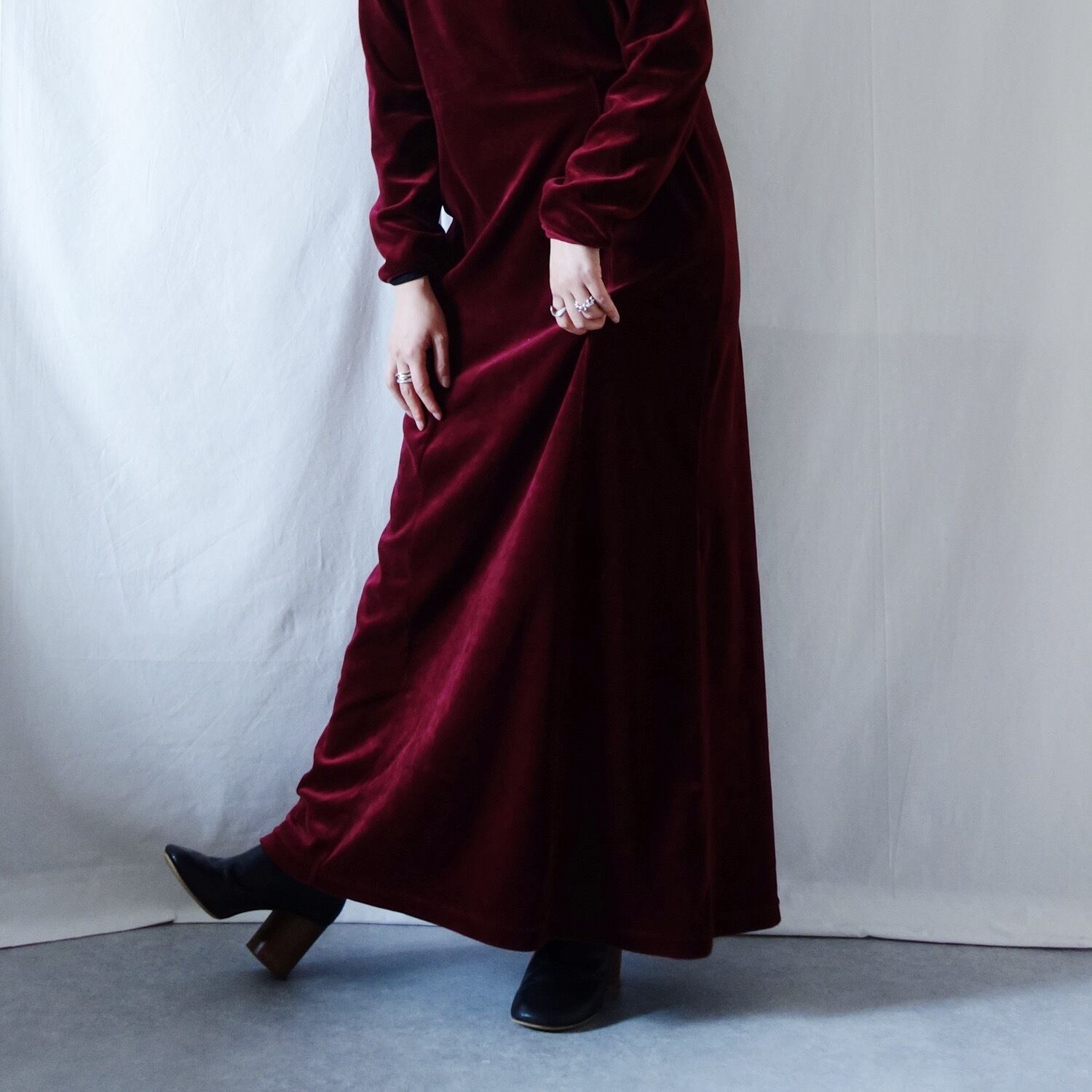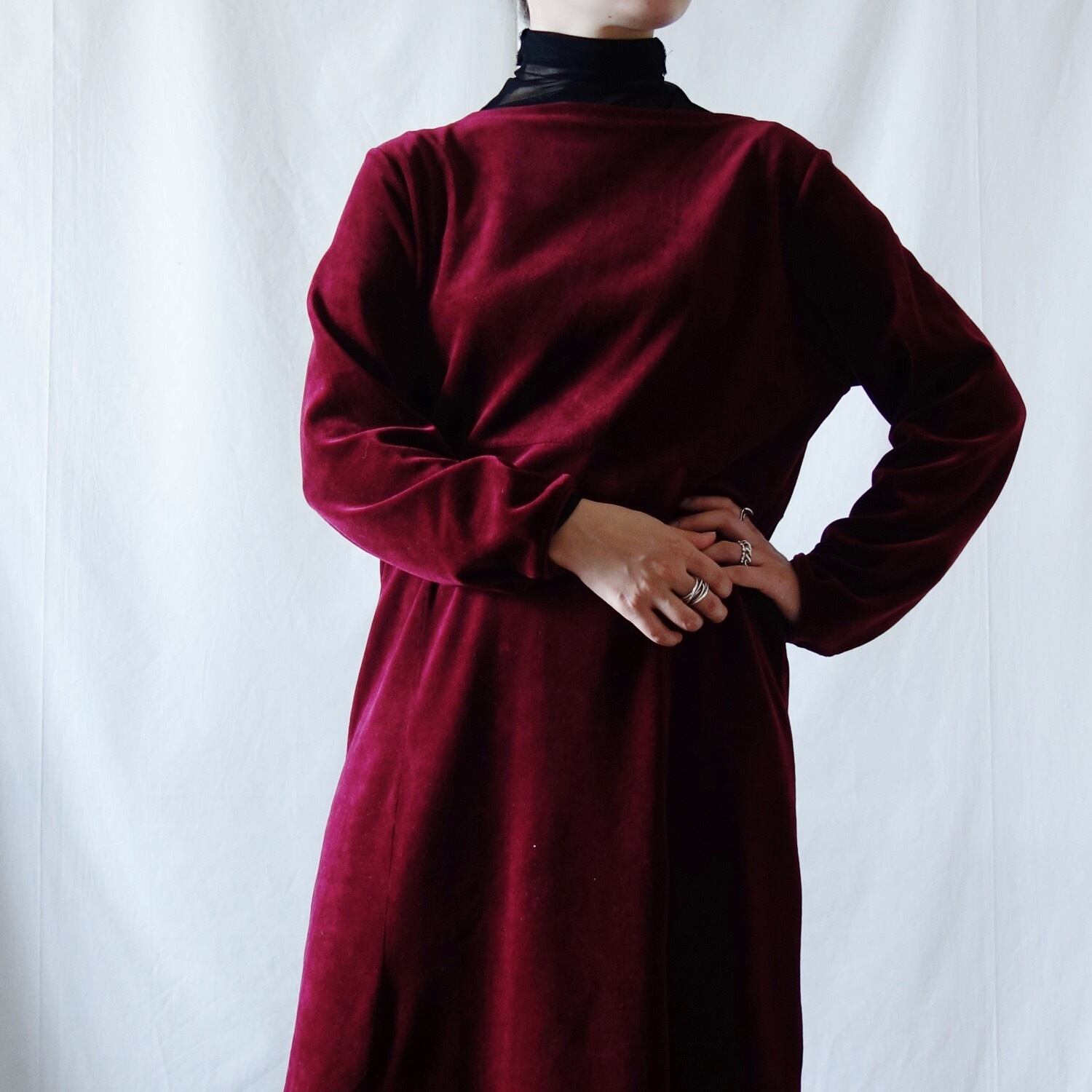 深いレッドカラーが綺麗な長袖ベロアワンピース。