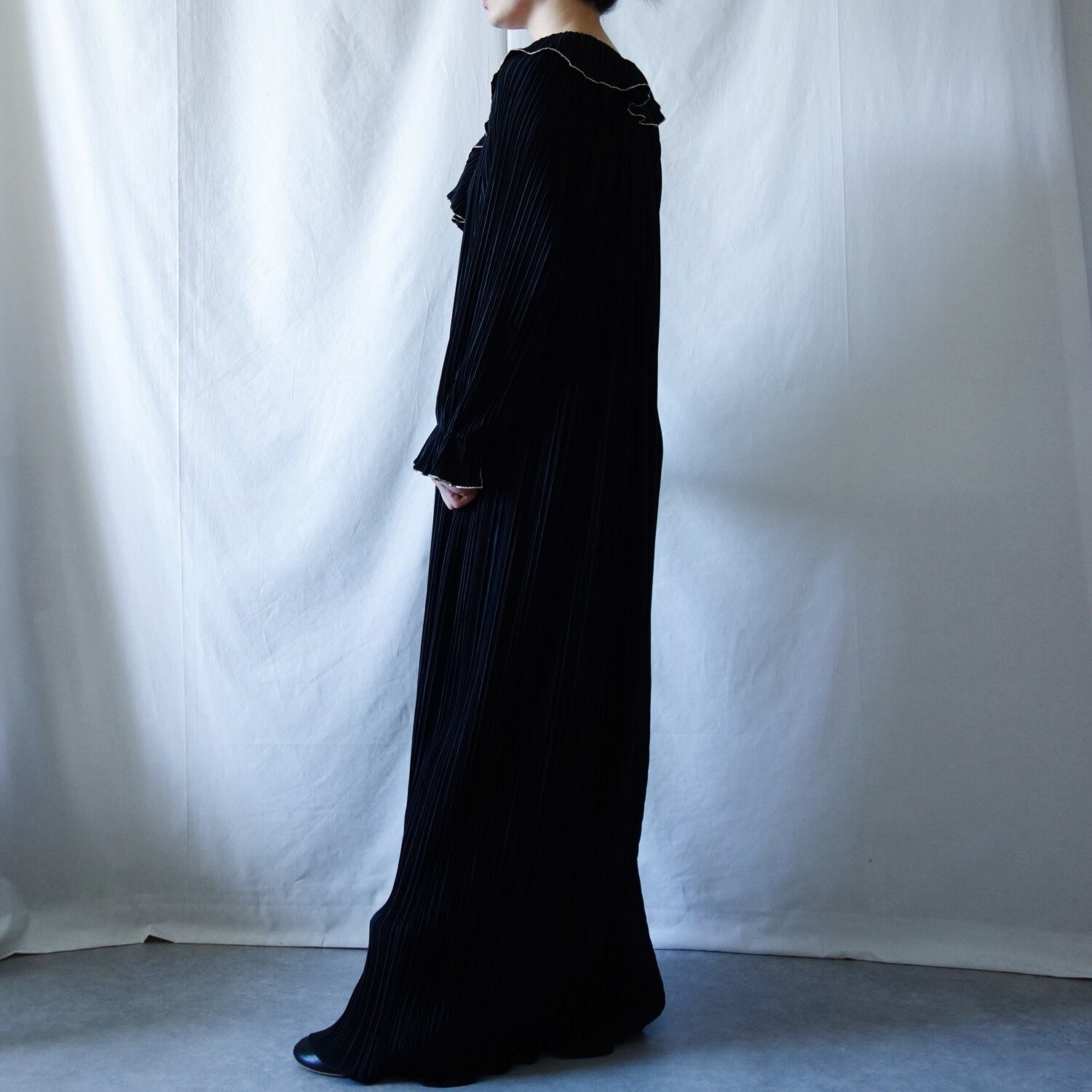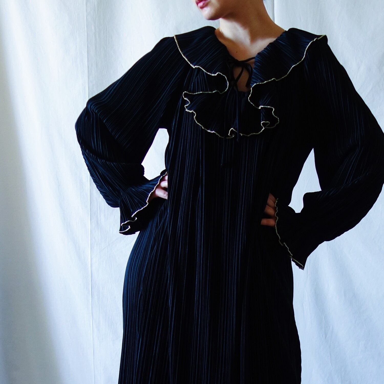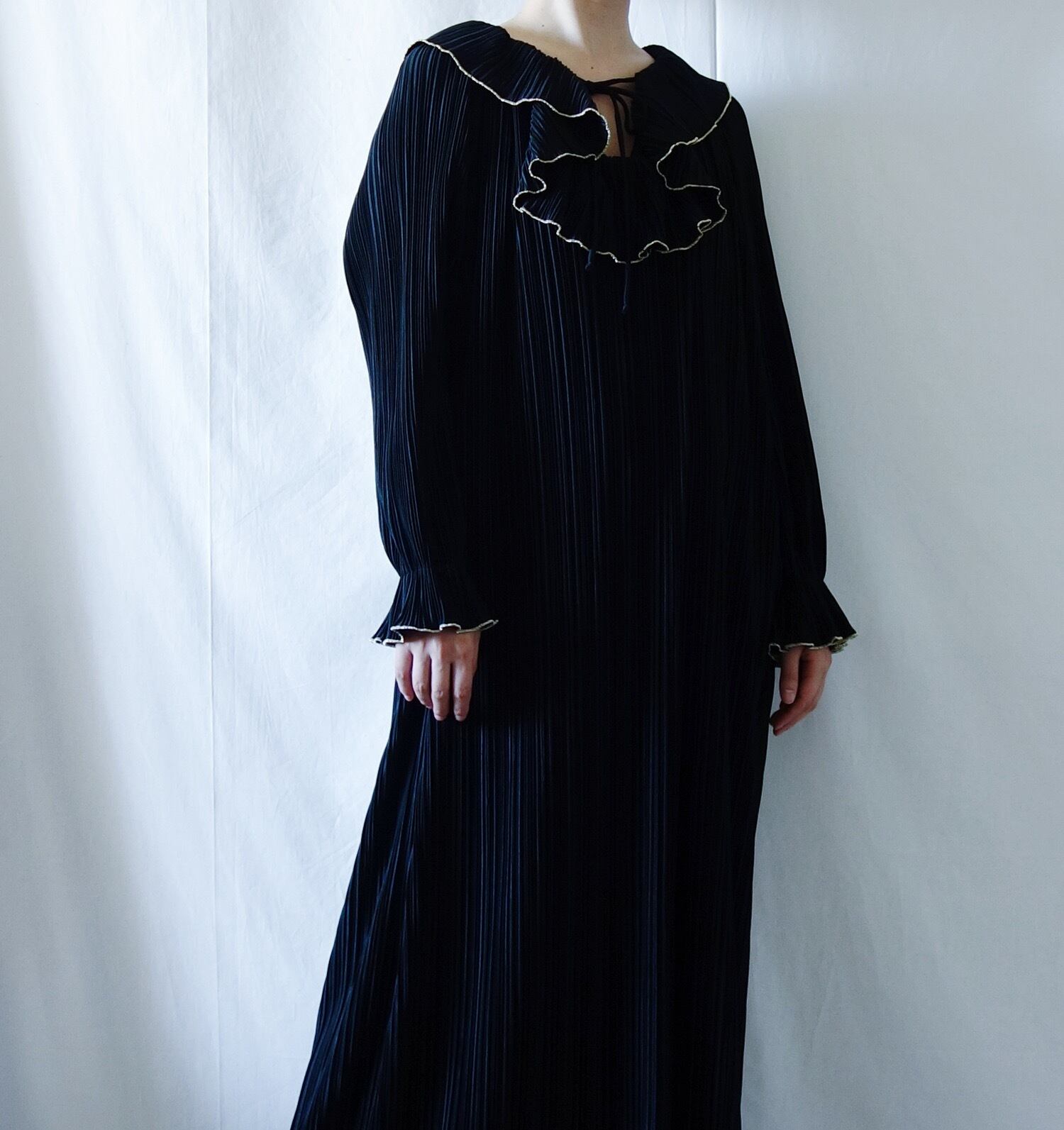 大胆なビッグカラーが印象的なプリーツワンピース。
