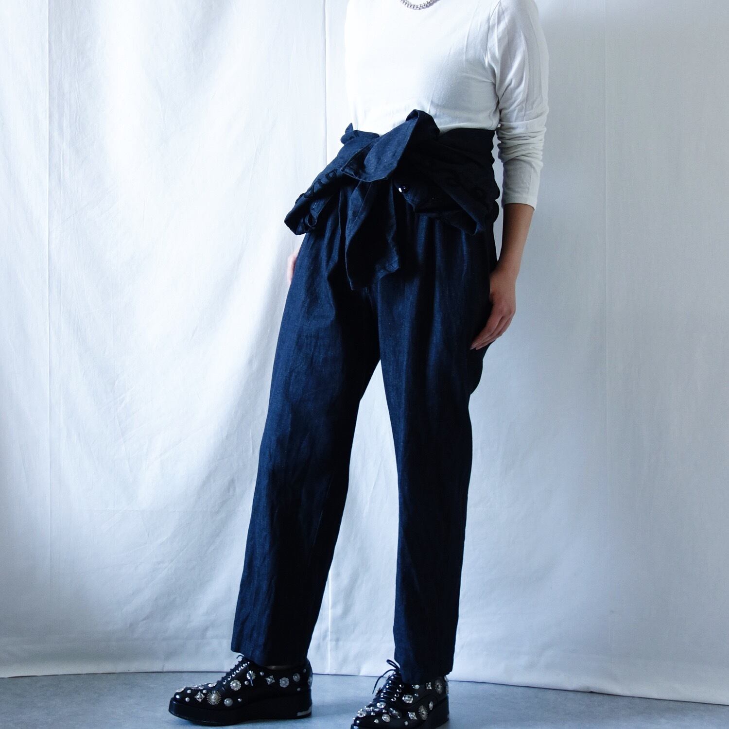 ウエスト部分にゴムが入っていて綺麗なシルエットです。ベルトループが両サイドに付いておりますので、お手持ちのベルトなどを付けることが可能です。