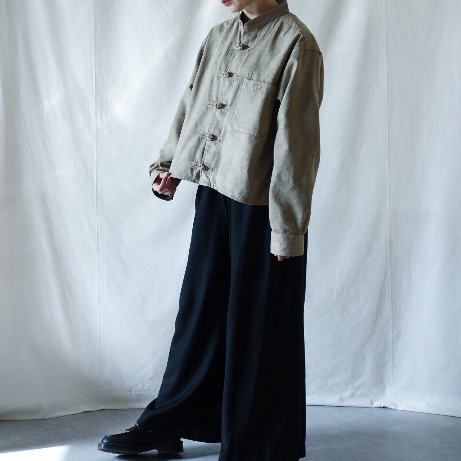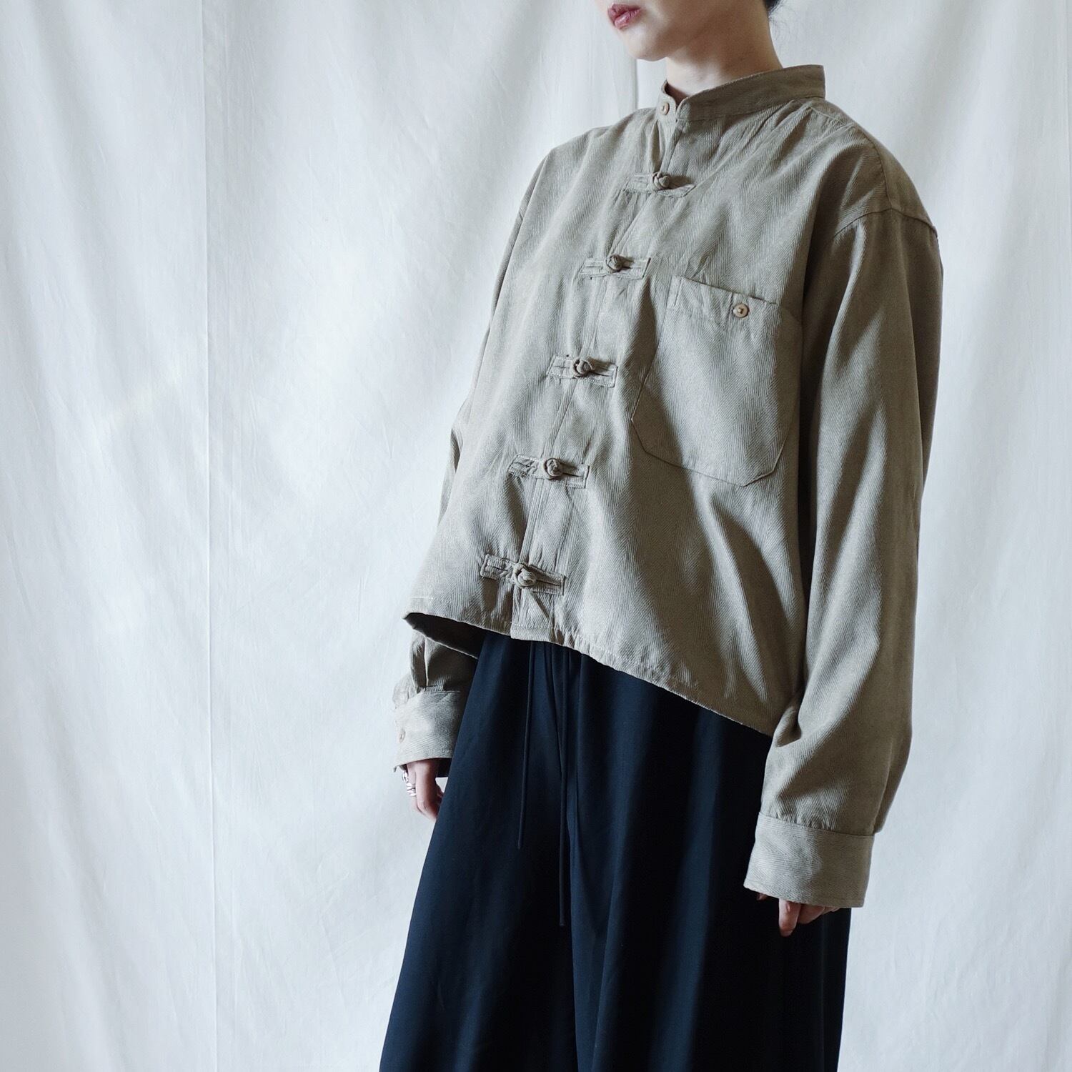 優しいベージュカラーのチャイナシャツジャケット。