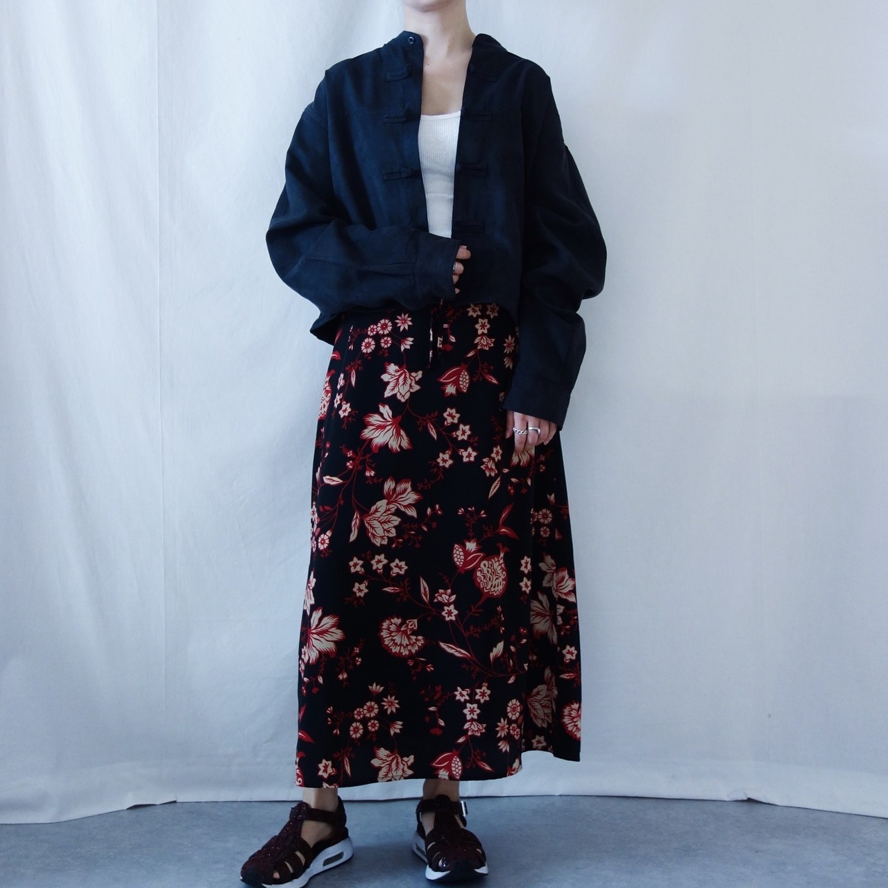 ブラックベースに赤い花柄がオリエンタルなロングスカート。綺麗なAラインシルエットです。