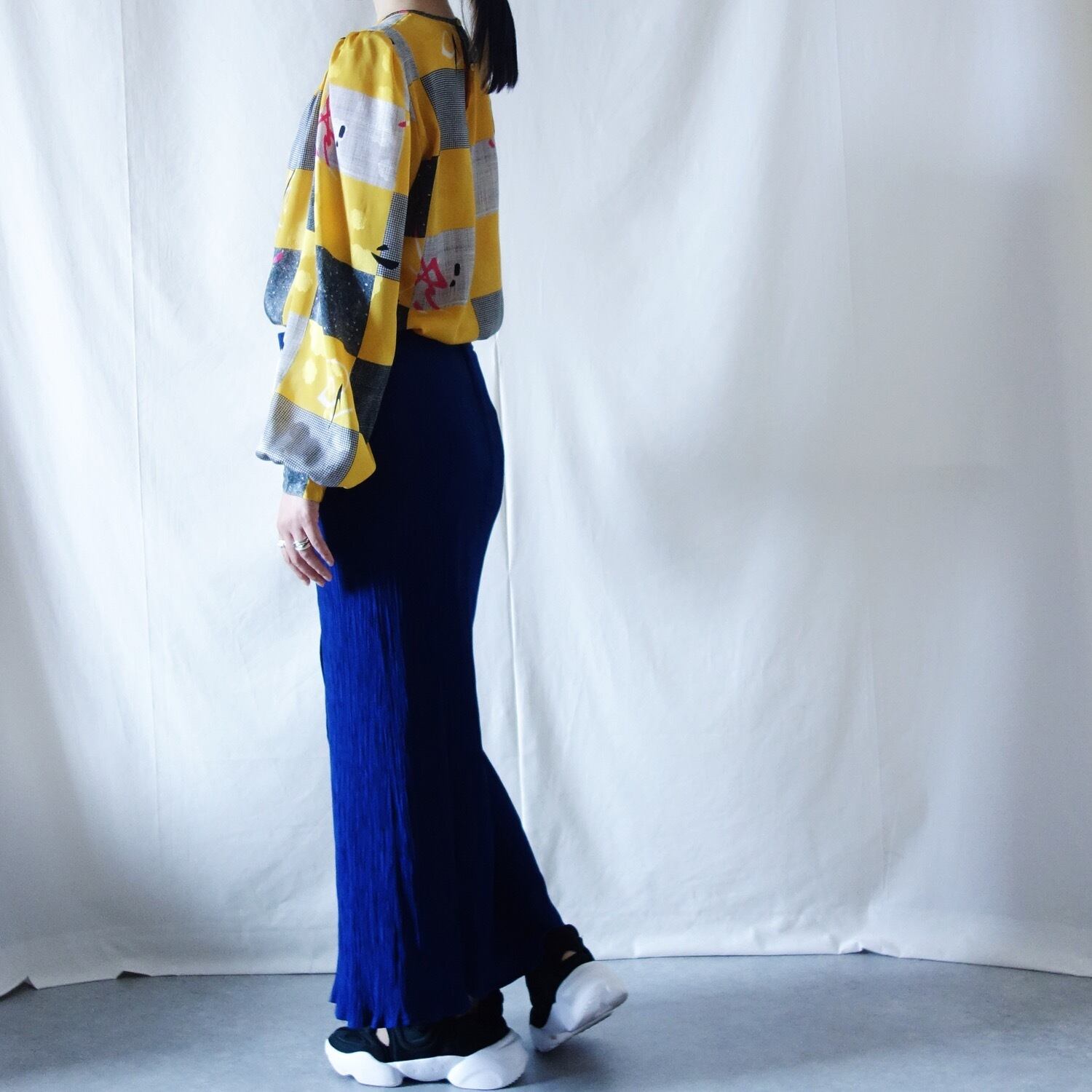 鮮やかなイエローが目を引くブロックチェックブラウス。袖山にボリュームをもたせたパフスリーブが可愛いです。ヴィンテージ ならではの珍しい柄です。