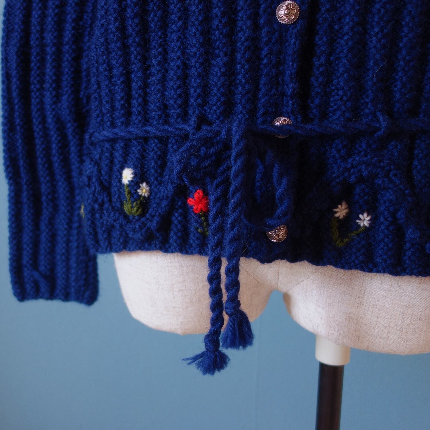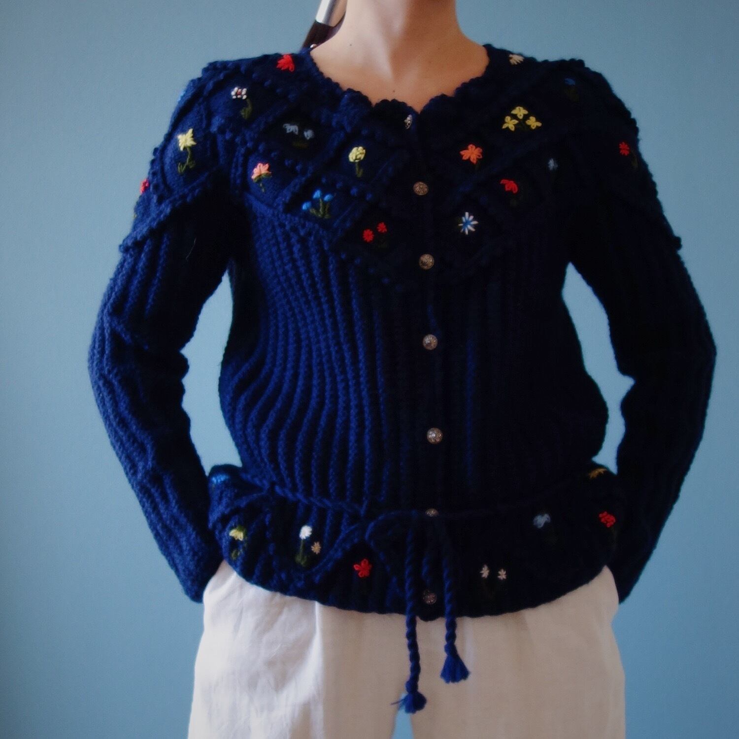 色とりどりの小さなお花が刺繍されたチロルニットカーディガン。ボディも太めのリブ編みで立体感のある1枚です。
