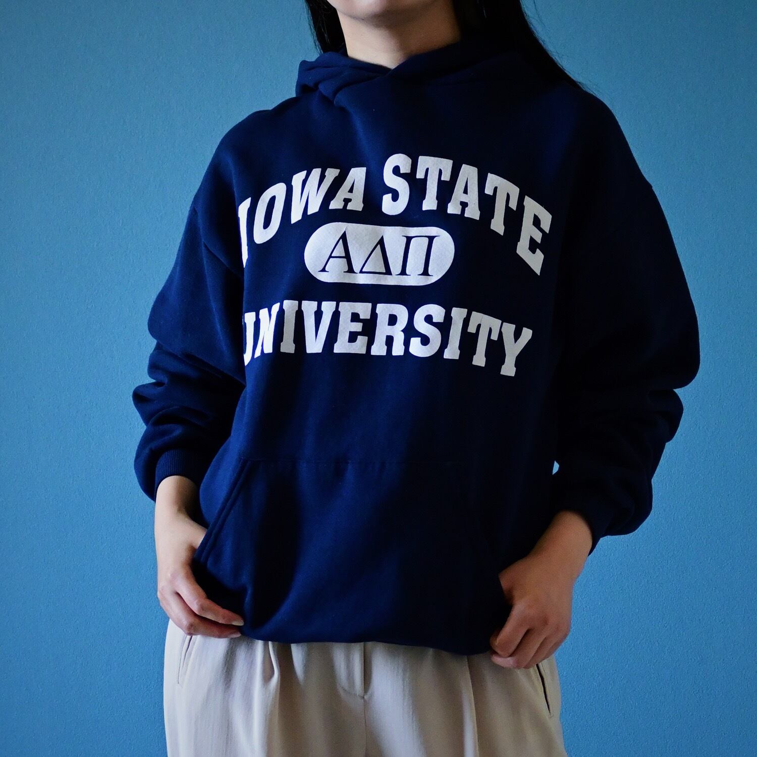 ややゆったりめなカレッジプリントフーディ。