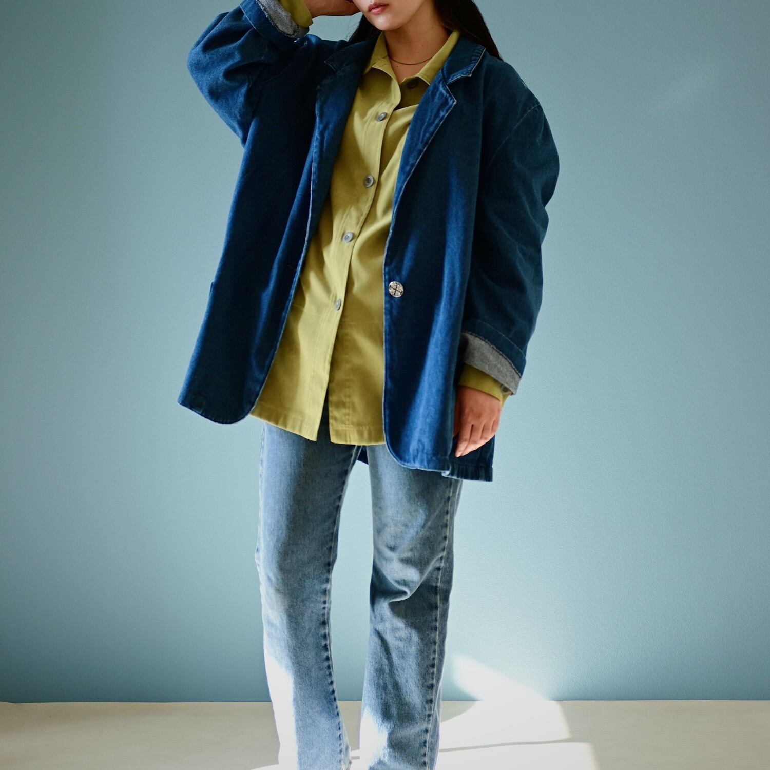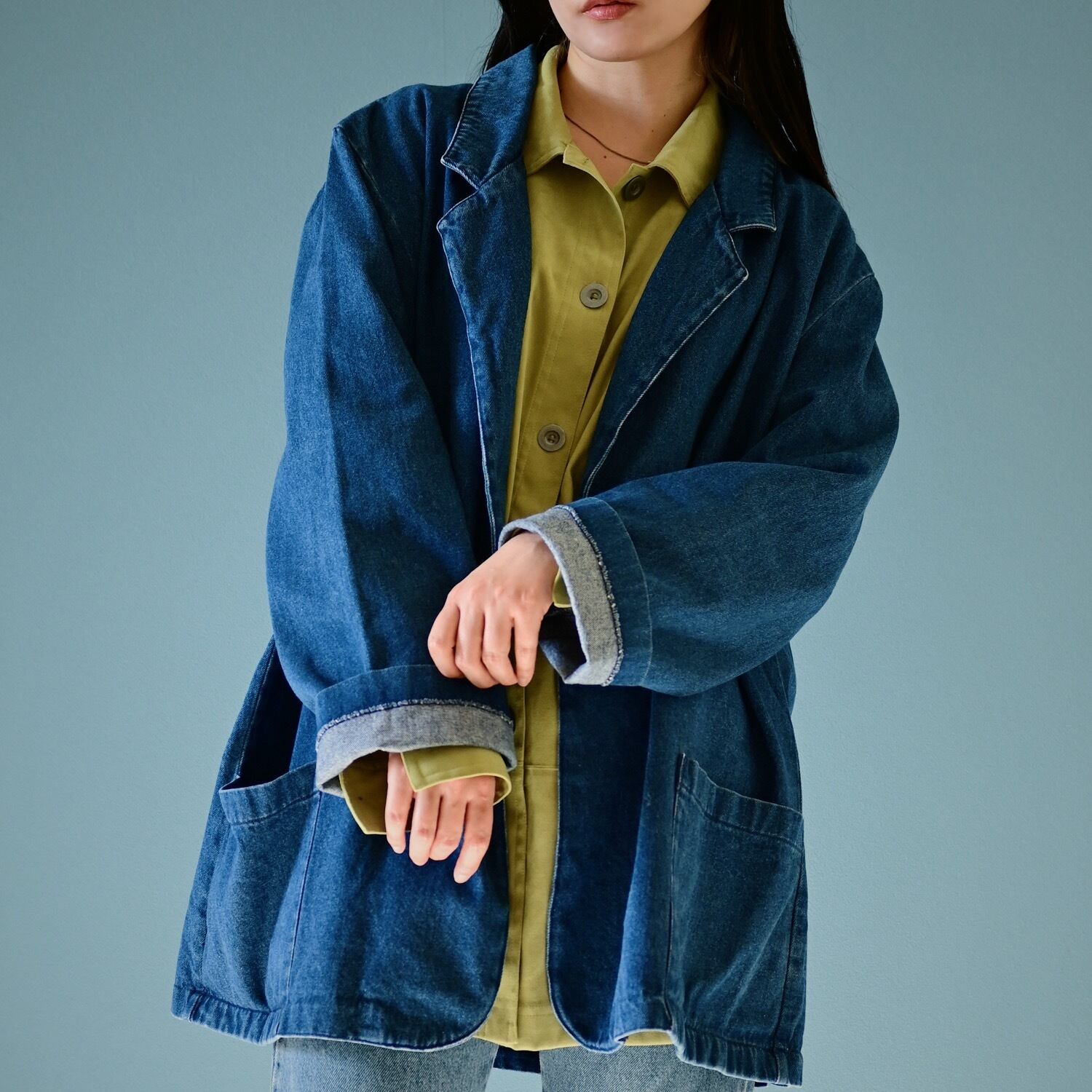 ビッグサイズのデニムテーラージャケット。