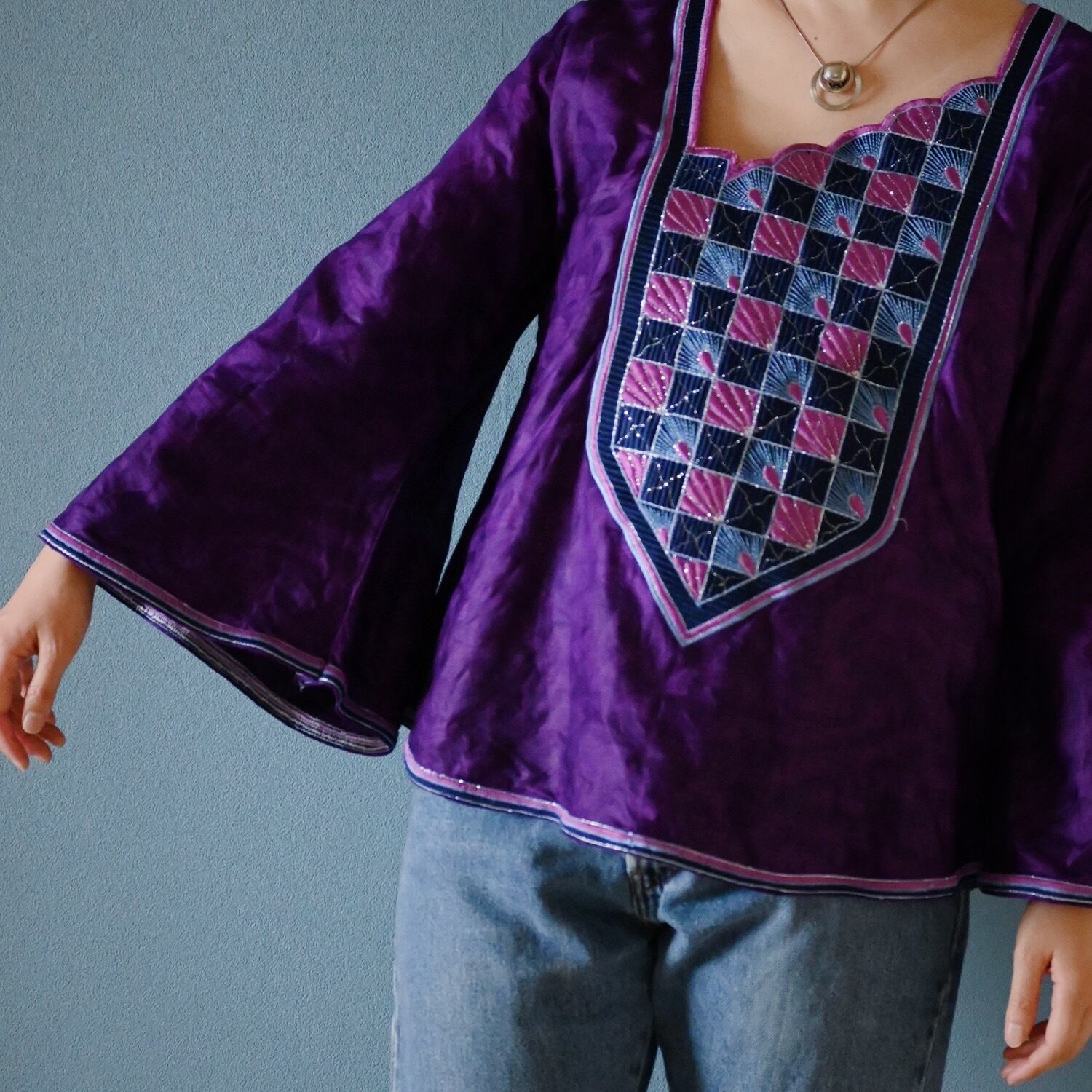 斜めに入ったネックデザインが可愛らしいエスニックトップス。フレアスリーブで女性らしいシルエットです。