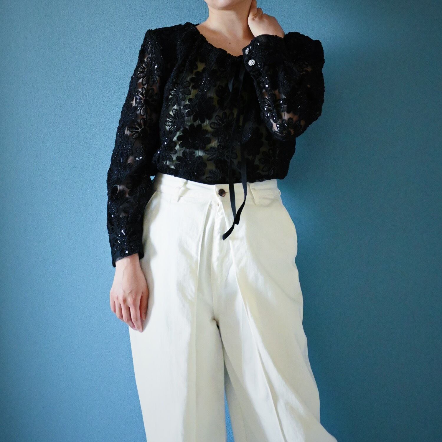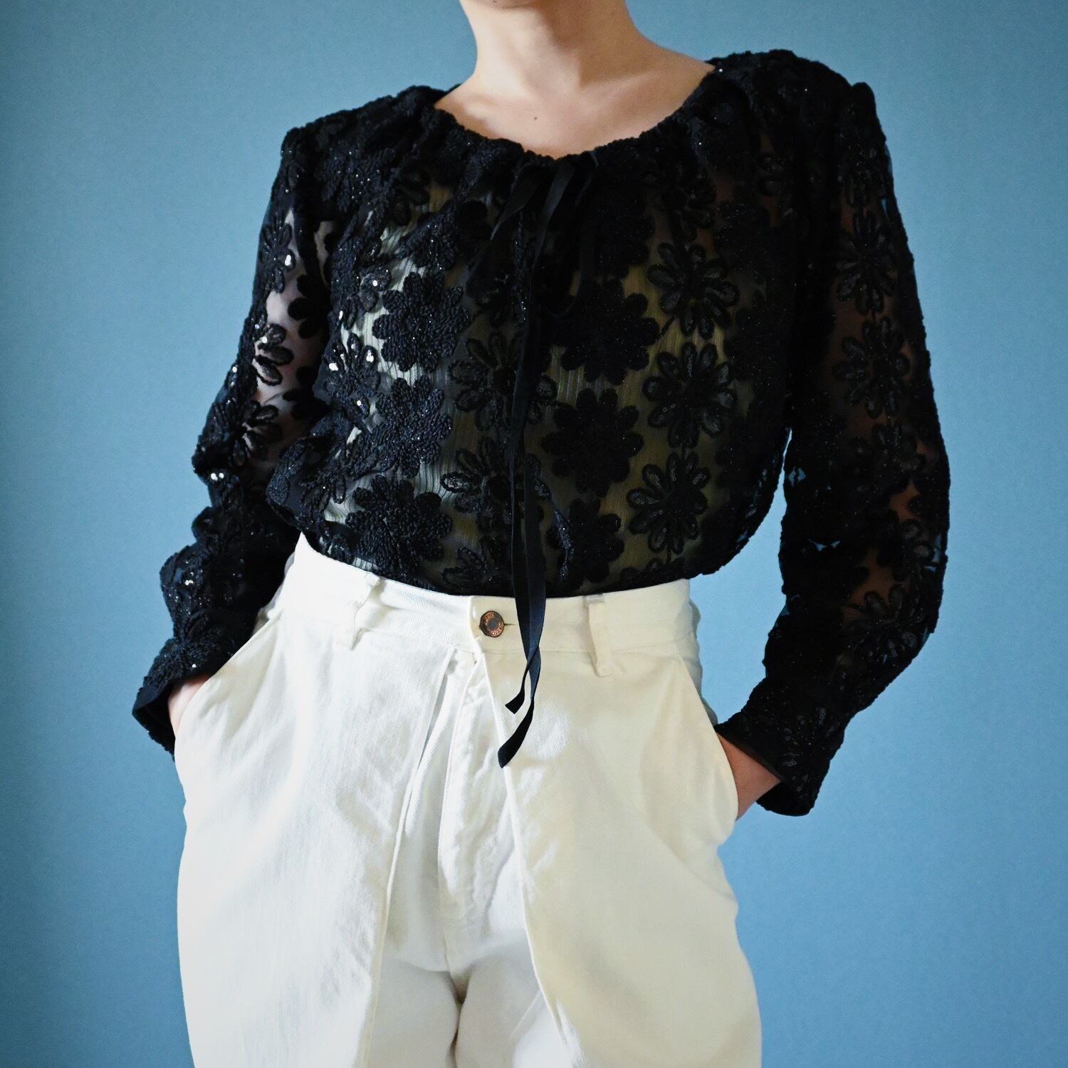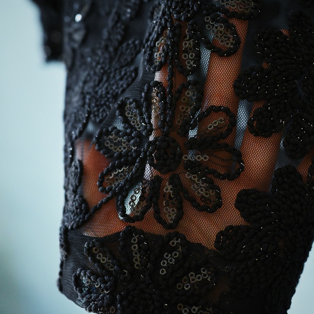 透け感のあるメッシュ素材に立体的なフラワー刺繍が施されています。