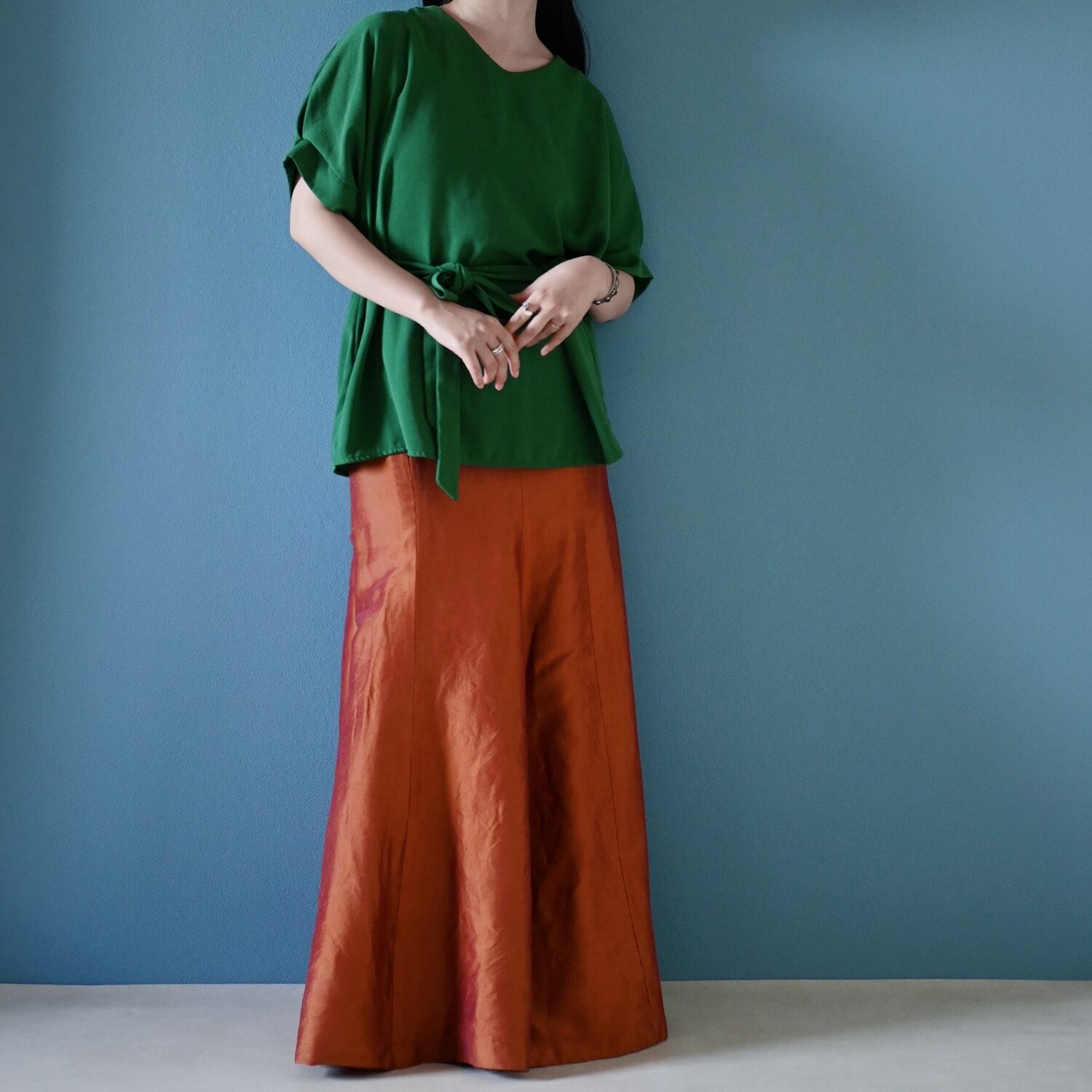 鮮やかなグリーンのトップス。