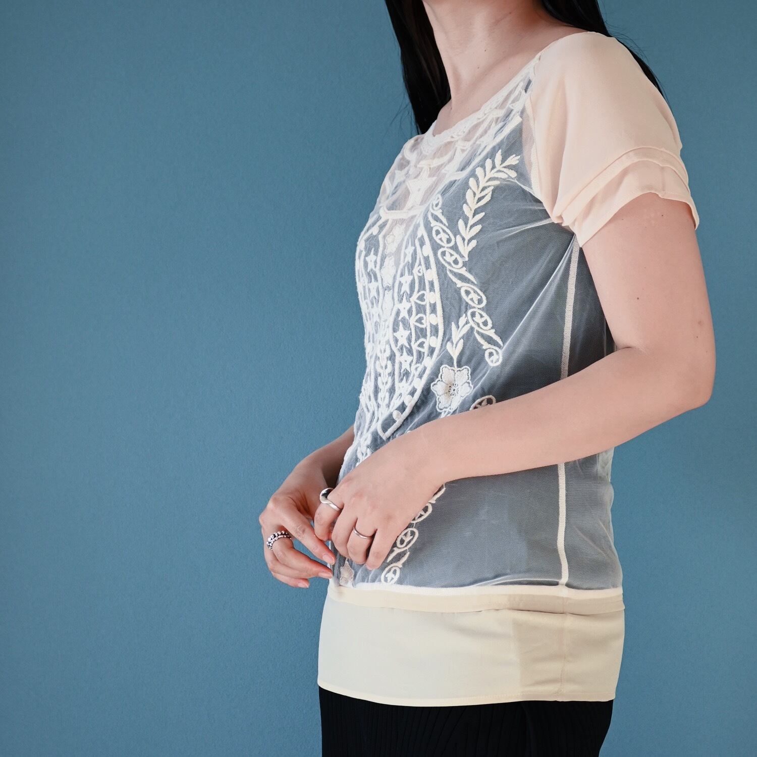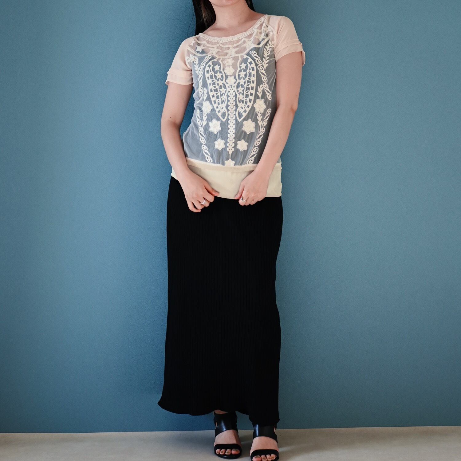 シフォン×レースの組み合わせなのに、ピリっとモードな雰囲気のトップスです。