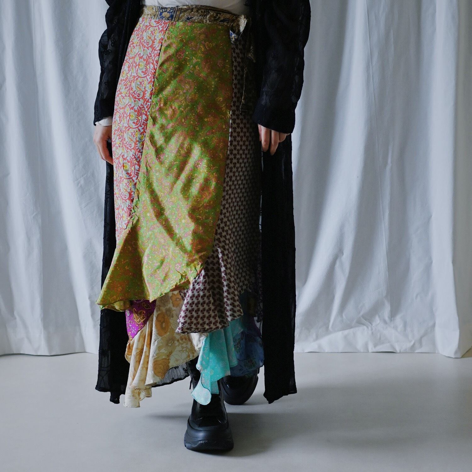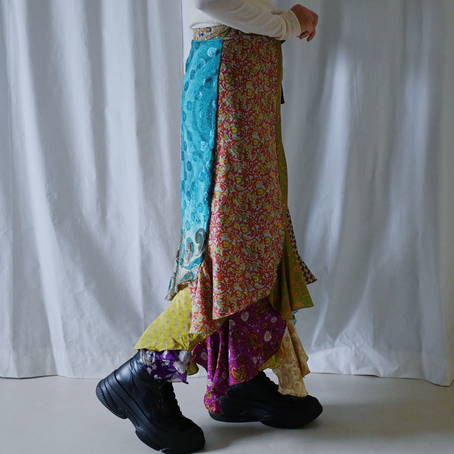 全パーツが異なる柄で切り替えられた贅沢なラップスカート。歩くと裾がひらひら揺れるボリュームあるデザインです。広がると一枚の布になるので、巻き方次第で色々な着方が可能です。