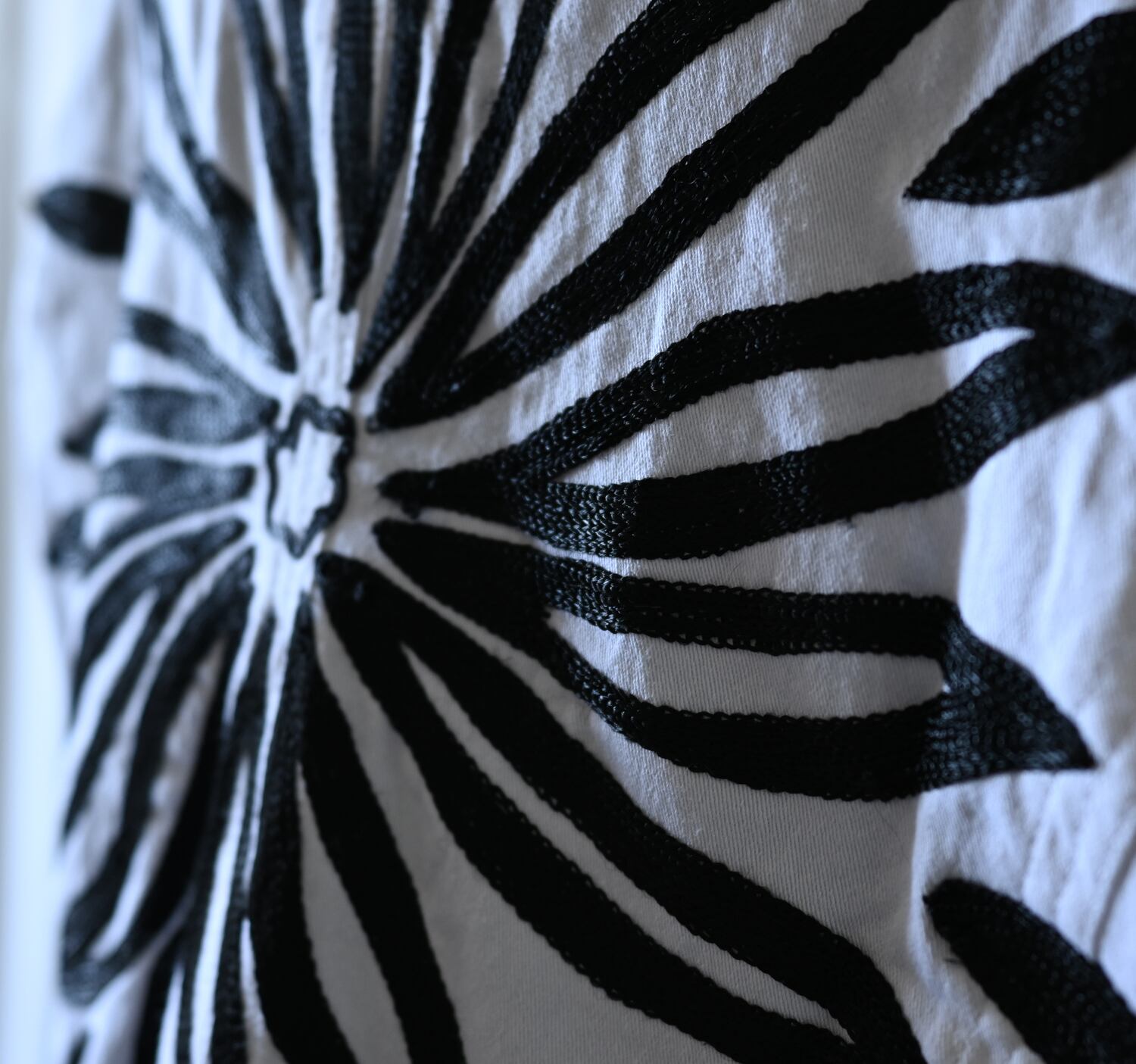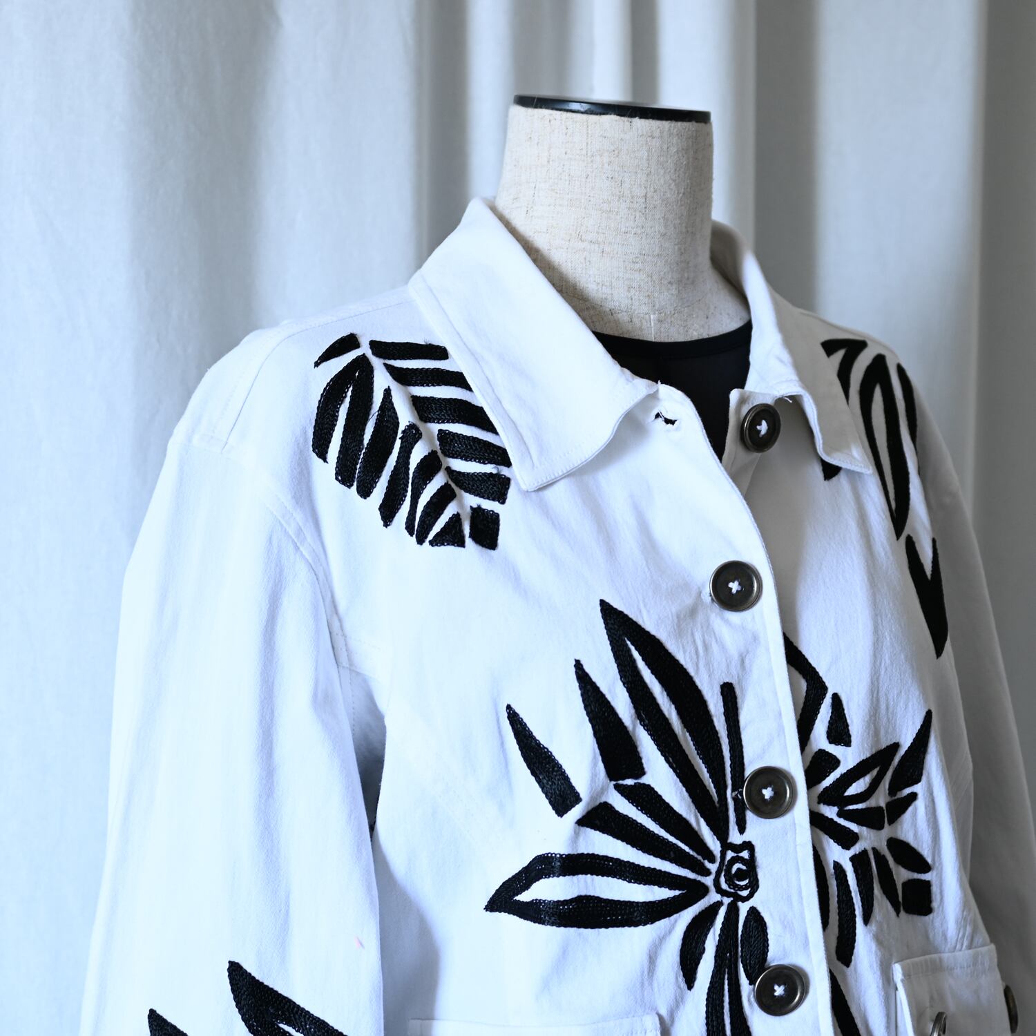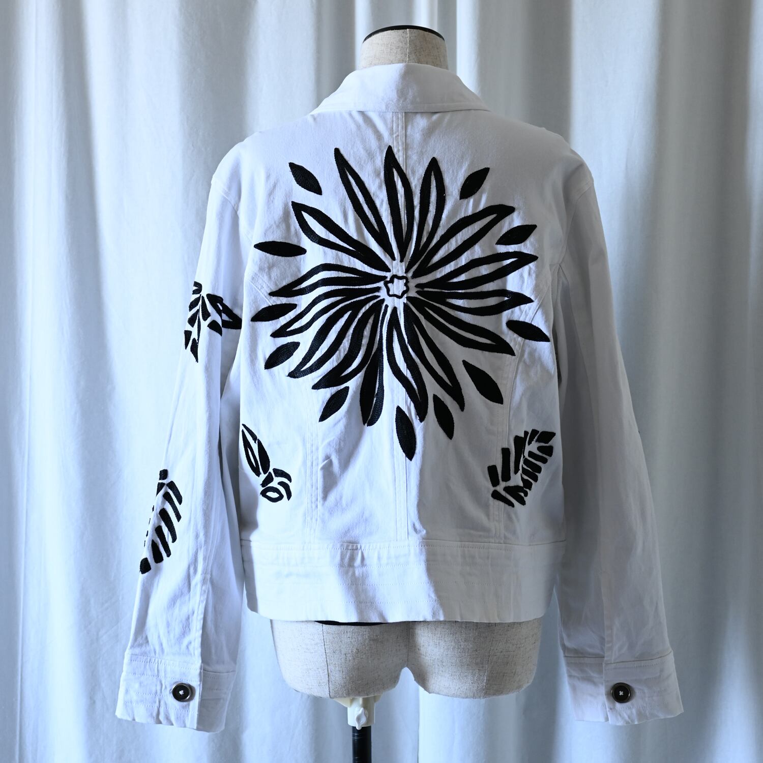 ホワイト×ブラックのコントラストが目を引く刺繍ジャケット。おおぶりなデザイン刺繍でインパクトがあります。
