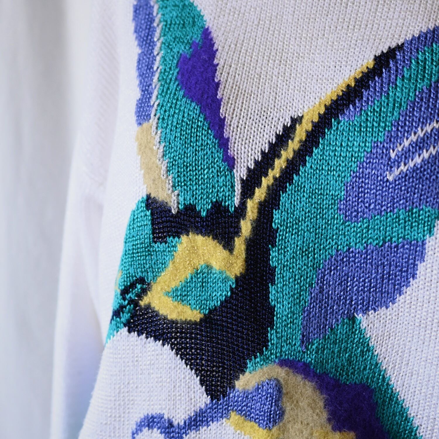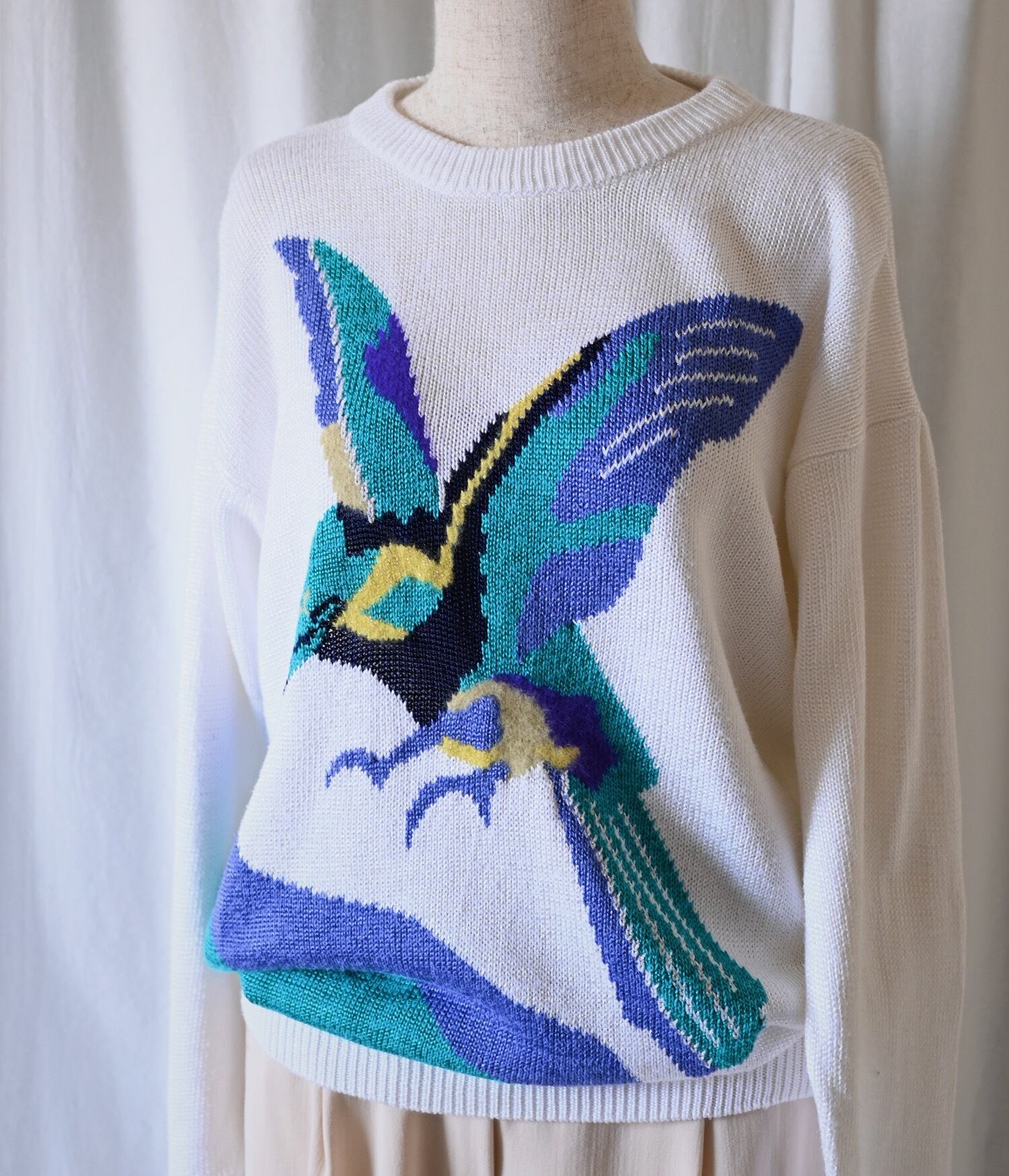 羽の部分にさりげなくラメ糸を使っており細かなデザインが素晴らしいニットです。袖がパフスリーブになっています。
