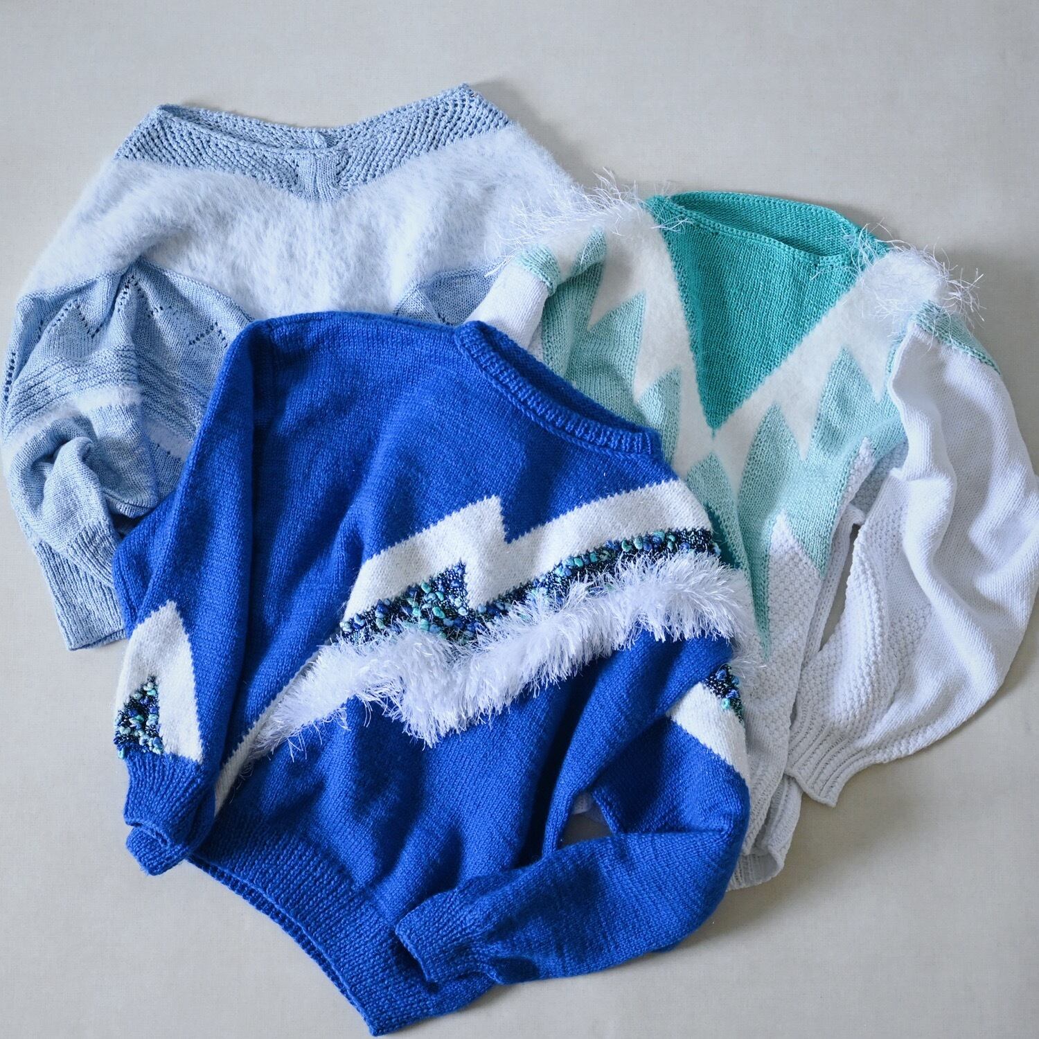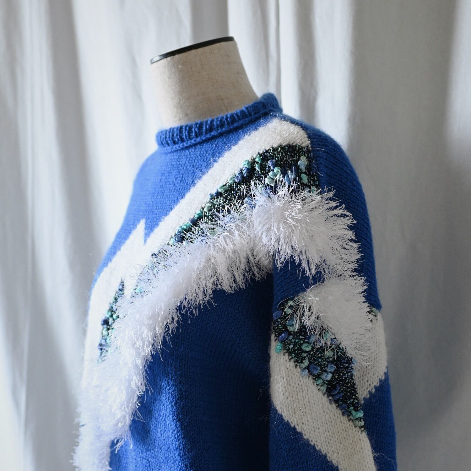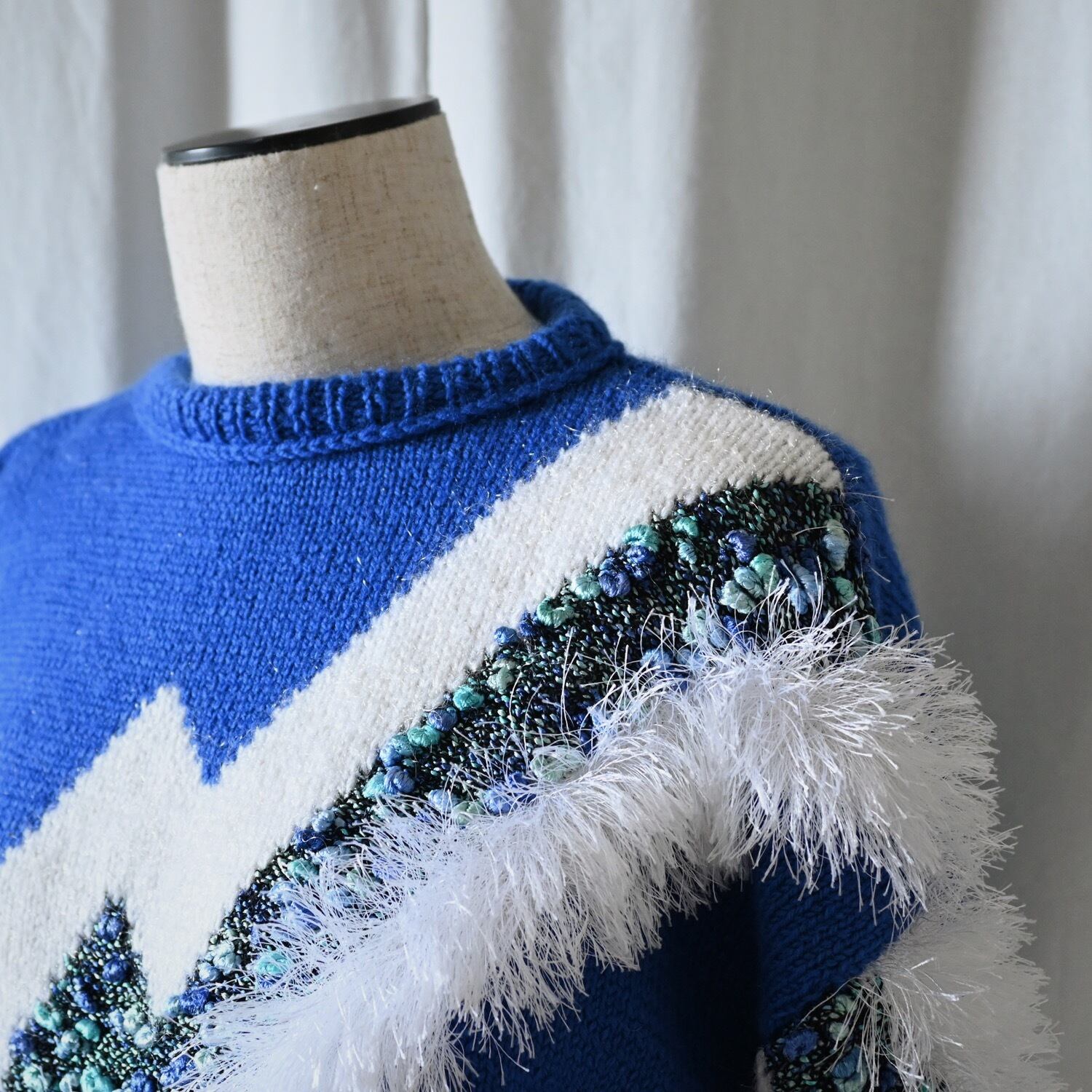 ふわふわのシャギーとポコポコした糸のミックスがアクセントになっているロイヤルブルーのニット。
