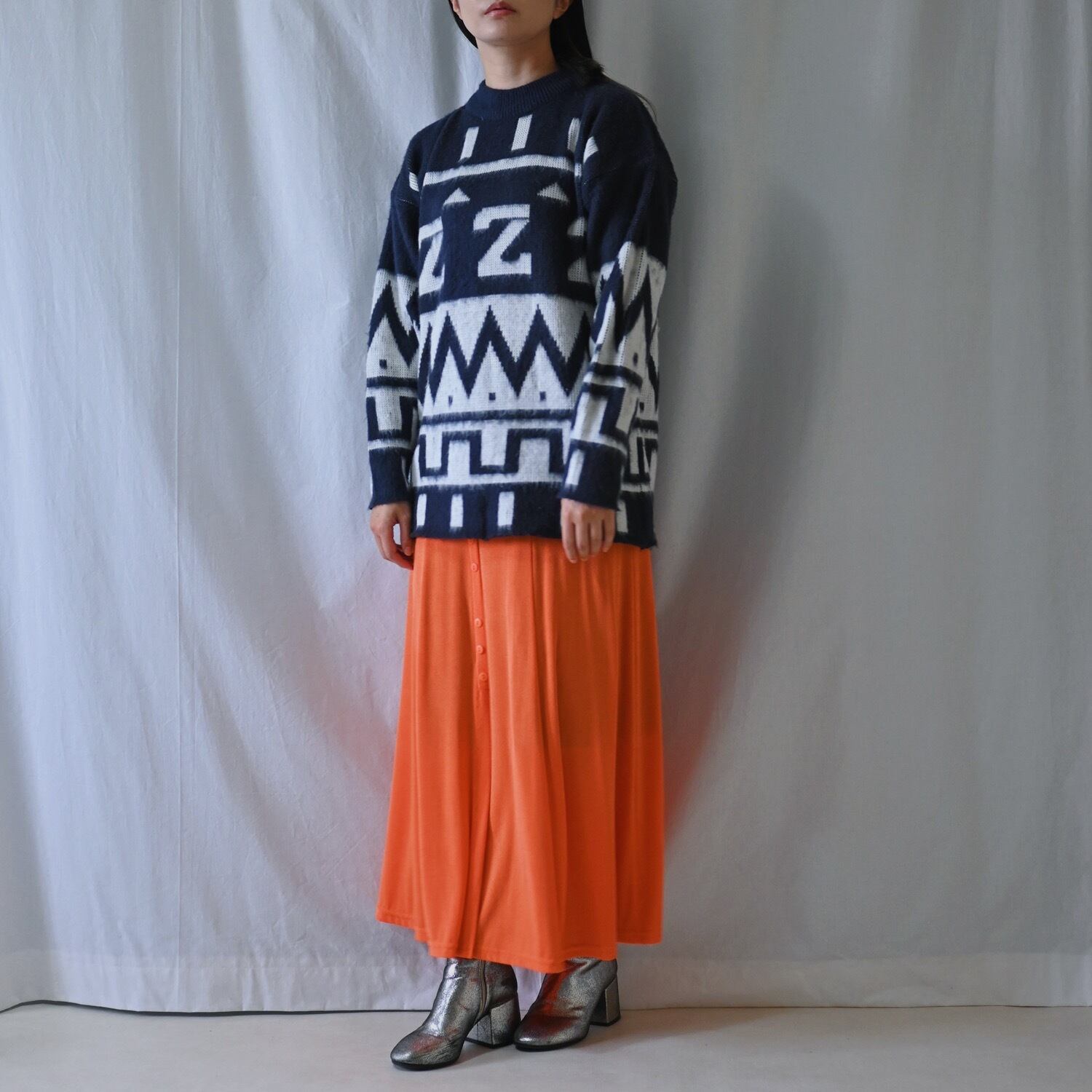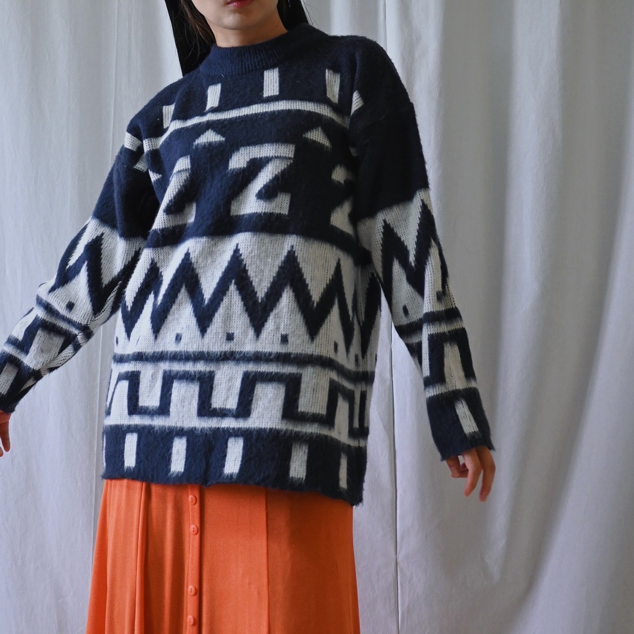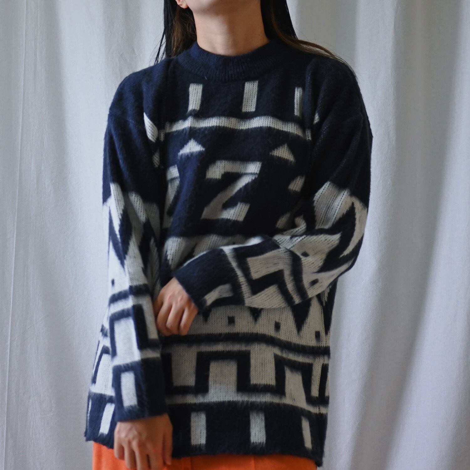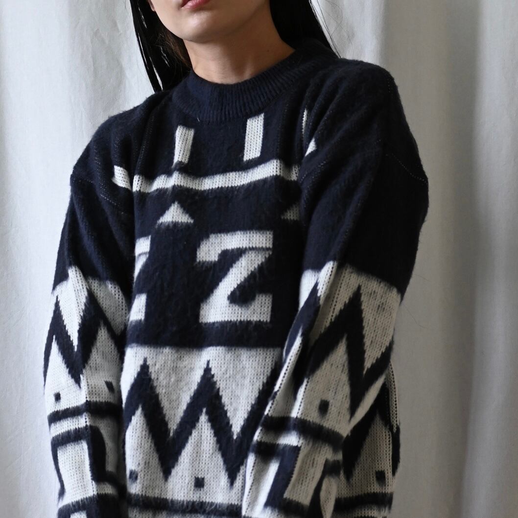 不思議な柄が個性的なモノトーンニット。