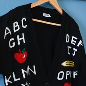 アルファベットと、関連するモチーフがポップなニットカーディガン。遊び心満載なアイテムです。