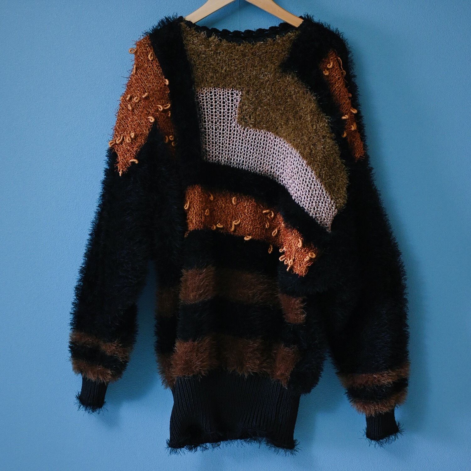 ふわふわのシャギーやポコポコの糸、つやつやな光沢糸がミックスされたニットプルオーバー。