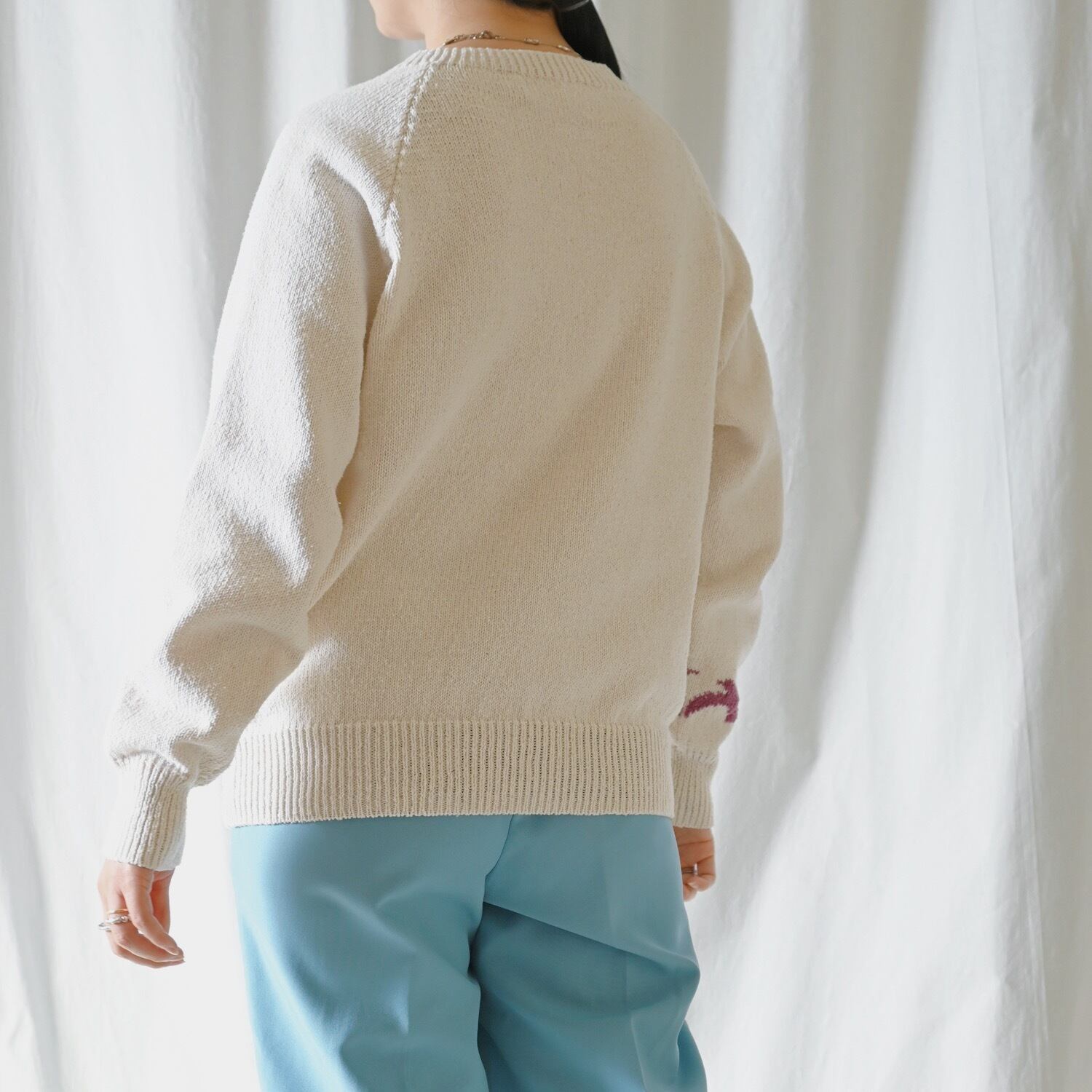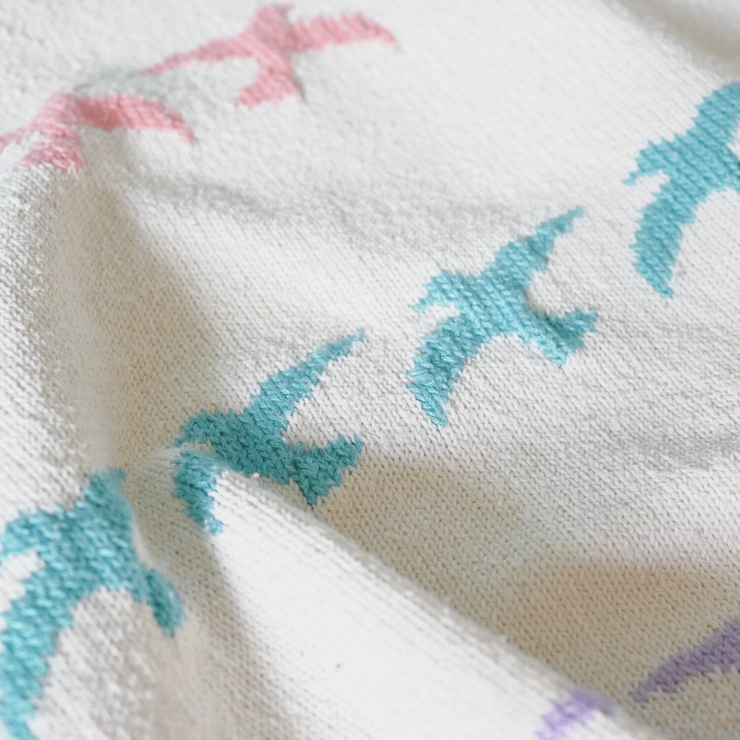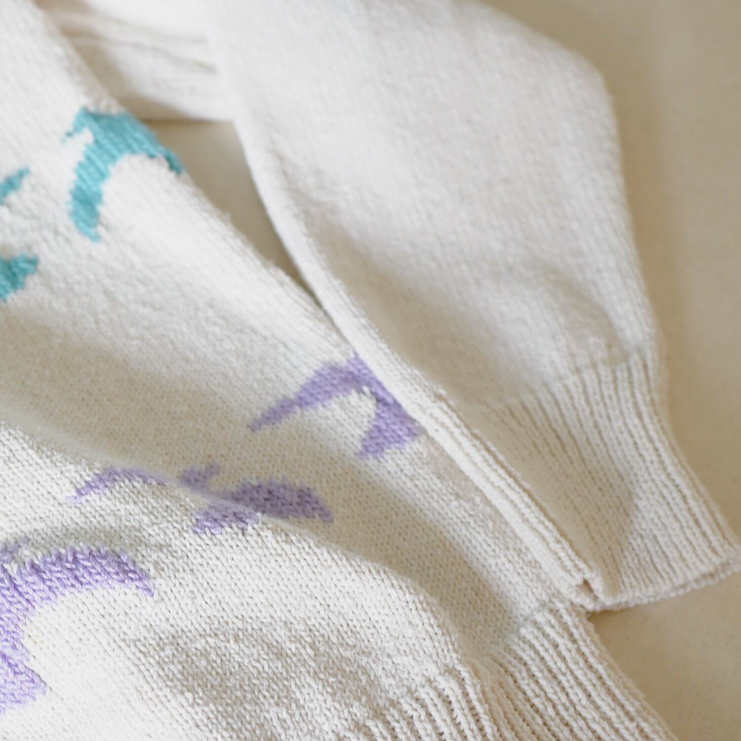 ネップがかったアイボリーの糸と、鳥のモチーフが絶妙にマッチしています。右袖にだけ鳥が配置されたアシンメトリーなデザインにも注目です。
