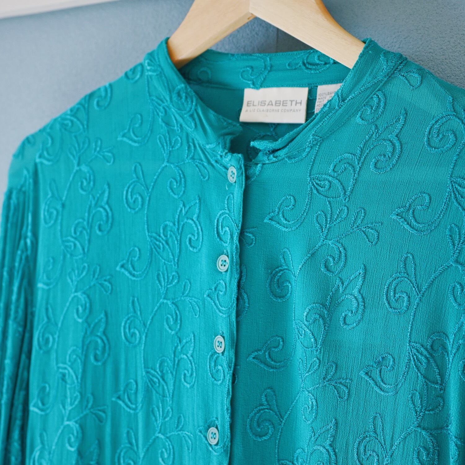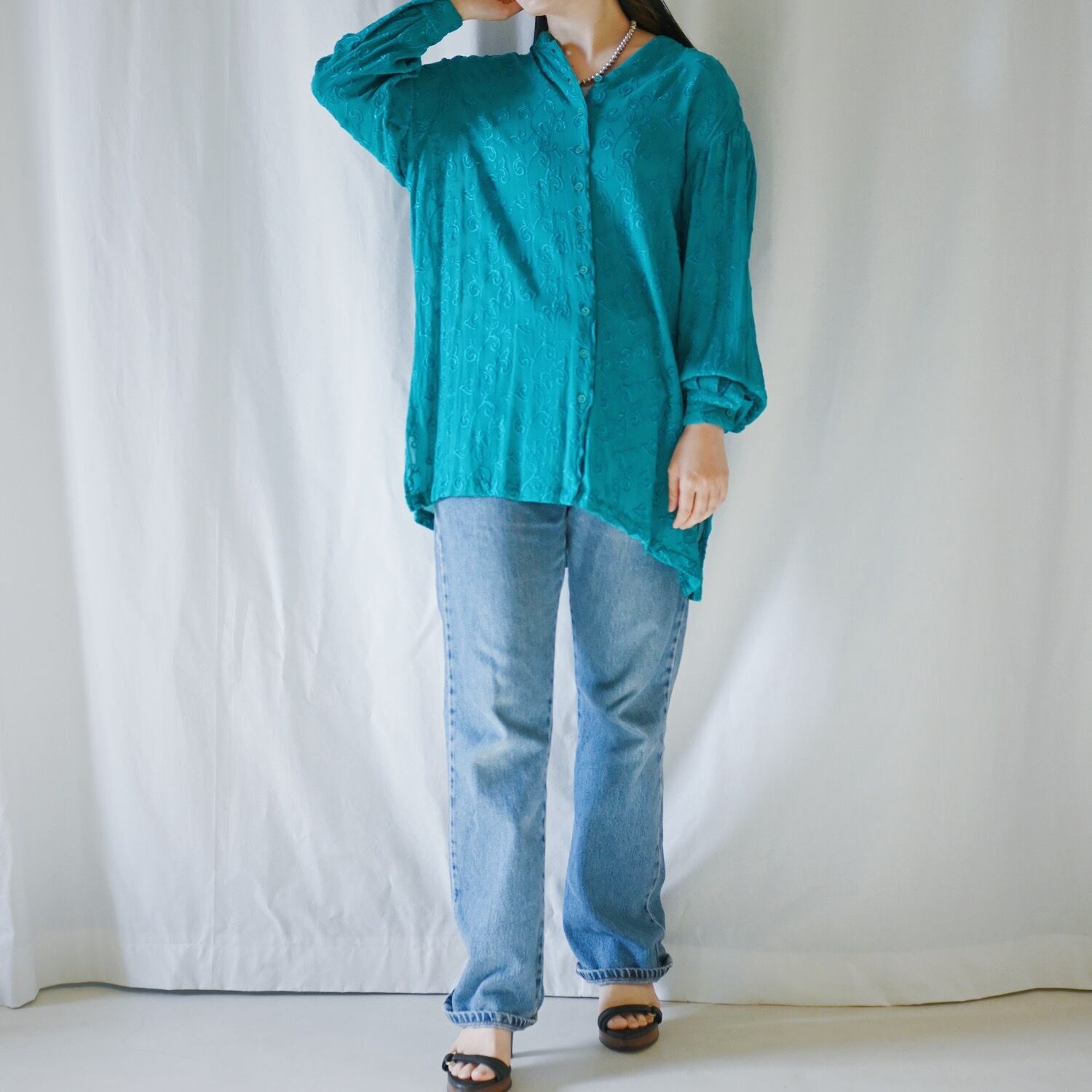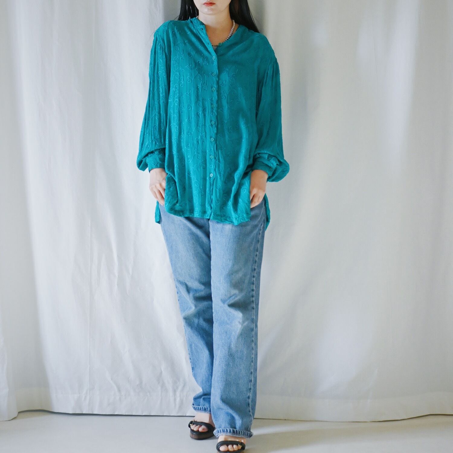 インドで作られた総刺繍が美しいグリーンのシアーシャツ。