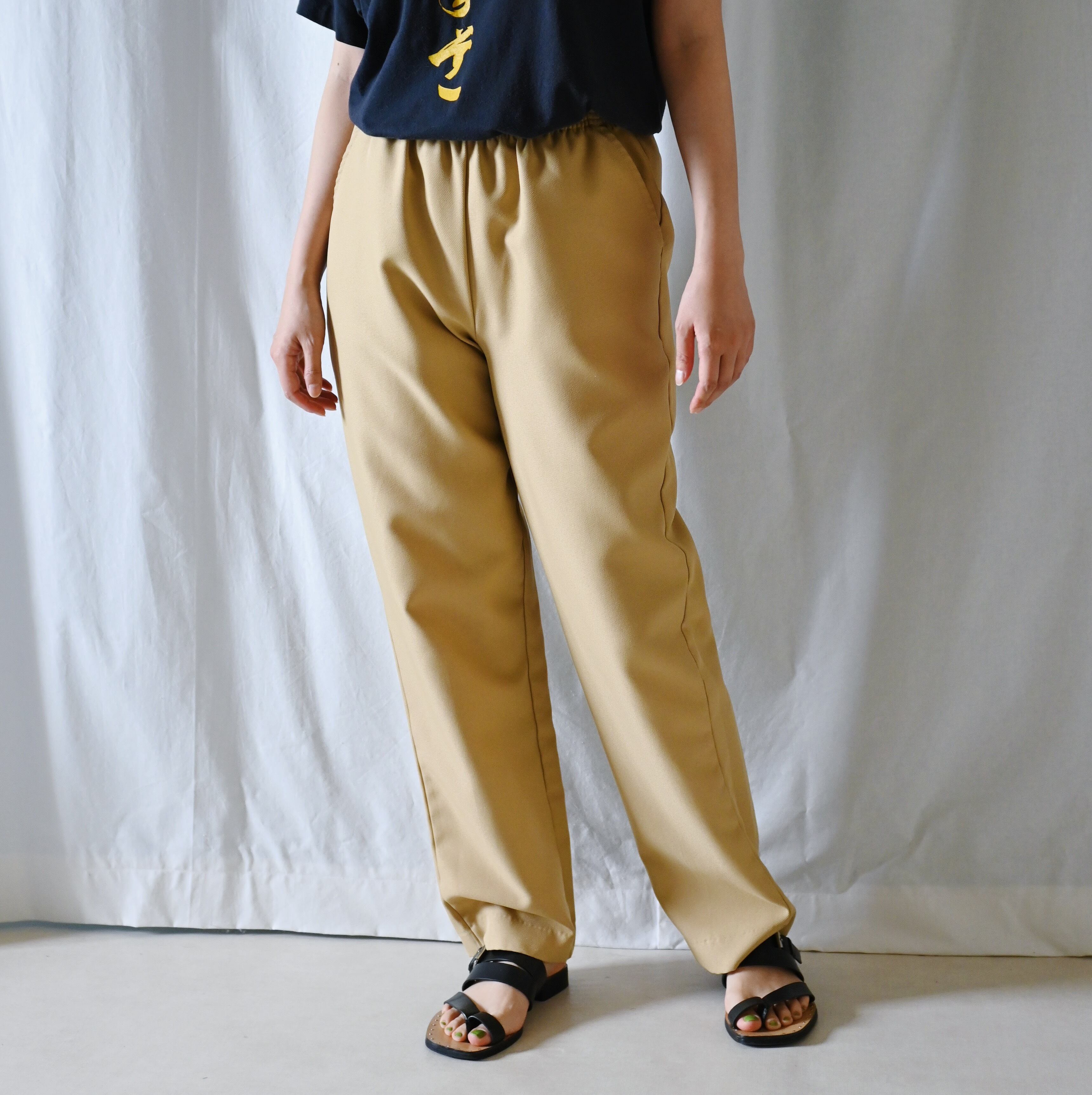 どんなスタイルにも合う、万能ベージュのイージーパンツ。ウエストゴムでストレスフリーです。