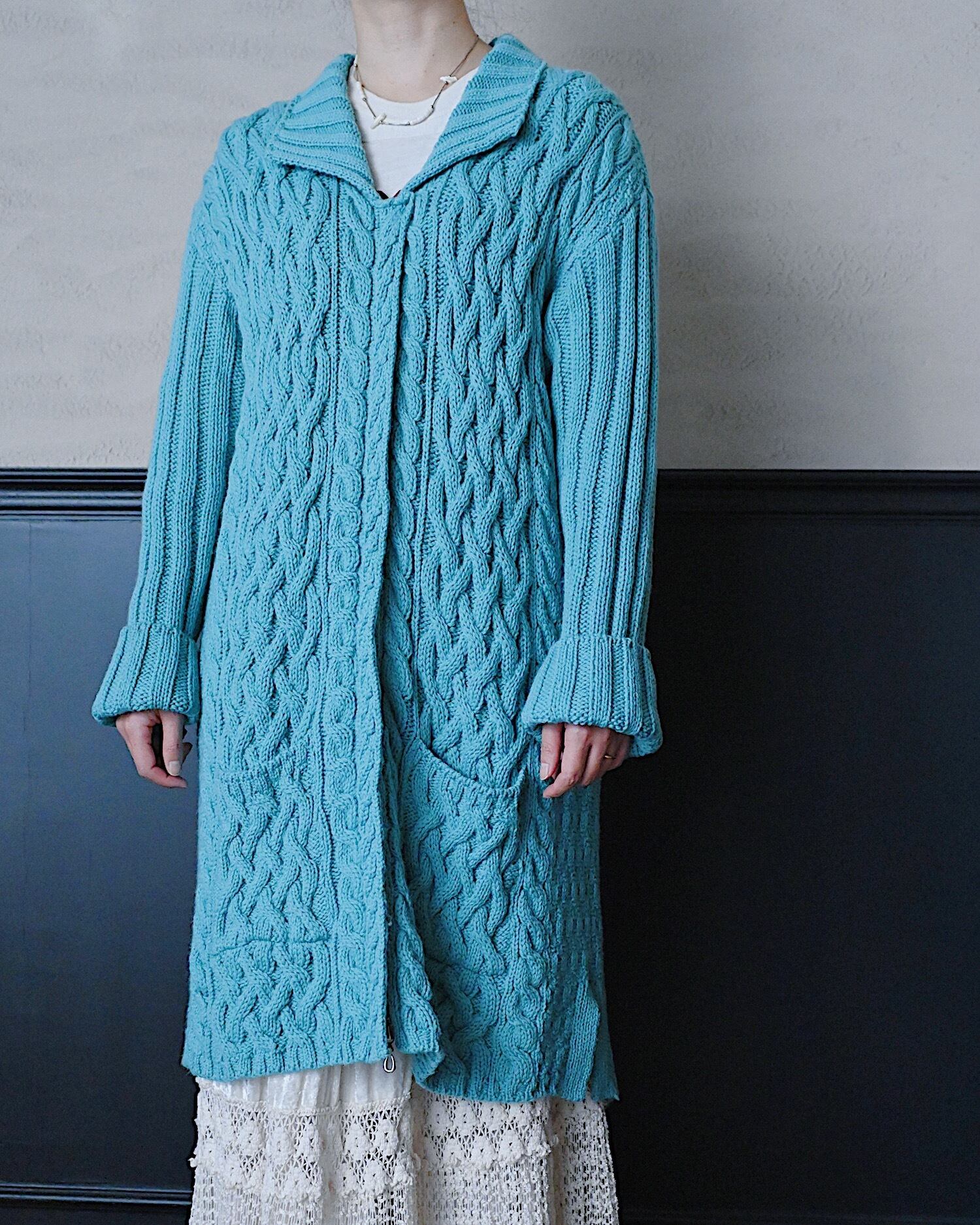 ライトブルーのロングニットカーディガン。フロントジップなので、軽いアウターとしても使えるアイテムです。