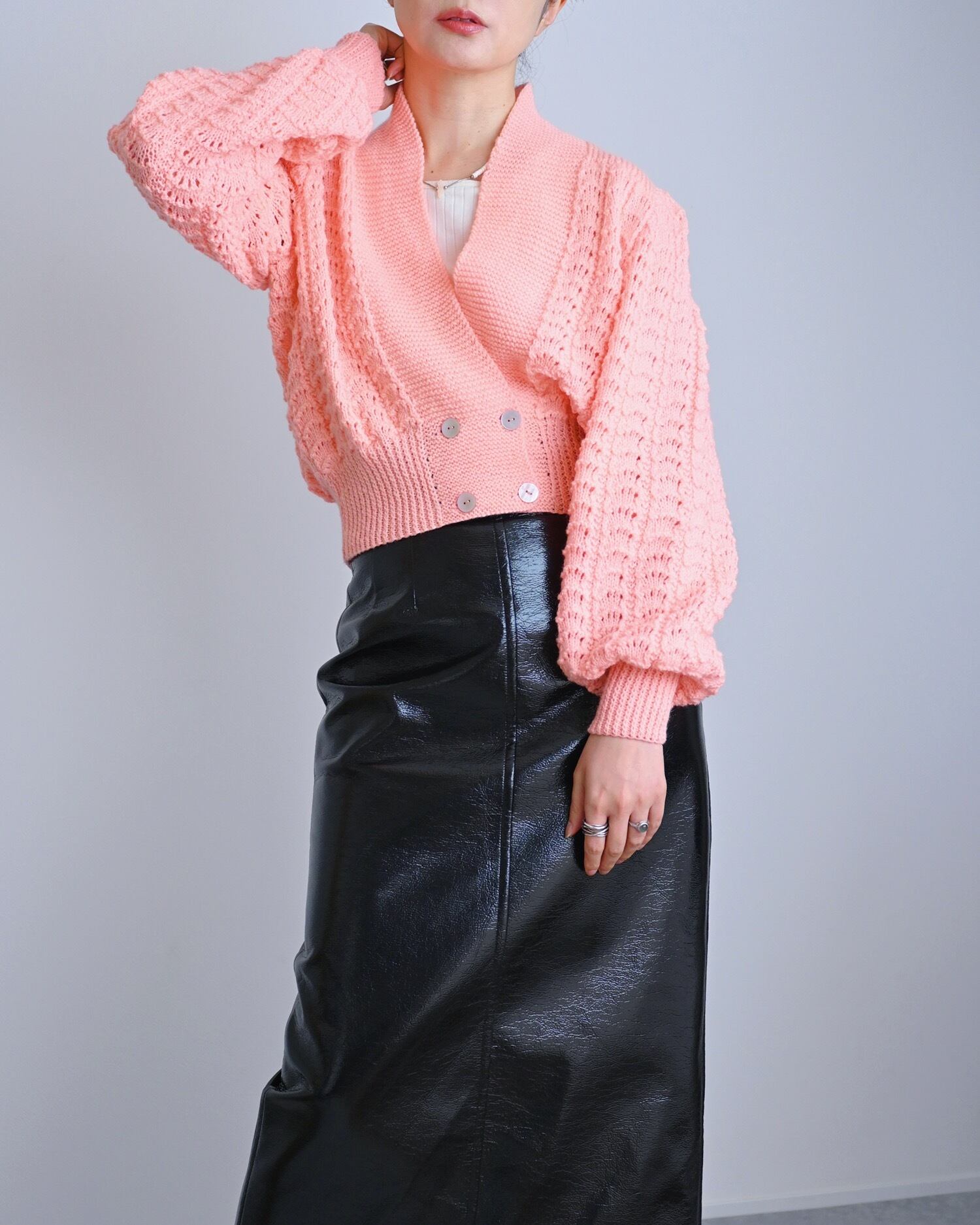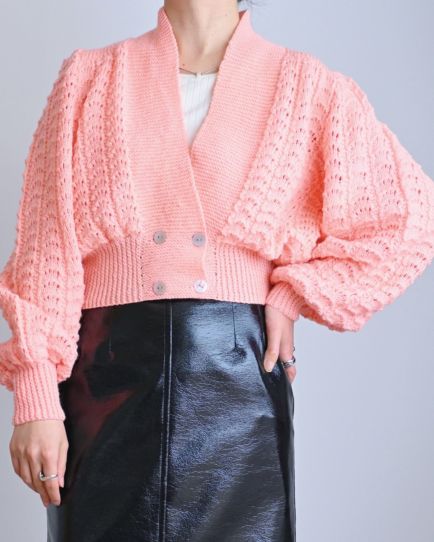 桜色のパフスリーブニット。今の時期にぴったりなアイテムです。透け感のある編み柄が可愛い。