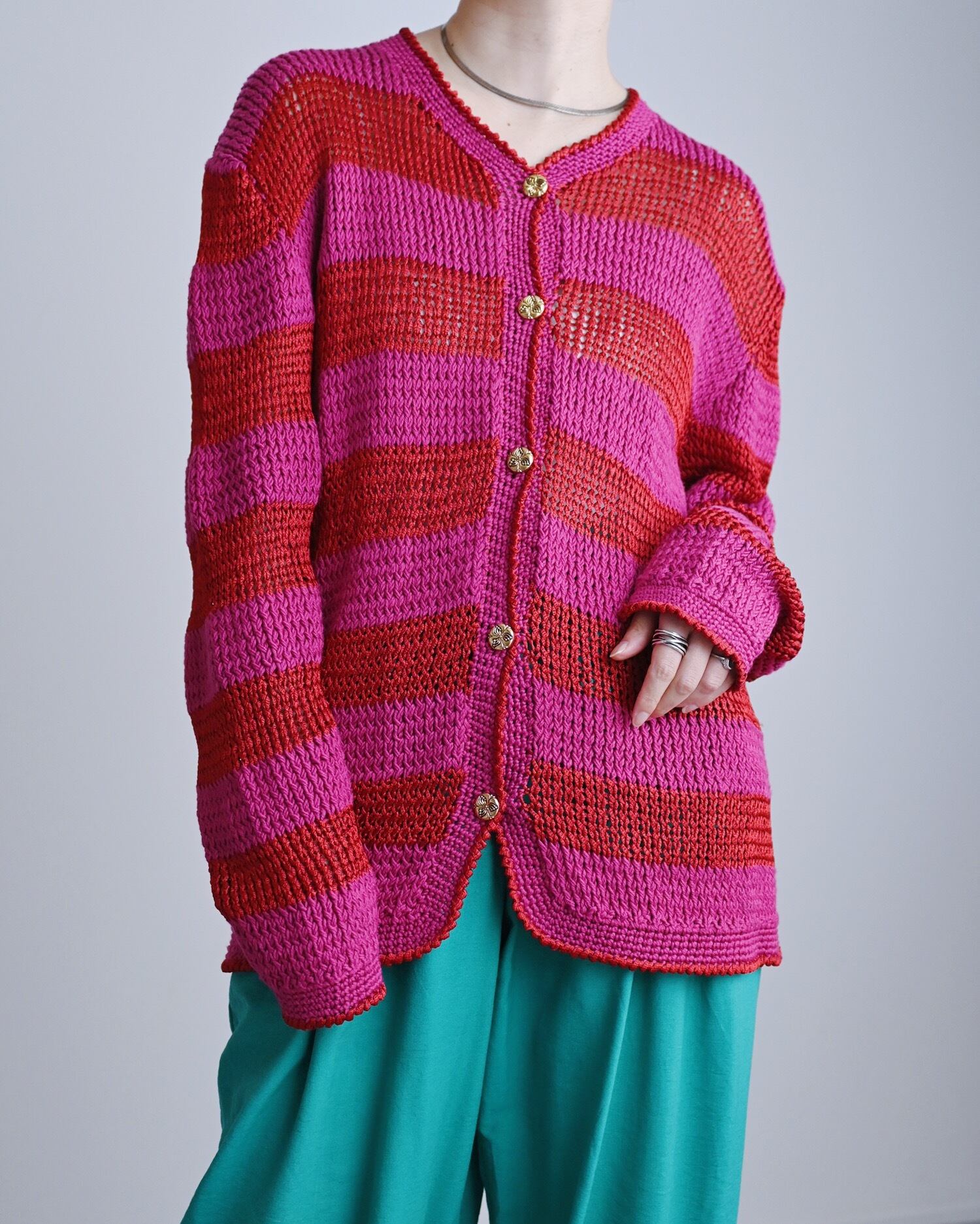 ピンクとレッドの組み合わせが最高に可愛いボーダーニット。ざっくりとした編み地で若干透け感があります。