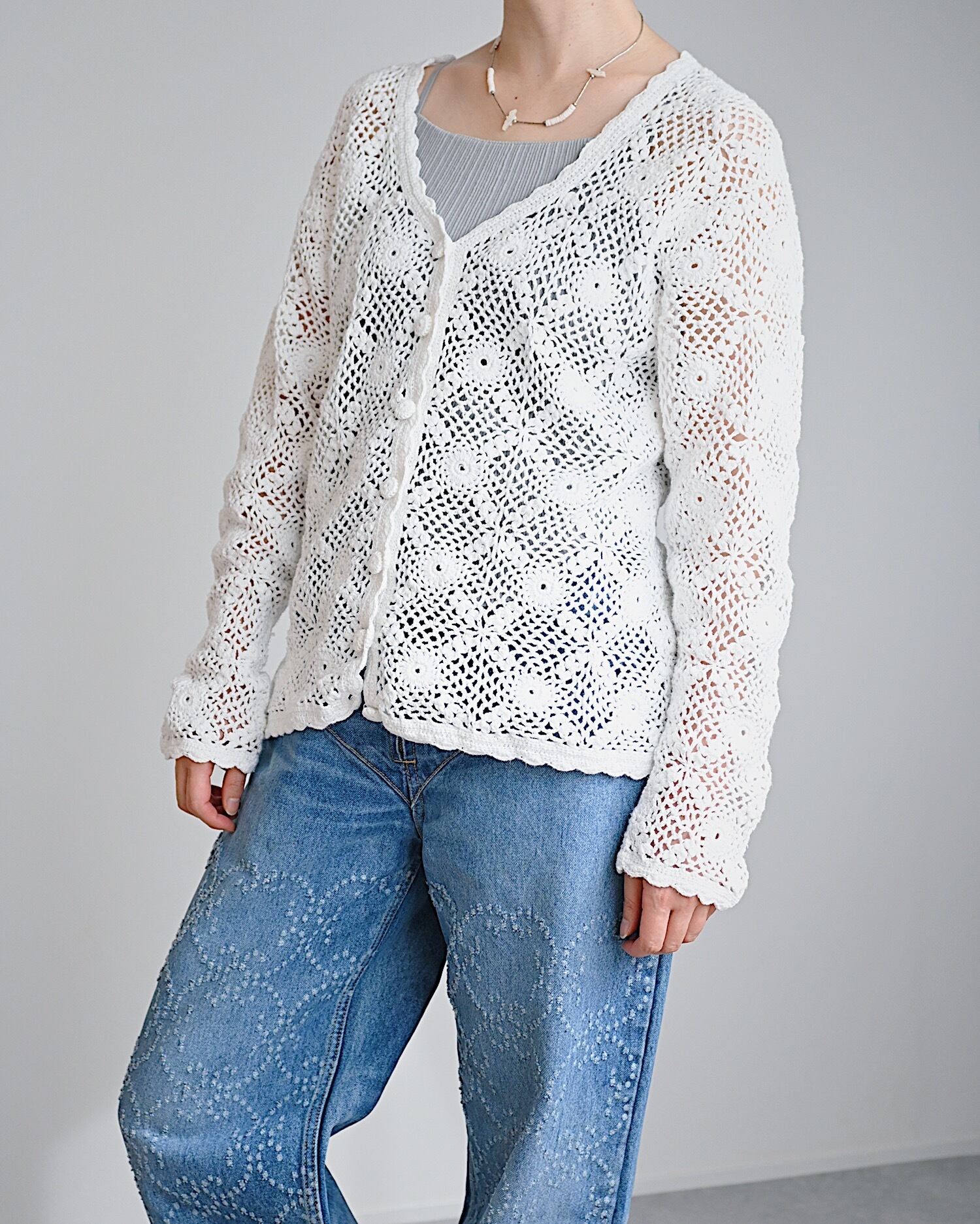 ホワイトクロシェカーディガン。袖口や裾のスカラップデザインがたまらない可愛さ。混率不明ですが恐らくコットンなので、レースほどガーリーになり過ぎずカジュアルに着て頂けます。