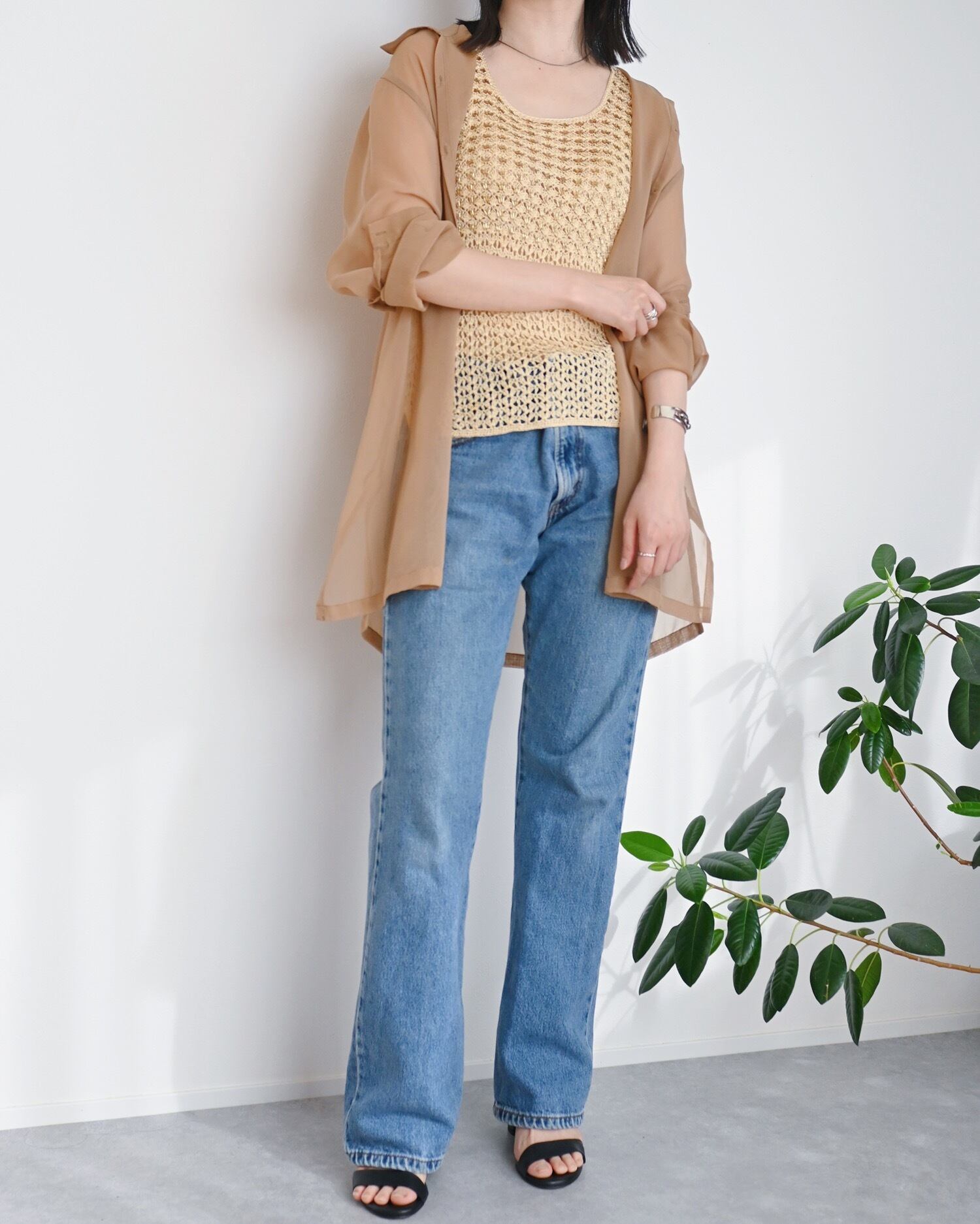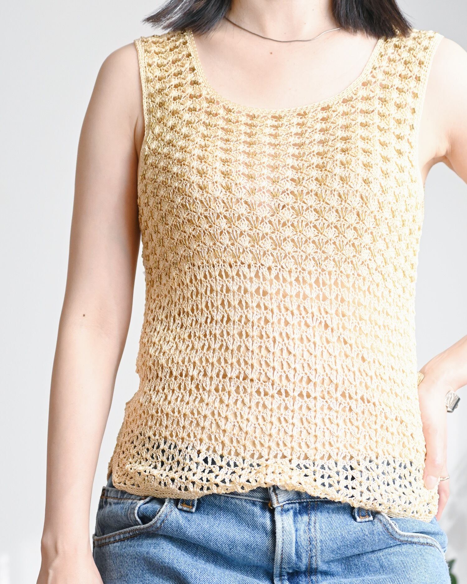 イエローのクロシェタンクトップ。