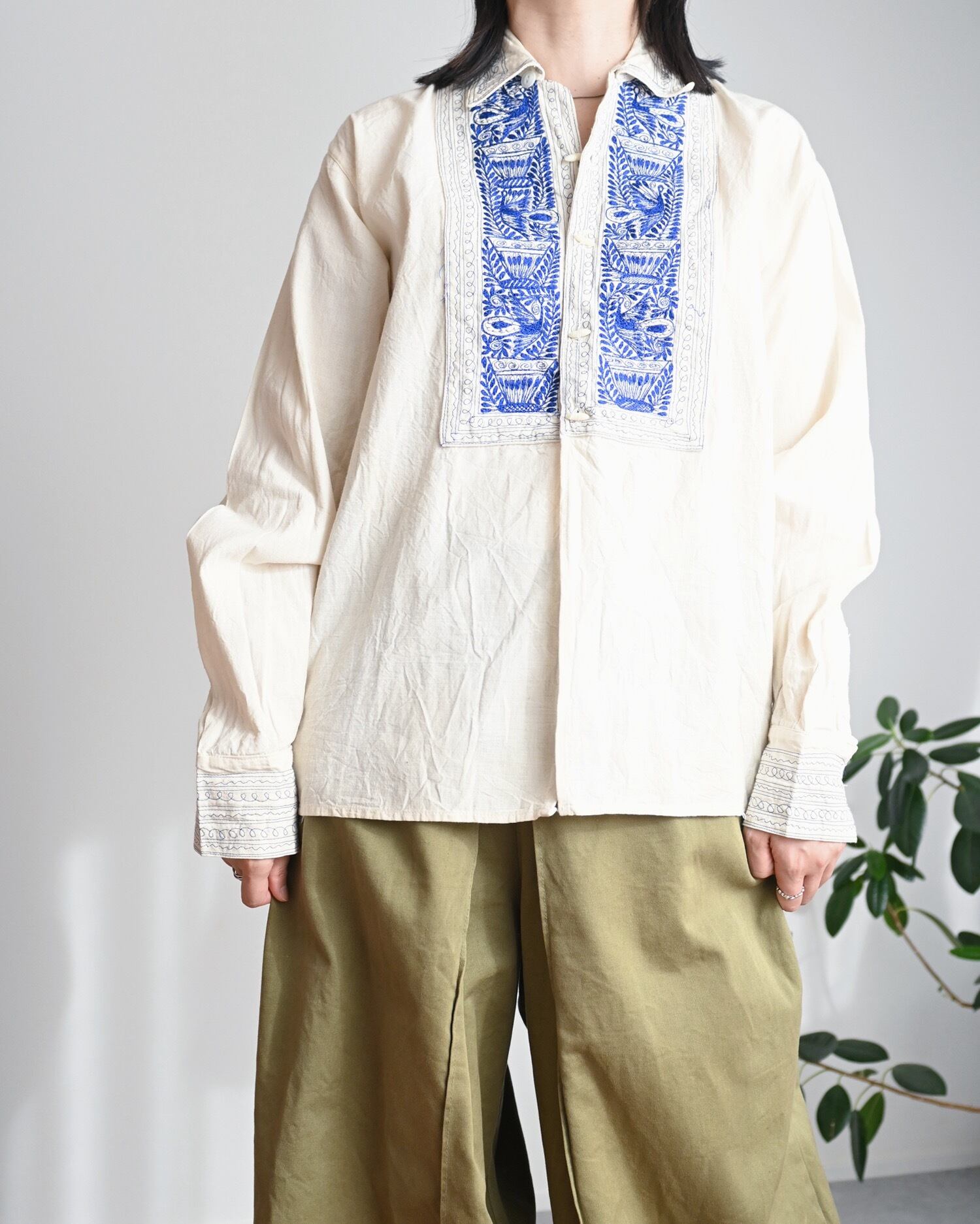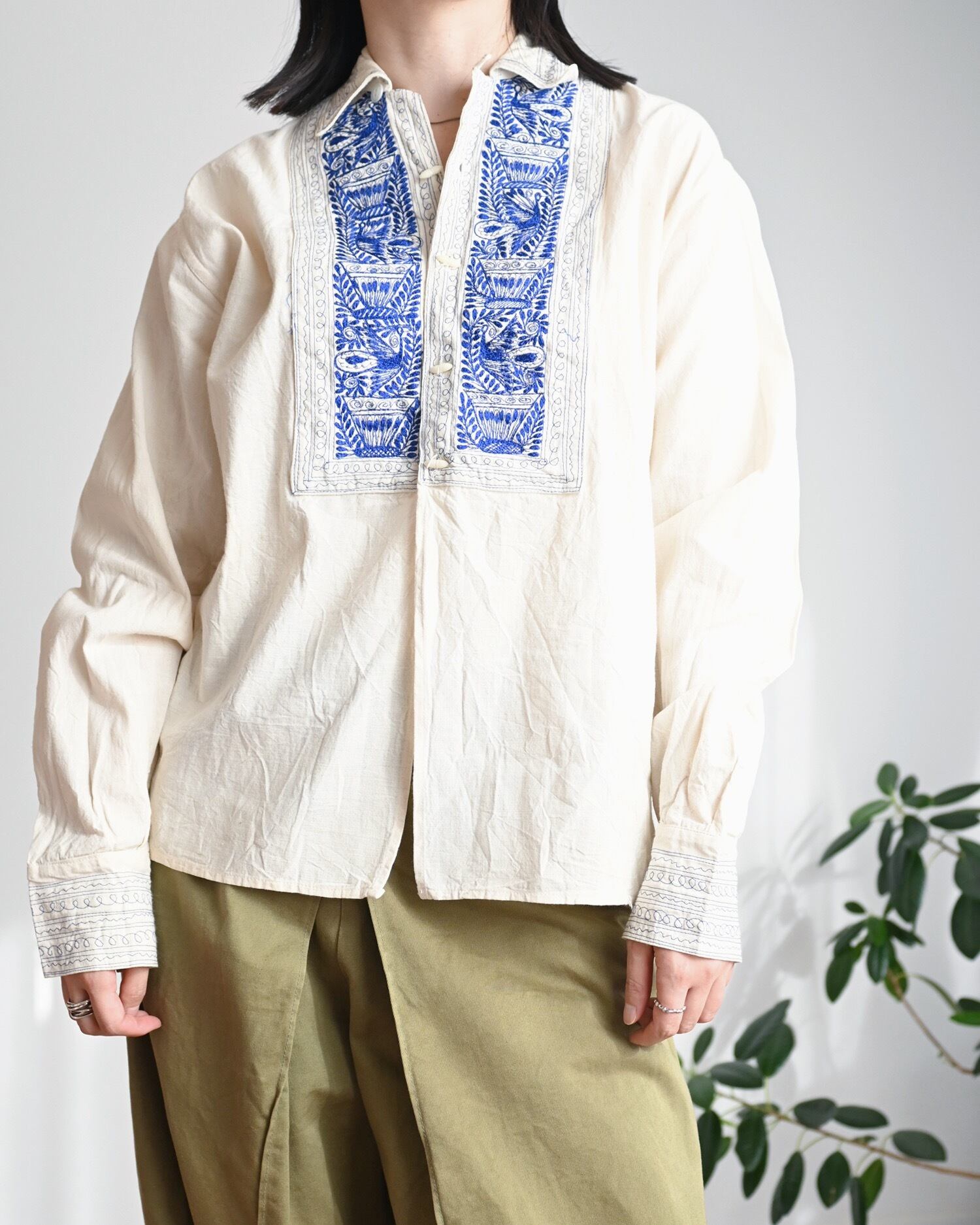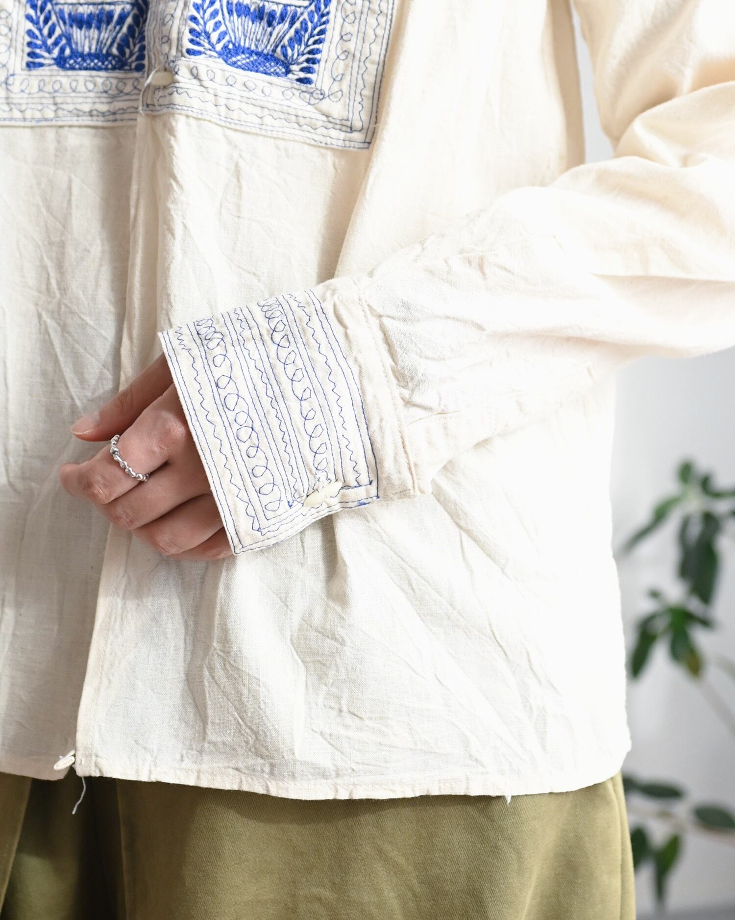 生成りの生地に鮮やかなブルーが映えます。ややハリのある生地ですが着ていくごとに味が出る素材だと思います。洗いざらしのシワを楽しんで欲しいシャツです。
