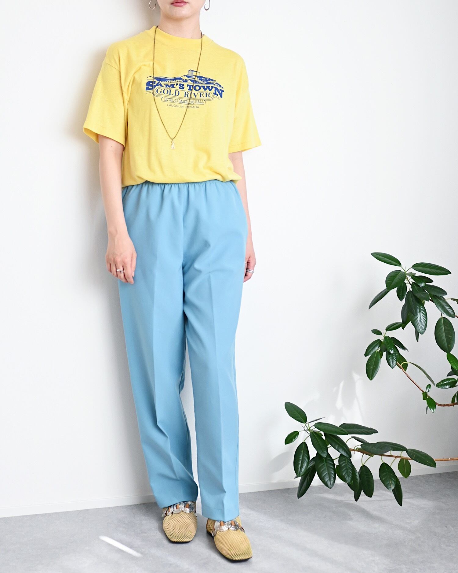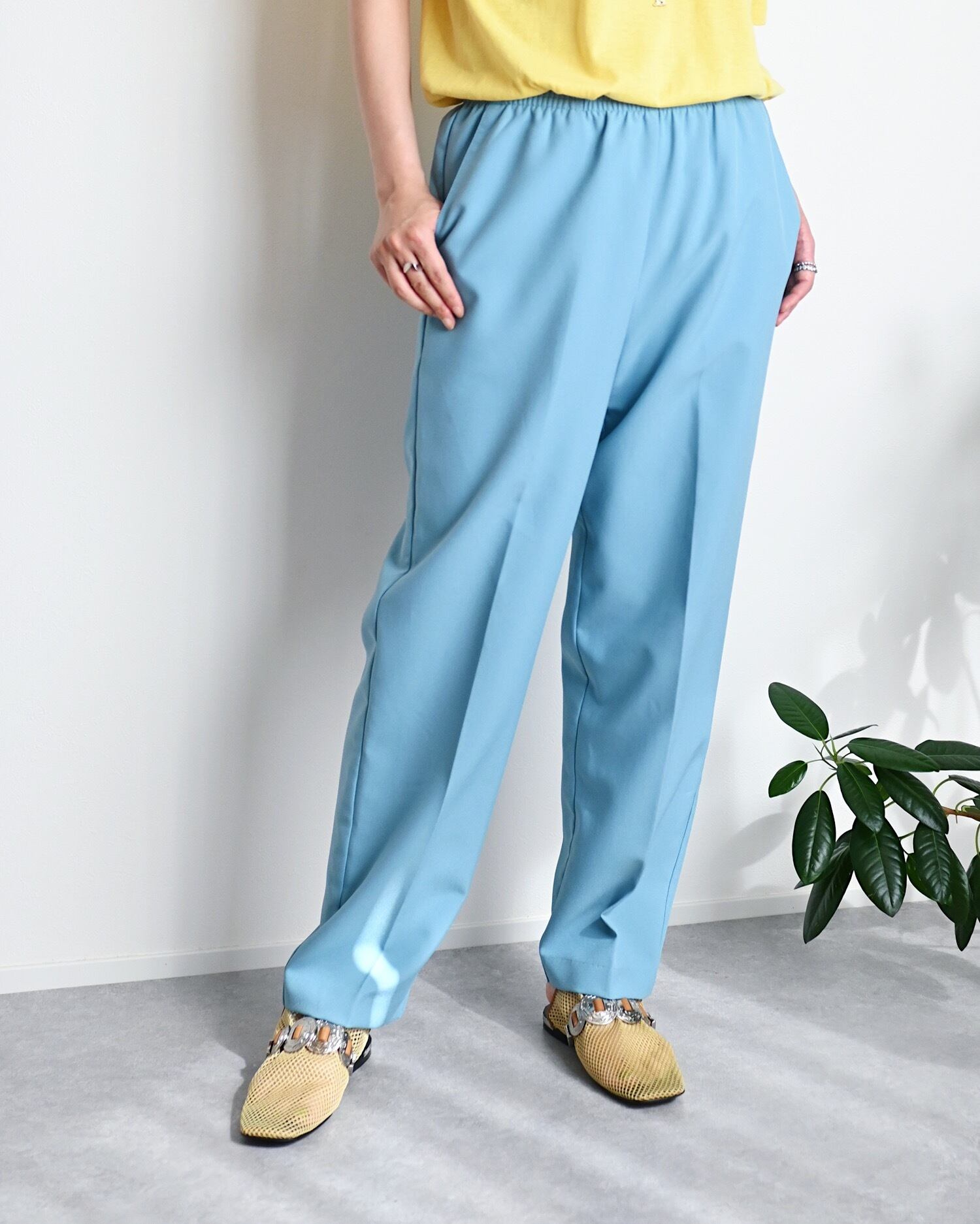 サックスブルーが爽やかなイージーパンツ。ウエストゴムで楽ちんです。