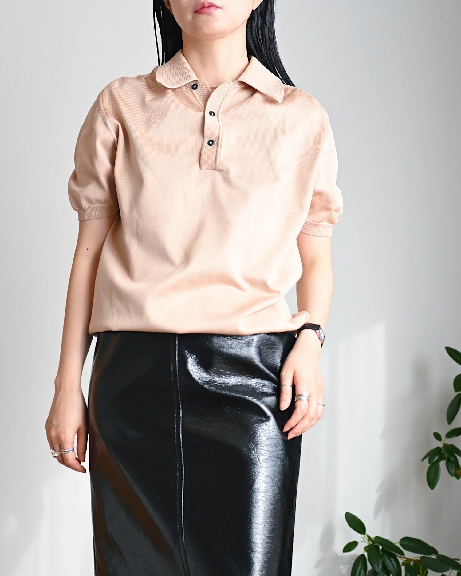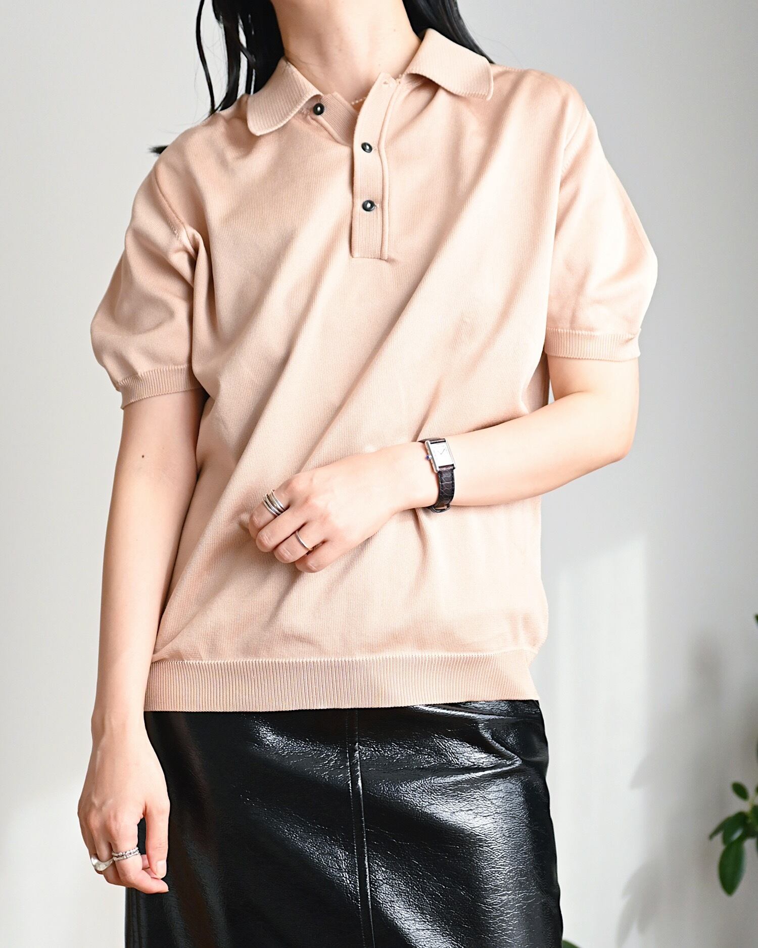 ベージュイエローのニットポロ。カットソーのポロシャツとは違い、綺麗めな雰囲気です。