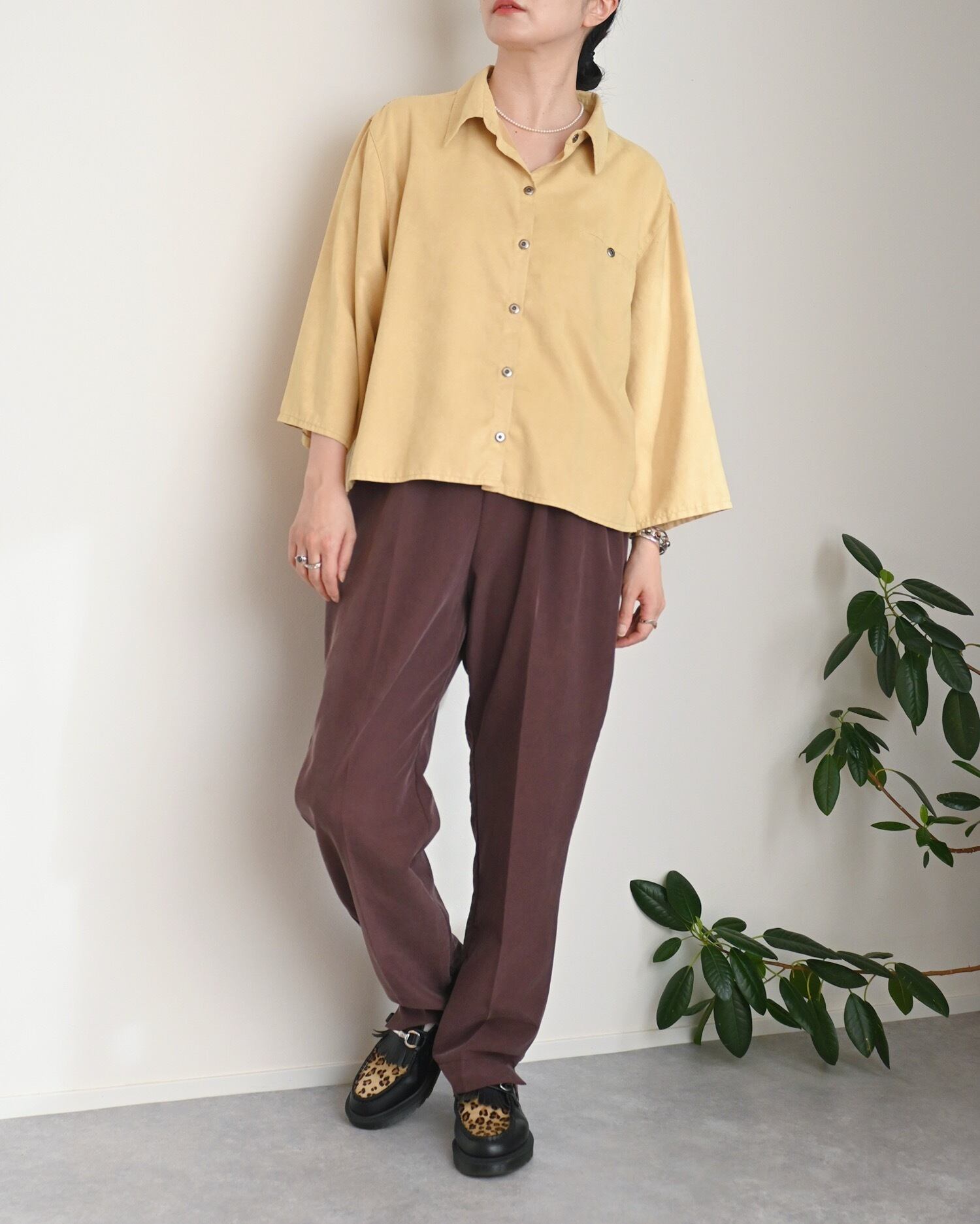 柔らかなスウェードタッチで秋冬シーズンにぴったりのシャツです。明るいイエローカラーがスタイリングに華やかさをプラスしてくれます。7分丈の袖は、季節の変わり目にも活躍します。