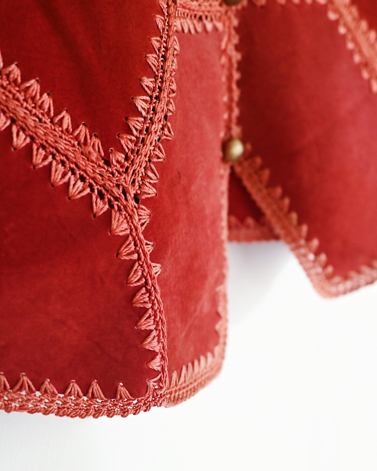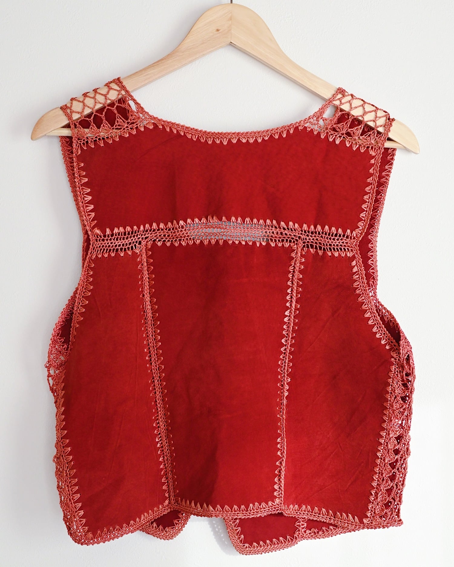 落ち着いたレッドカラーのパッチワークベスト。柔らかなスウェードレザー素材です。