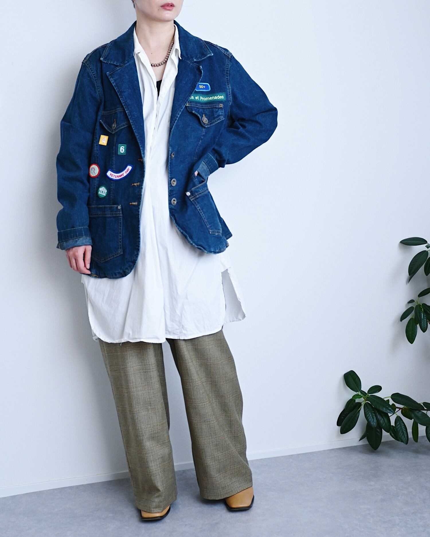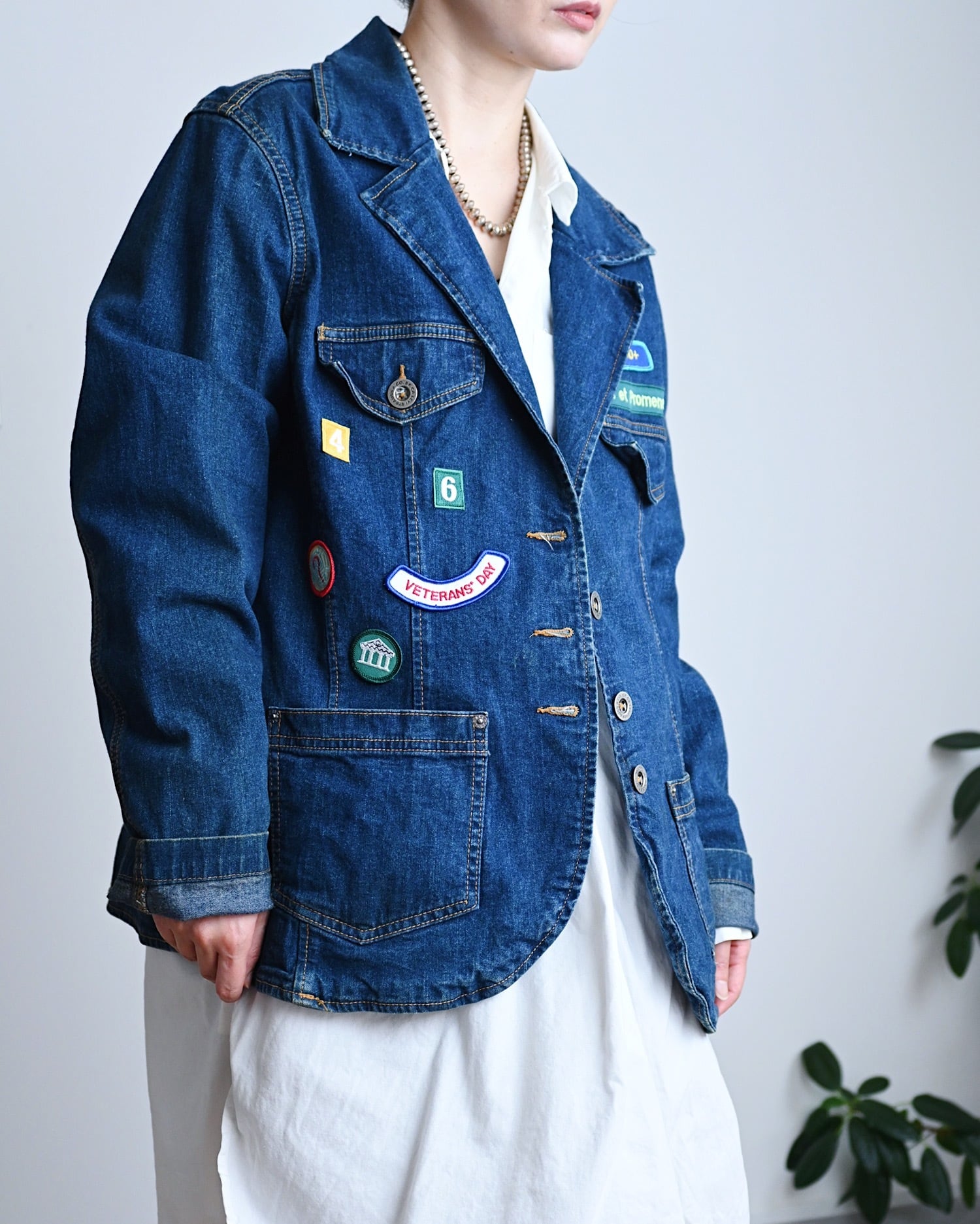 ワッペンリメイクしたリーバイスデニムジャケット。カラフルなワッペンがハッピーな雰囲気です。ややストレッチ性のあるデニム生地になります。