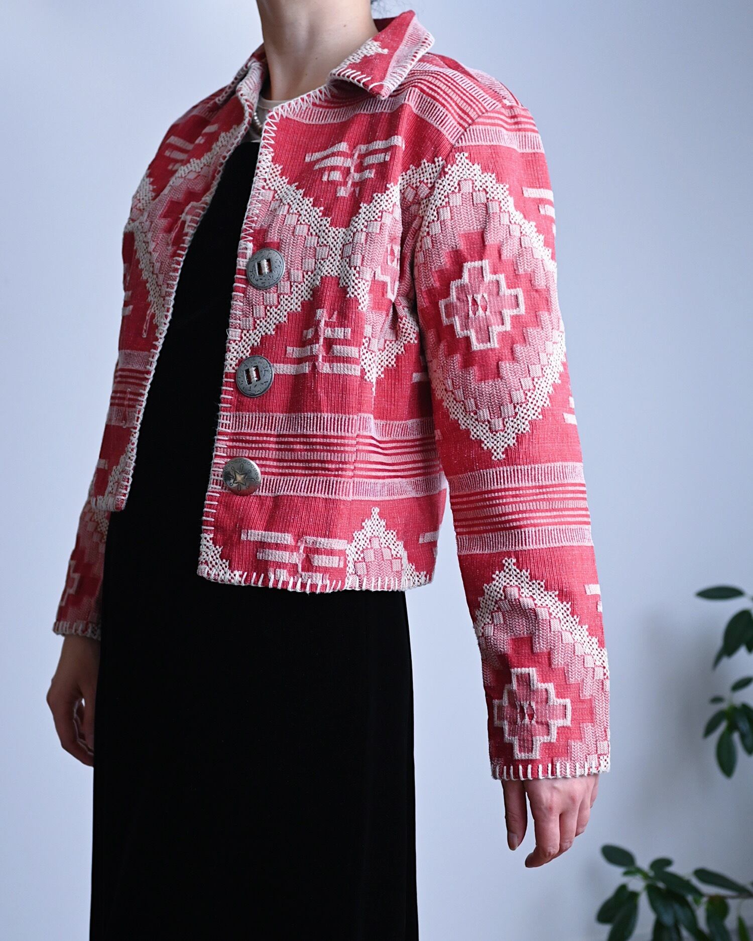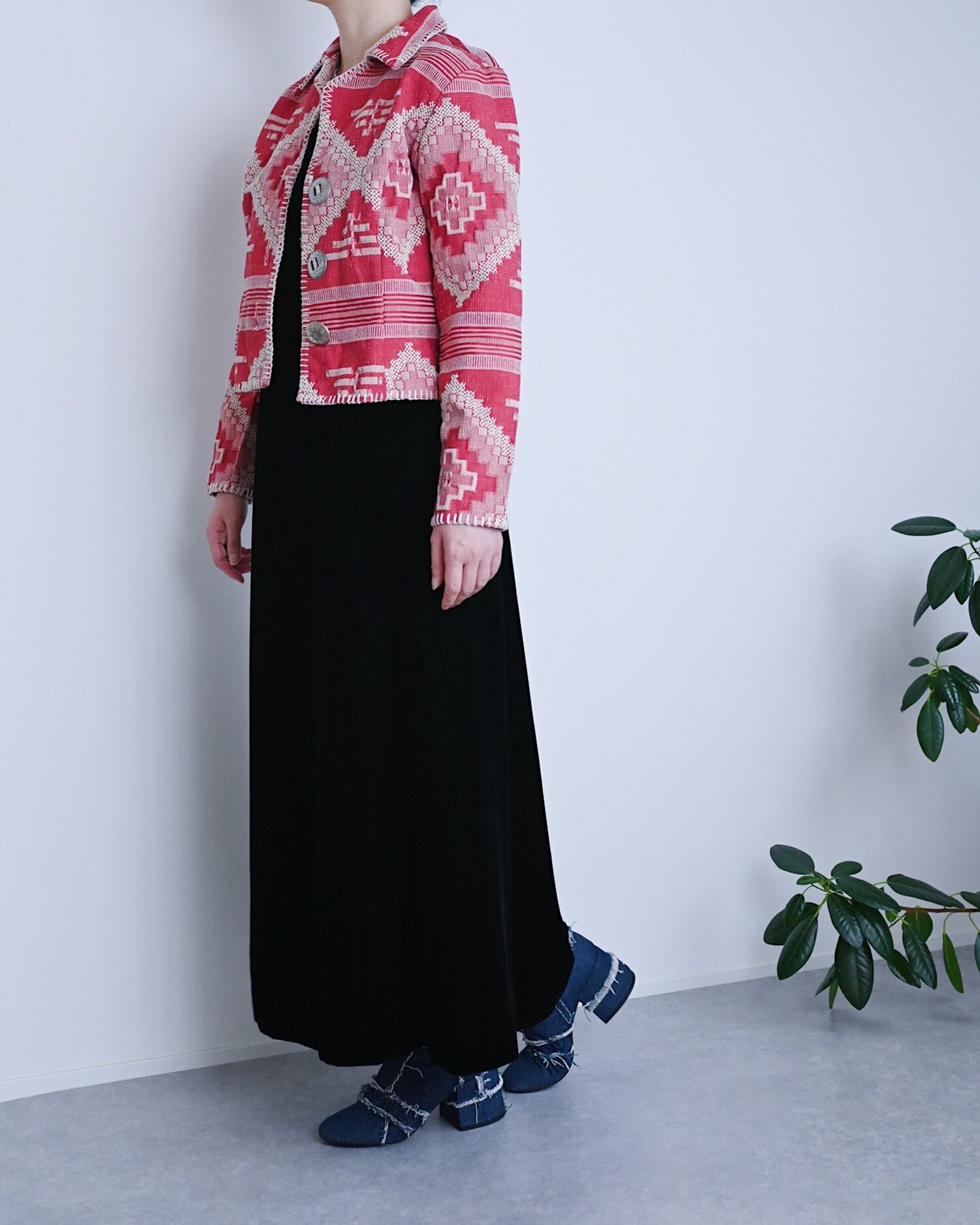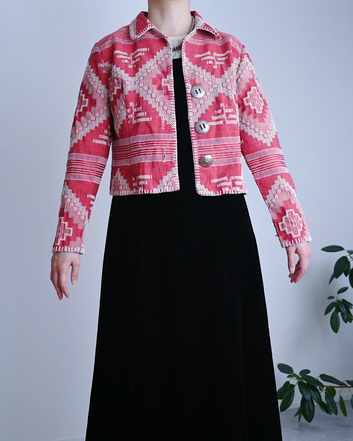 ネイティブパターンのジャガードジャケット。ショート丈なのでワイドボトムやスカート、ワンピースなどとの相性が良くスタイリングし易いです。